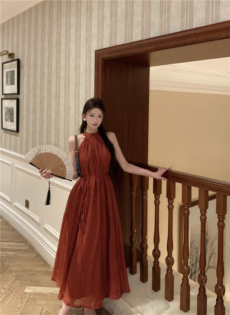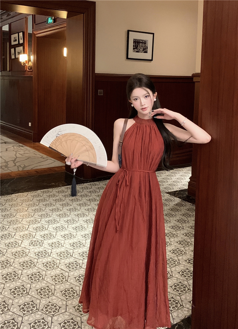 실사 여름 새로운 화이트 플리츠 쉬폰 슬립 드레스 롱 코트 품격 허리 수축 대 치마 요정 치마