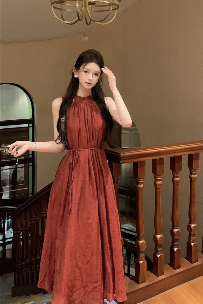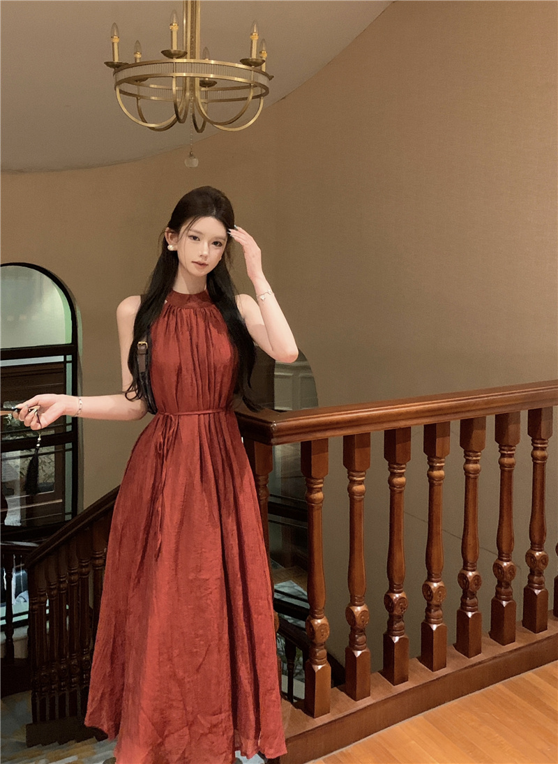 실사 우아한 똑똑한 루즈핏 느긋한 편안함 행침 목 치마 아이들 여름 프랑스식 민소매 허리 수축 스트랩 드레스