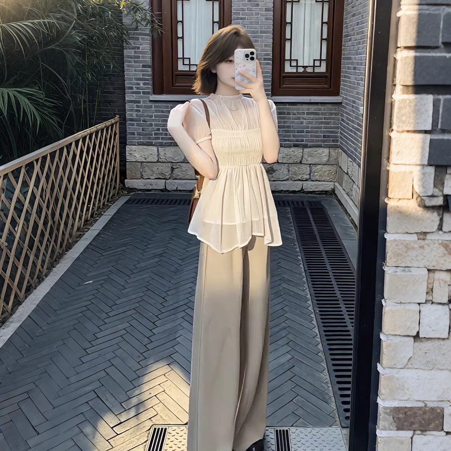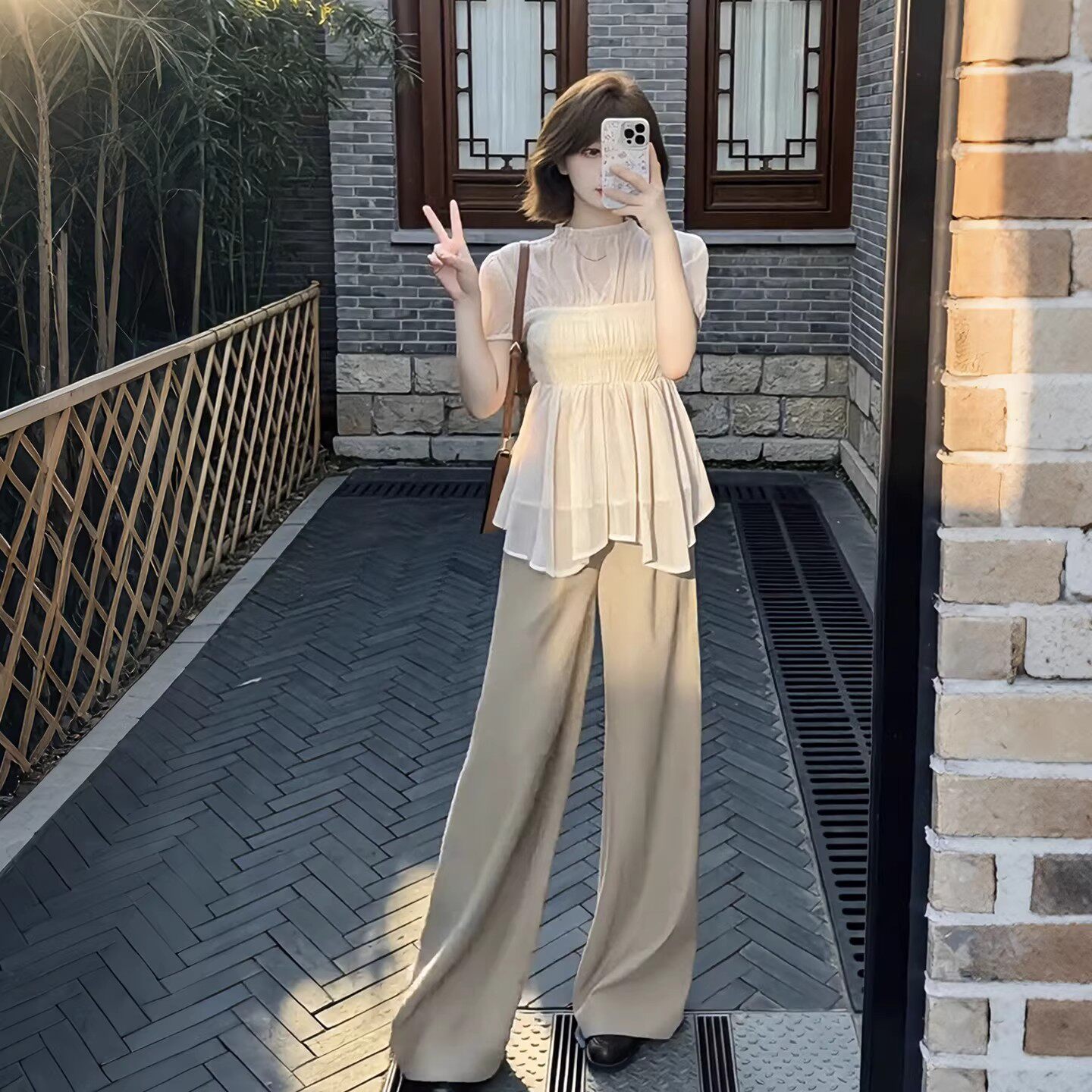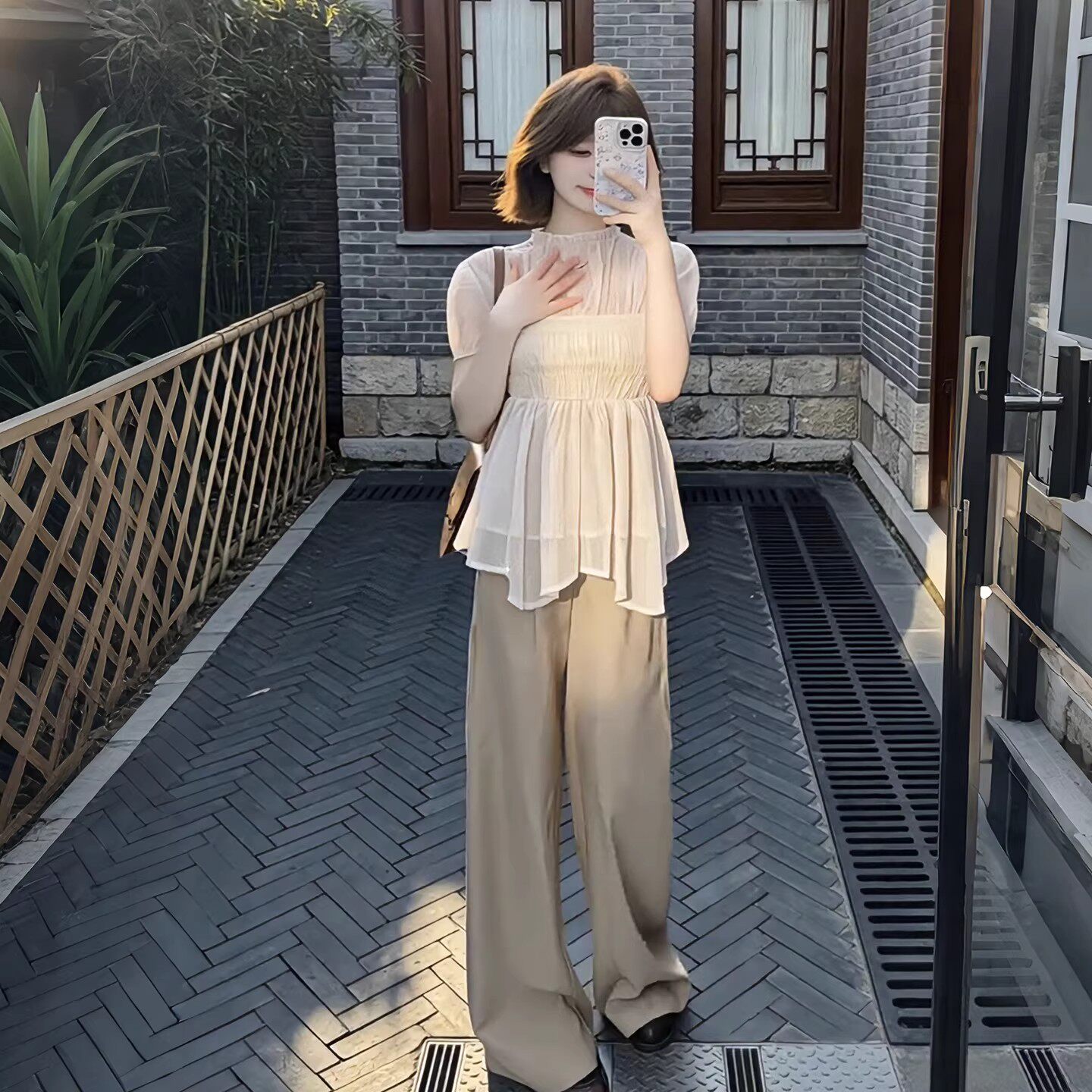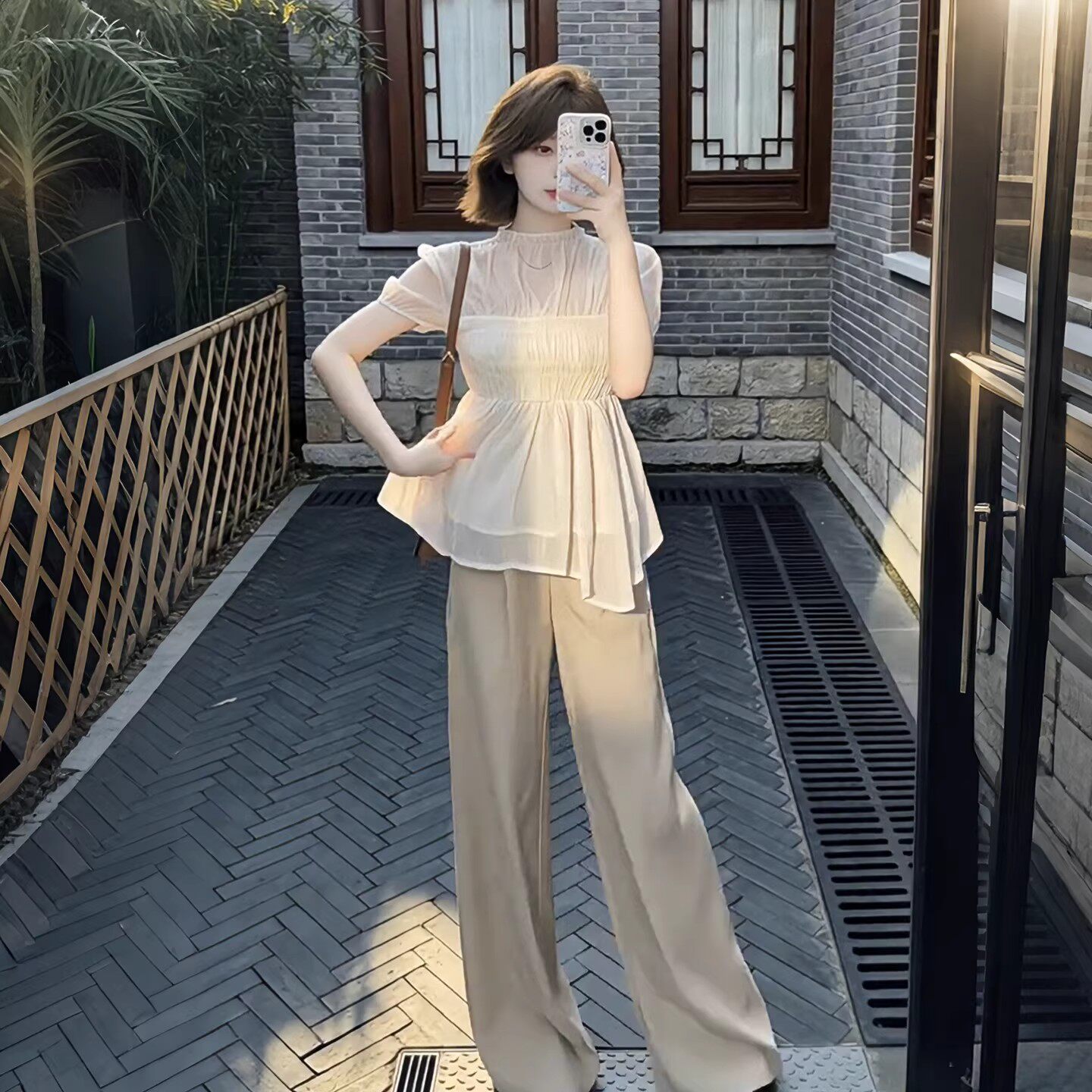 여름 착용 가져 가라. 전체 집합 빅 사이즈 지방 mm 쉬폰 블라우스 맨위 와이드 레그 팬츠 빛 사람들 코치 달콤함 투피스 슈트 여성