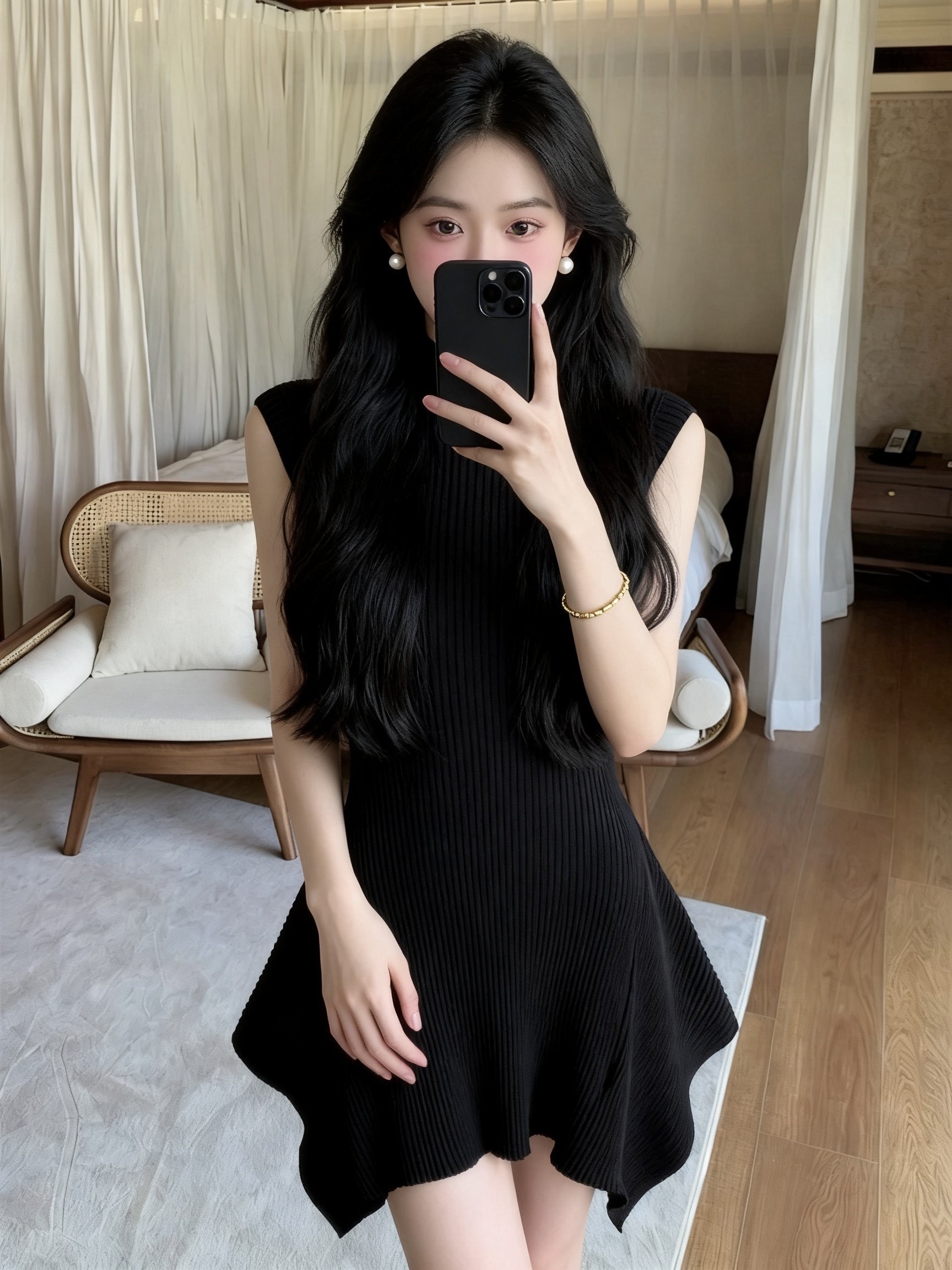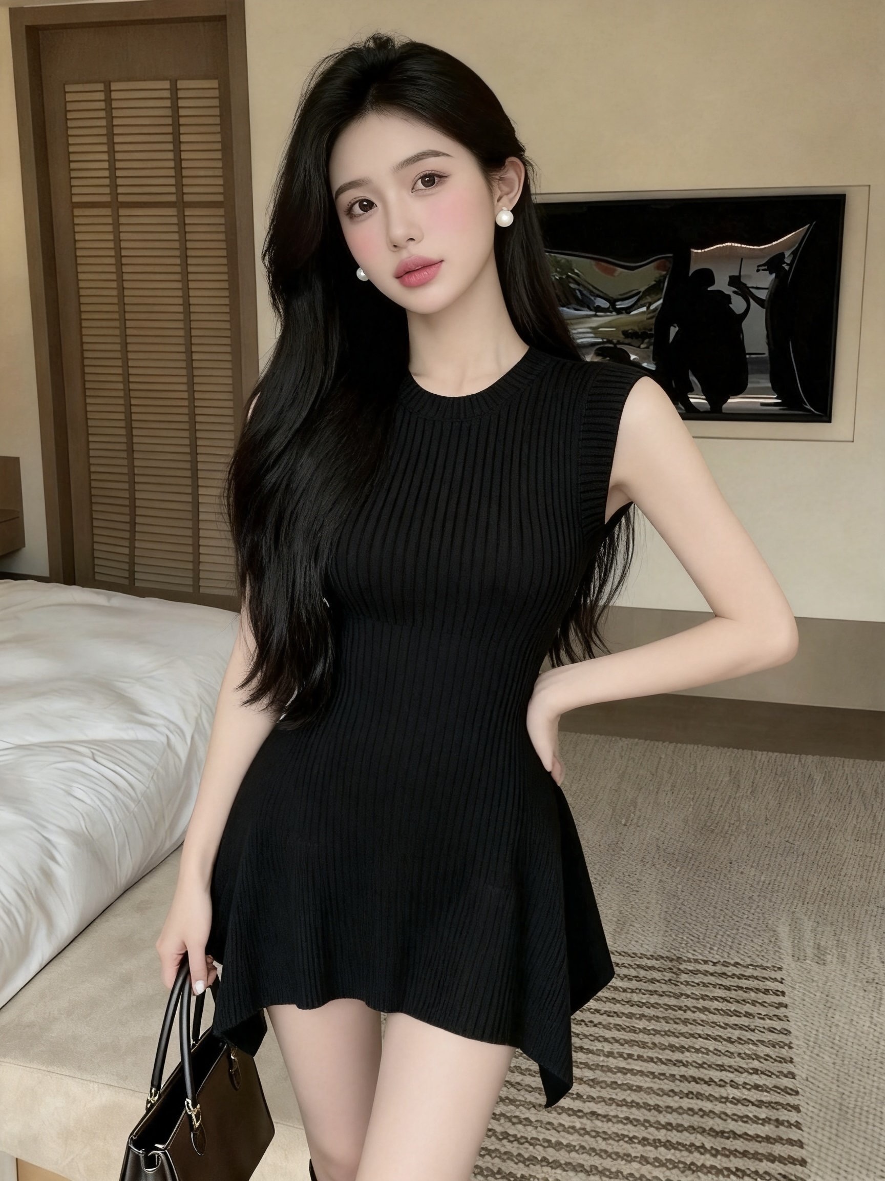 실사 정가 불규칙 민소매 한 부서 허리 수축 슬림해 보이는 니트 조끼 원피스