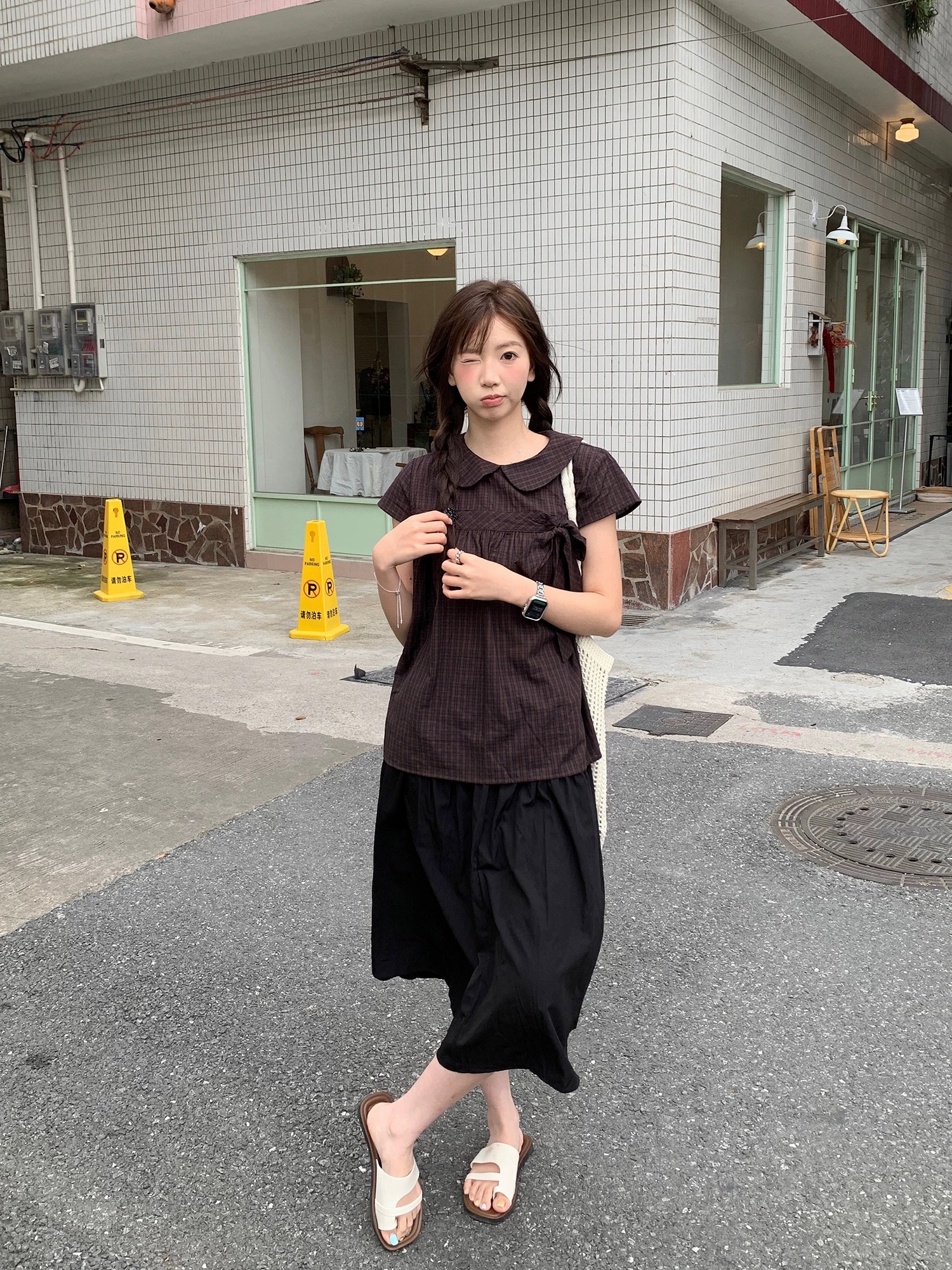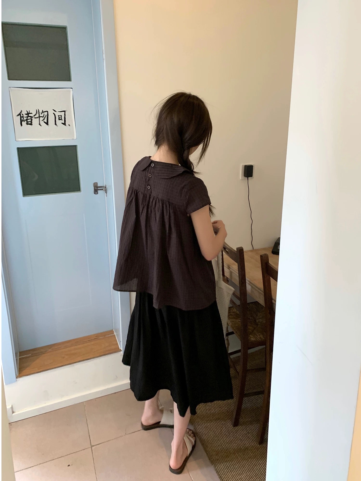 프랑스식 검정색 고급 센스 거품 소매 광장 칼라 셔츠 반팔 도트 무늬 레이스 퍼프 케이크 반신 스커트 투피스 세트