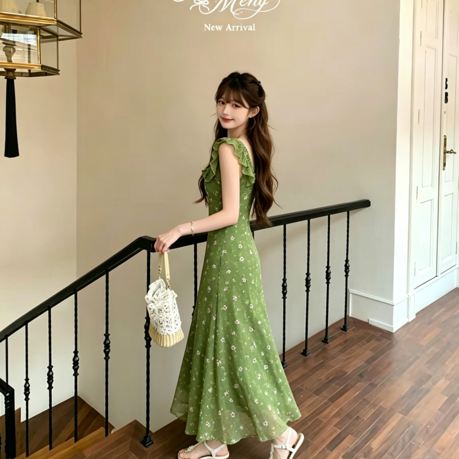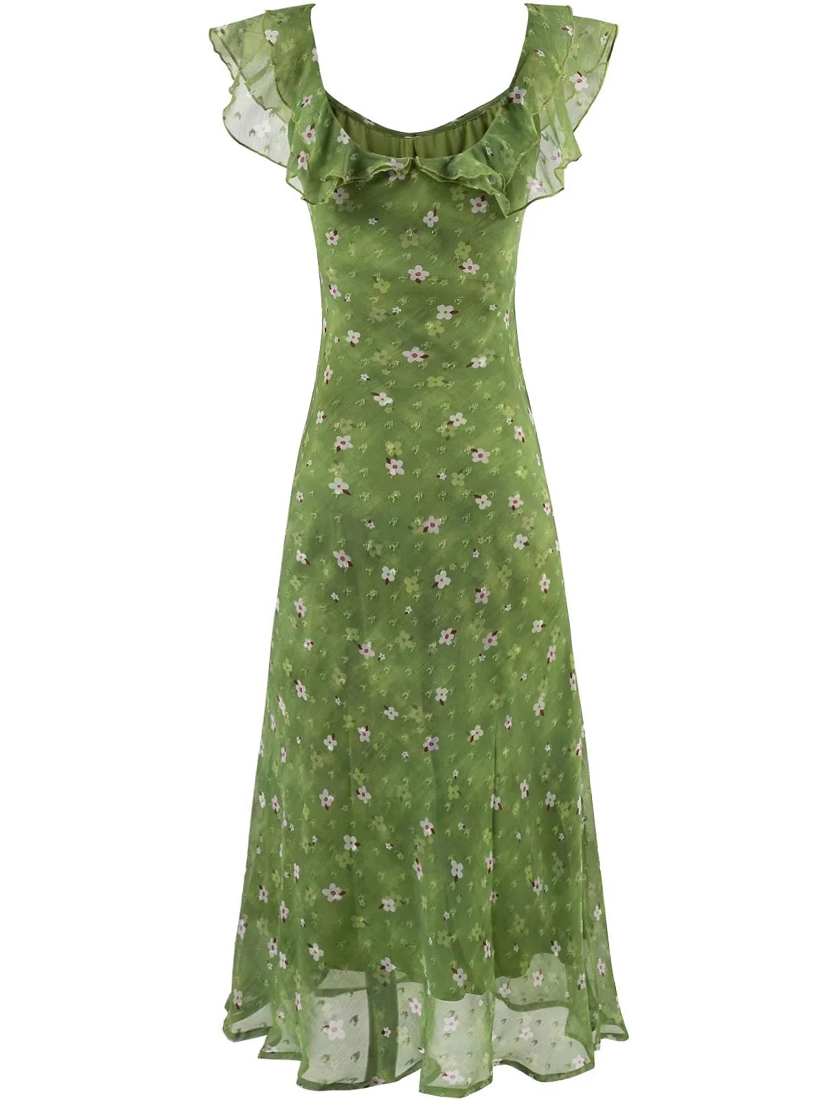 2026 프랑스식 레트로 꽃무늬 녹색 작은 날다 소매 드레스 2026 여름 새로운 휴가 바람 롱 스커트