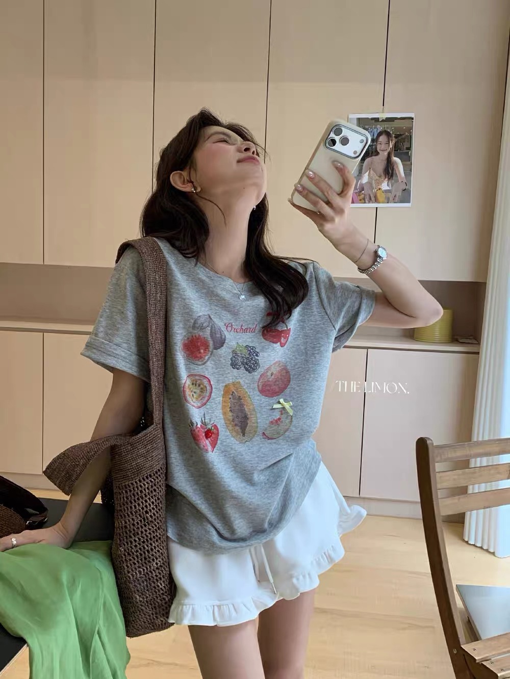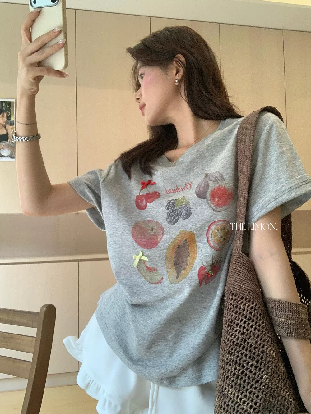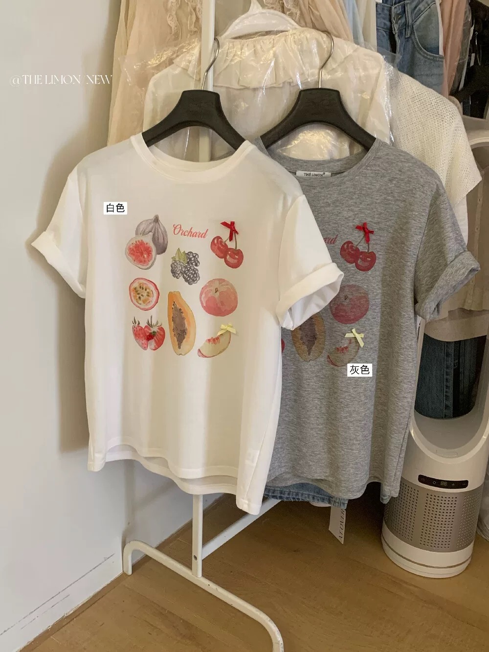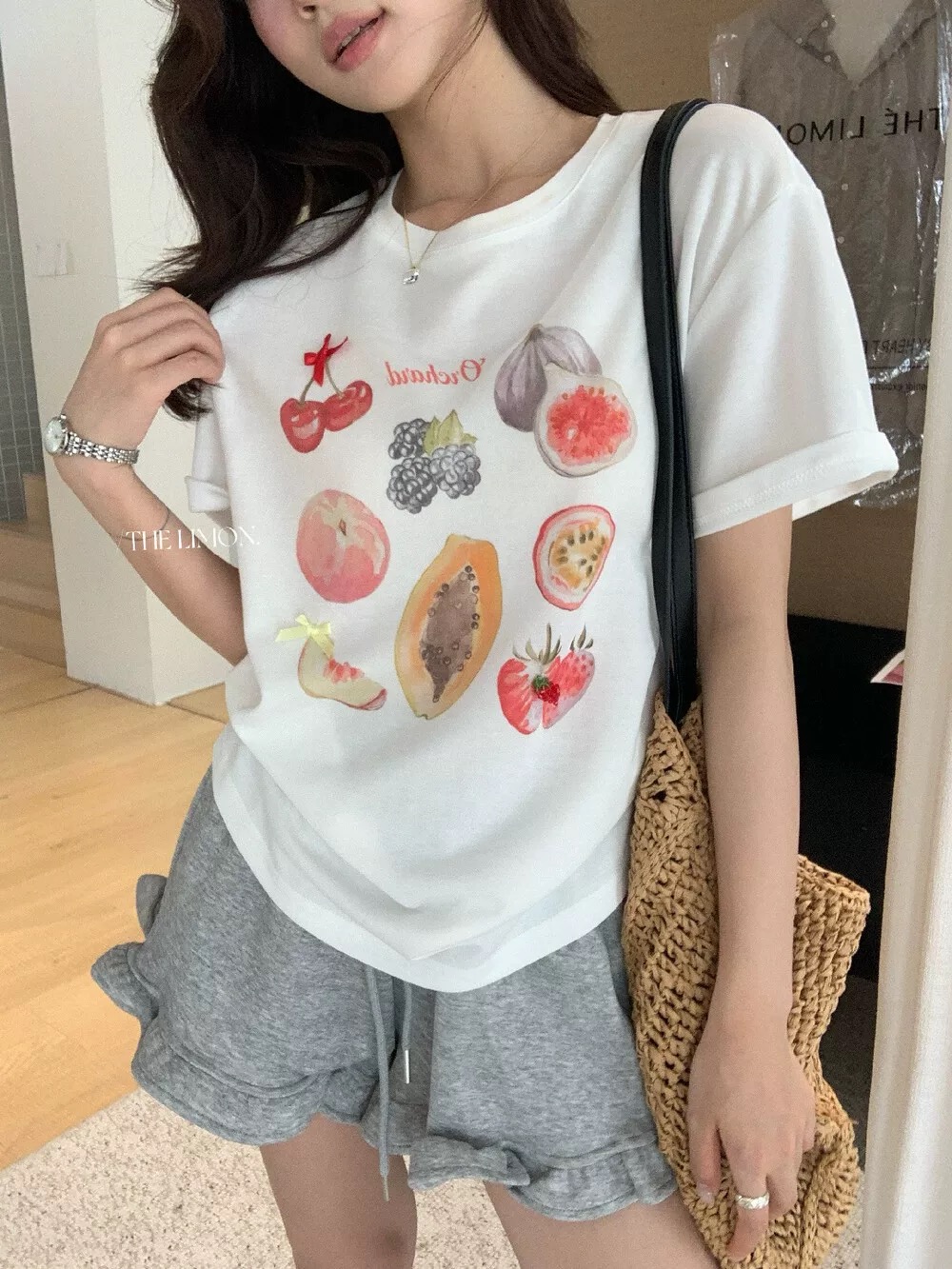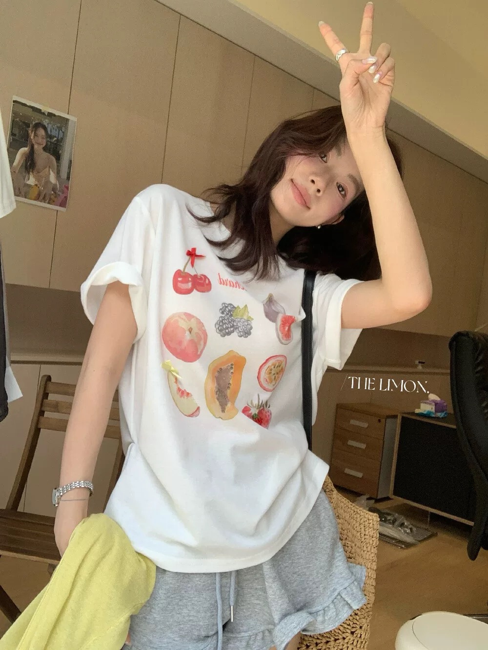 재미있는 과일 프린트 반팔 티셔츠 여성 20269 여름 새로운 상쾌 루즈핏 캐주얼 맨위