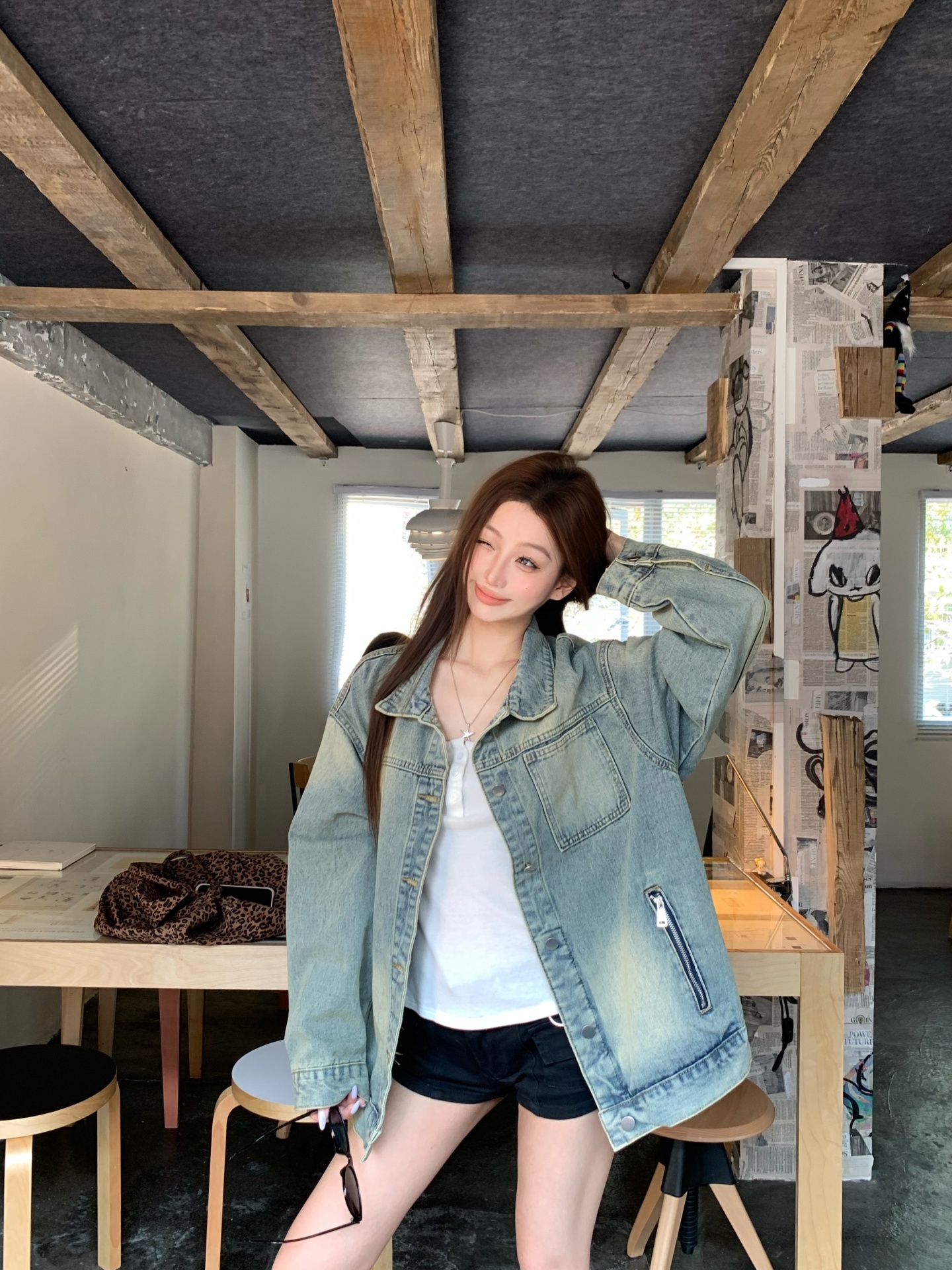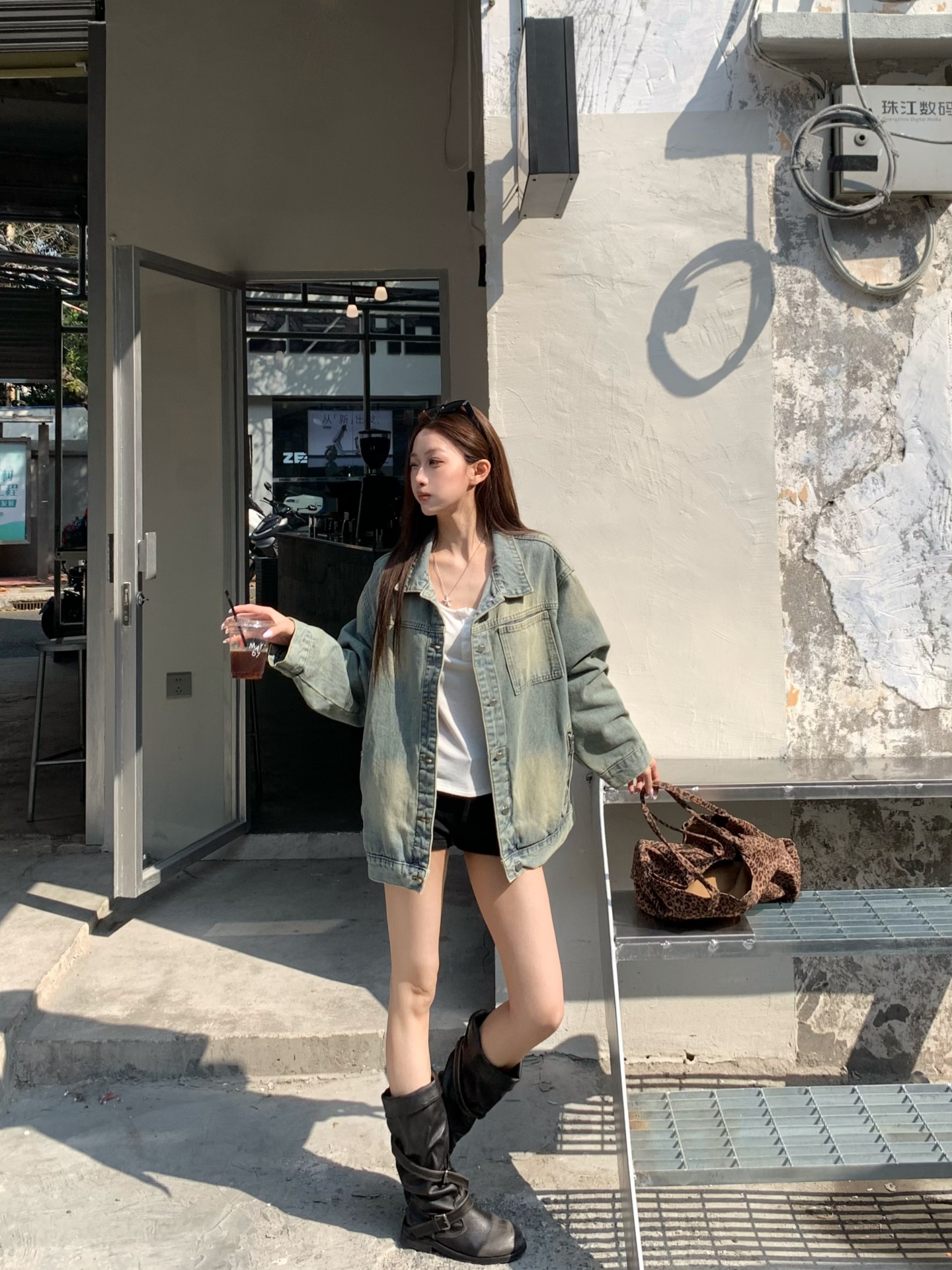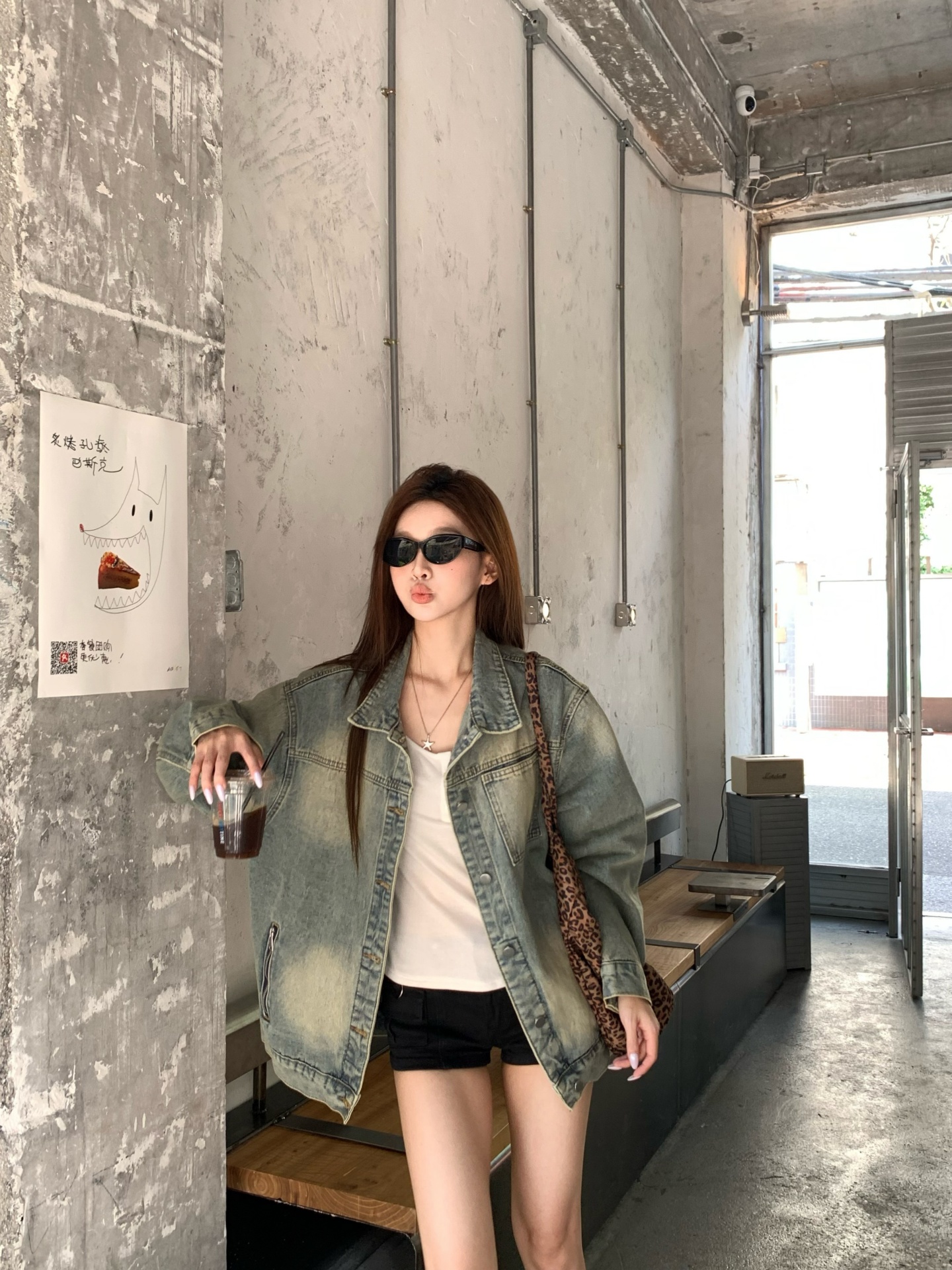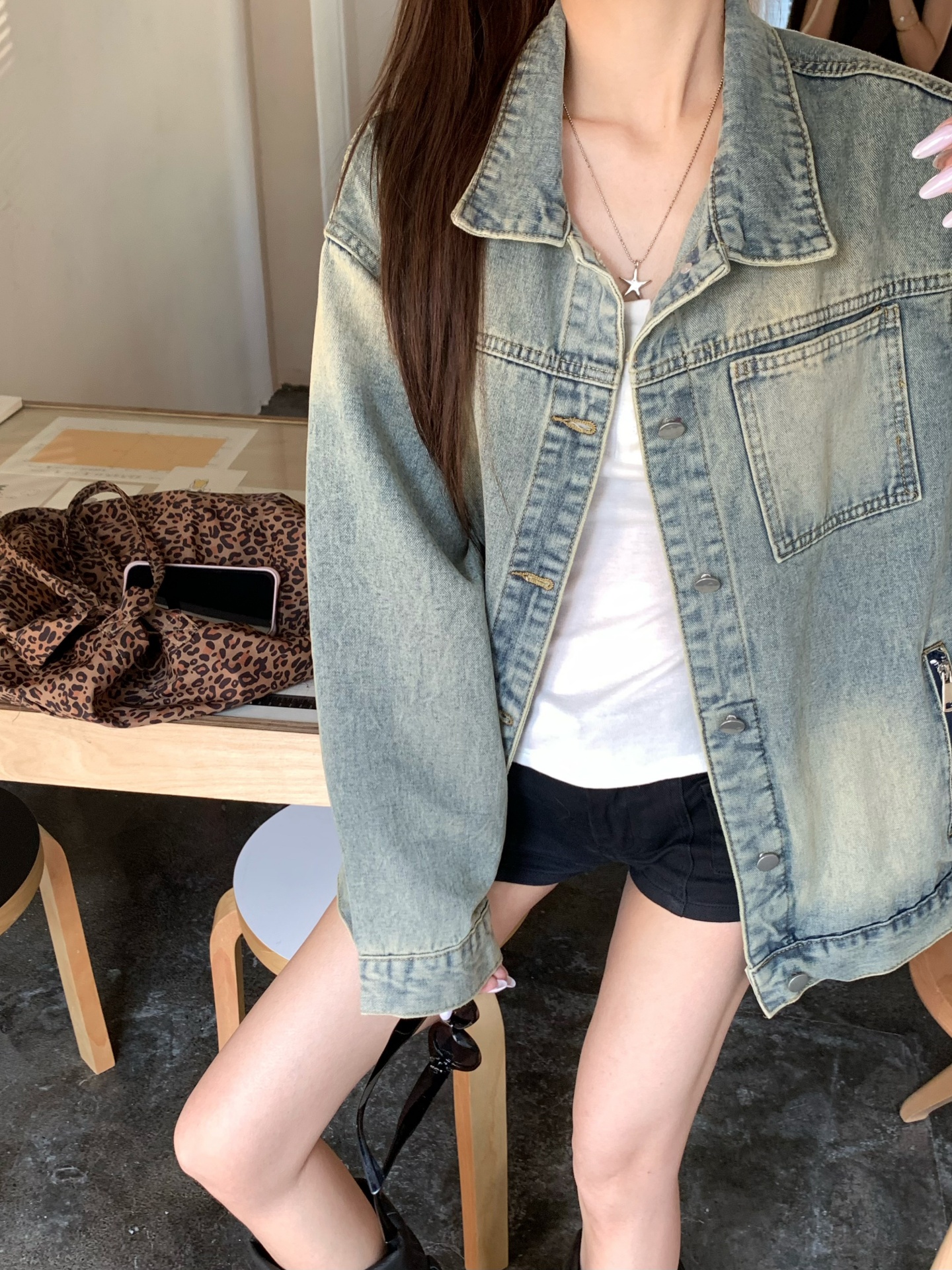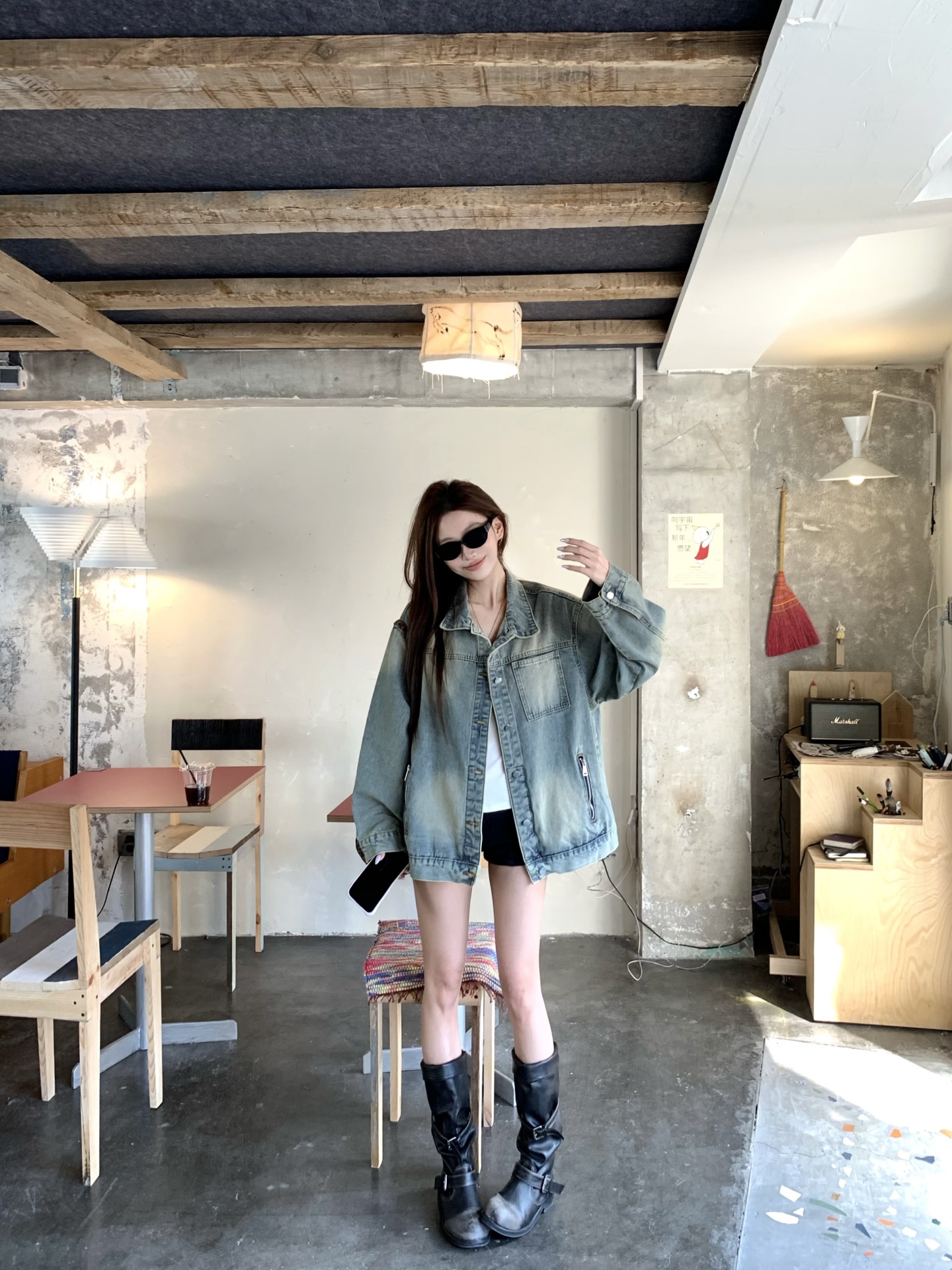 아메리칸 레트로 해체 질감 데님 재킷 루즈핏 프로필 모양 몸매 가꾸기 슬림해 보이는 워크웨어 재킷 여성