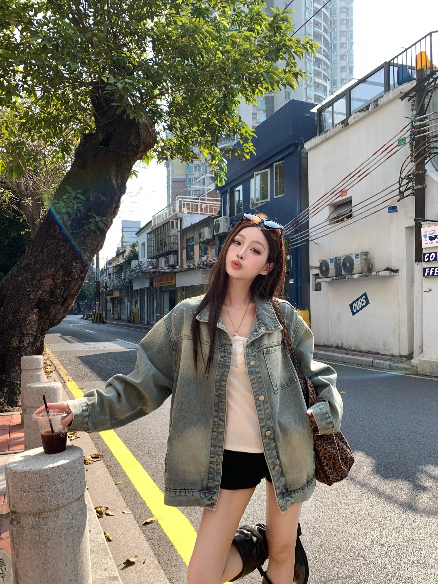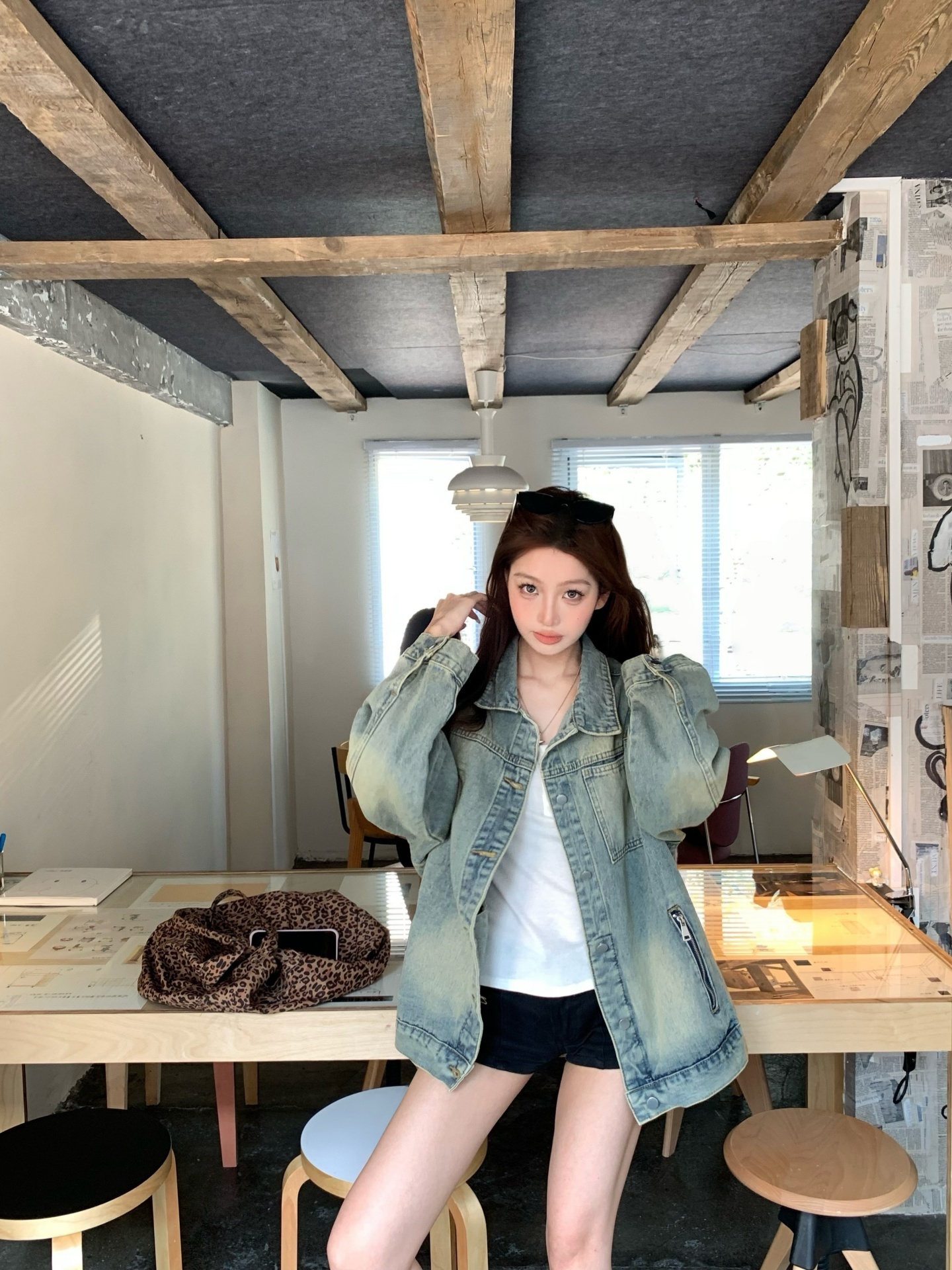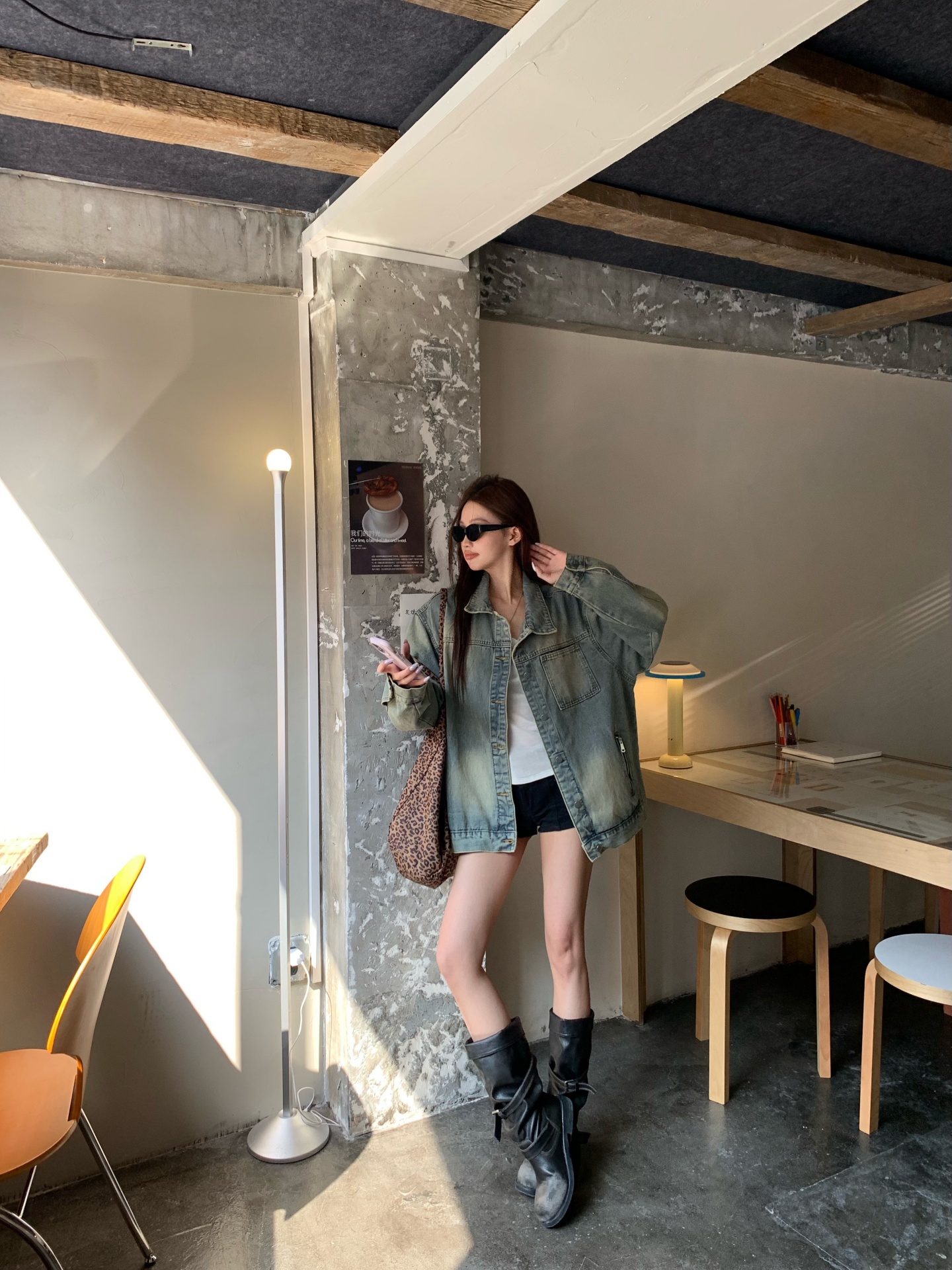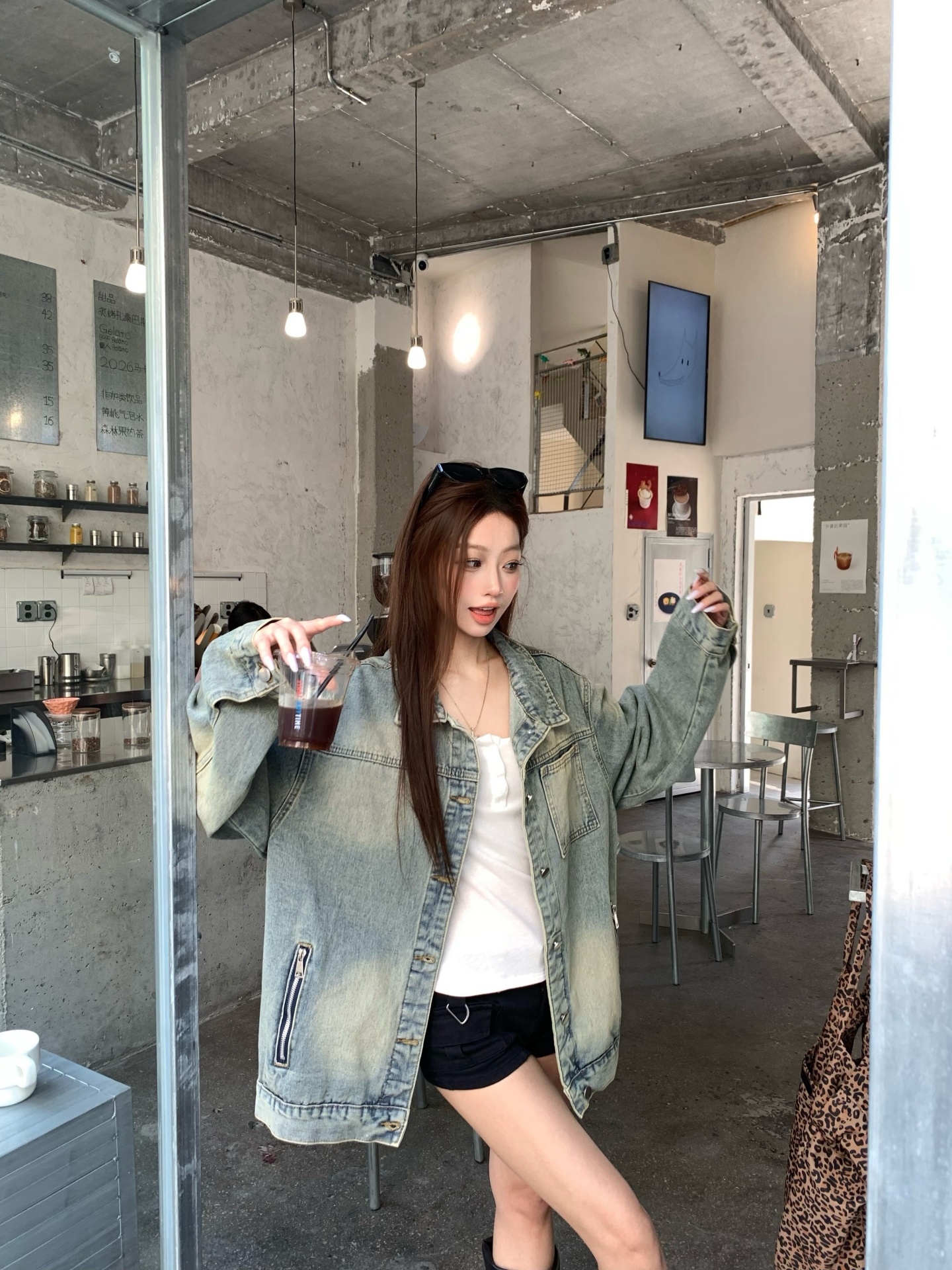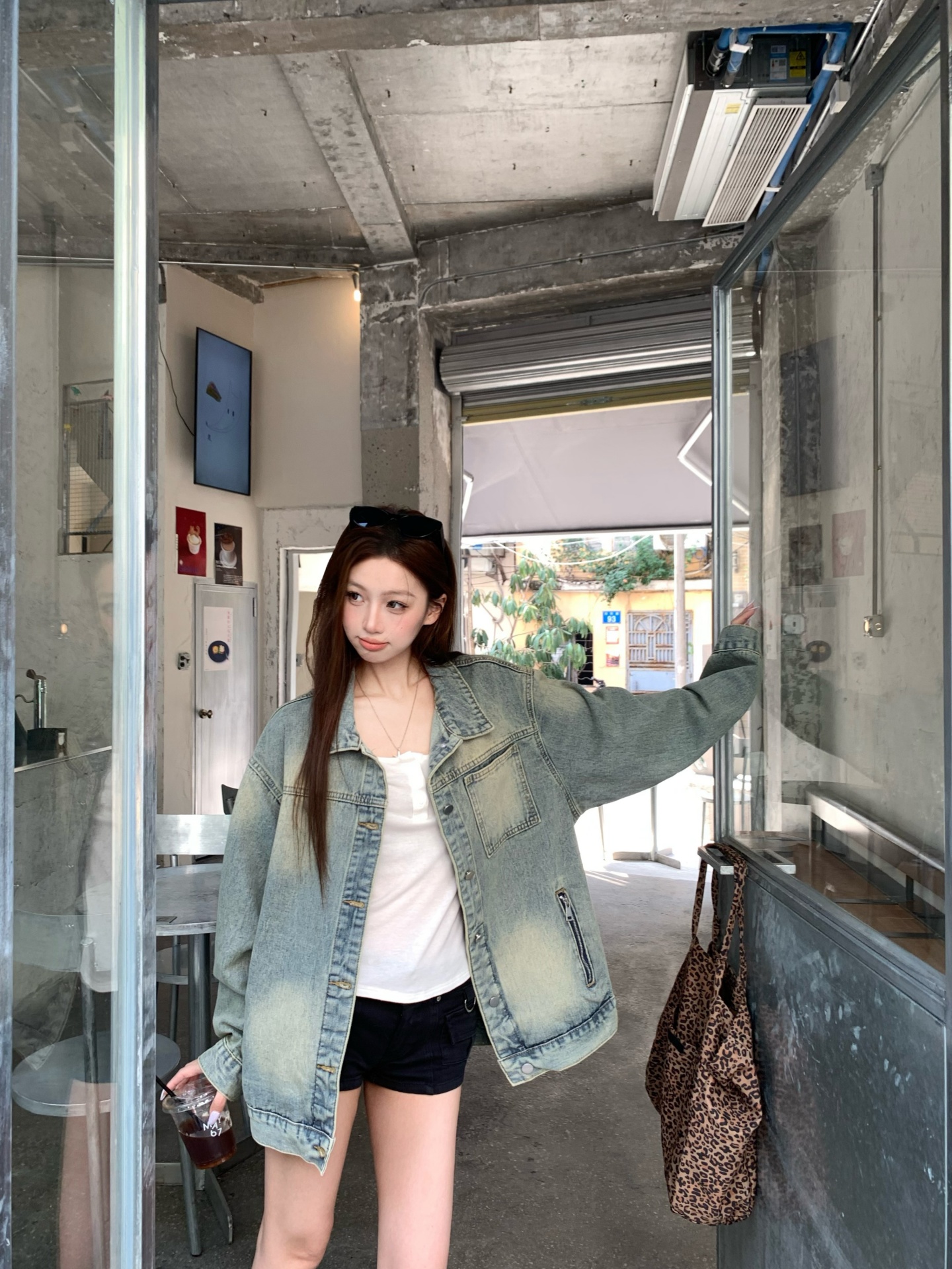 아메리칸 레트로 해체 질감 데님 재킷 루즈핏 프로필 모양 몸매 가꾸기 슬림해 보이는 워크웨어 재킷 여성