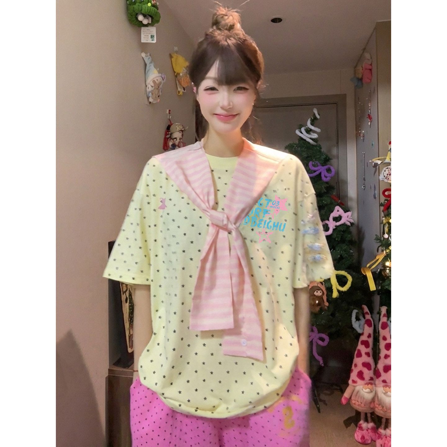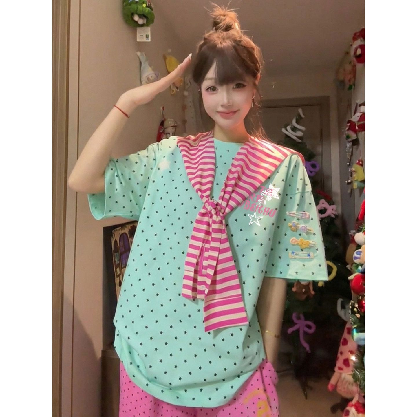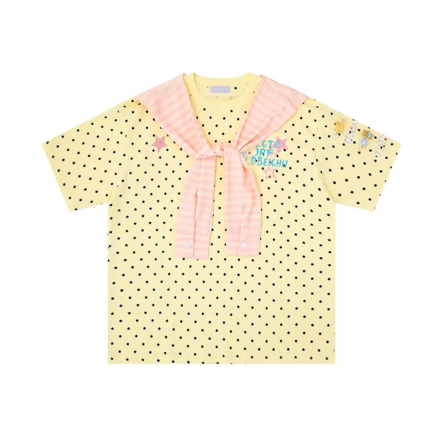 경관 그림 32 더블 실 순면 반팔 티셔츠 여성 의류 여름 새로운 도트 무늬 탈착식 숄 라운드 넥 맨위