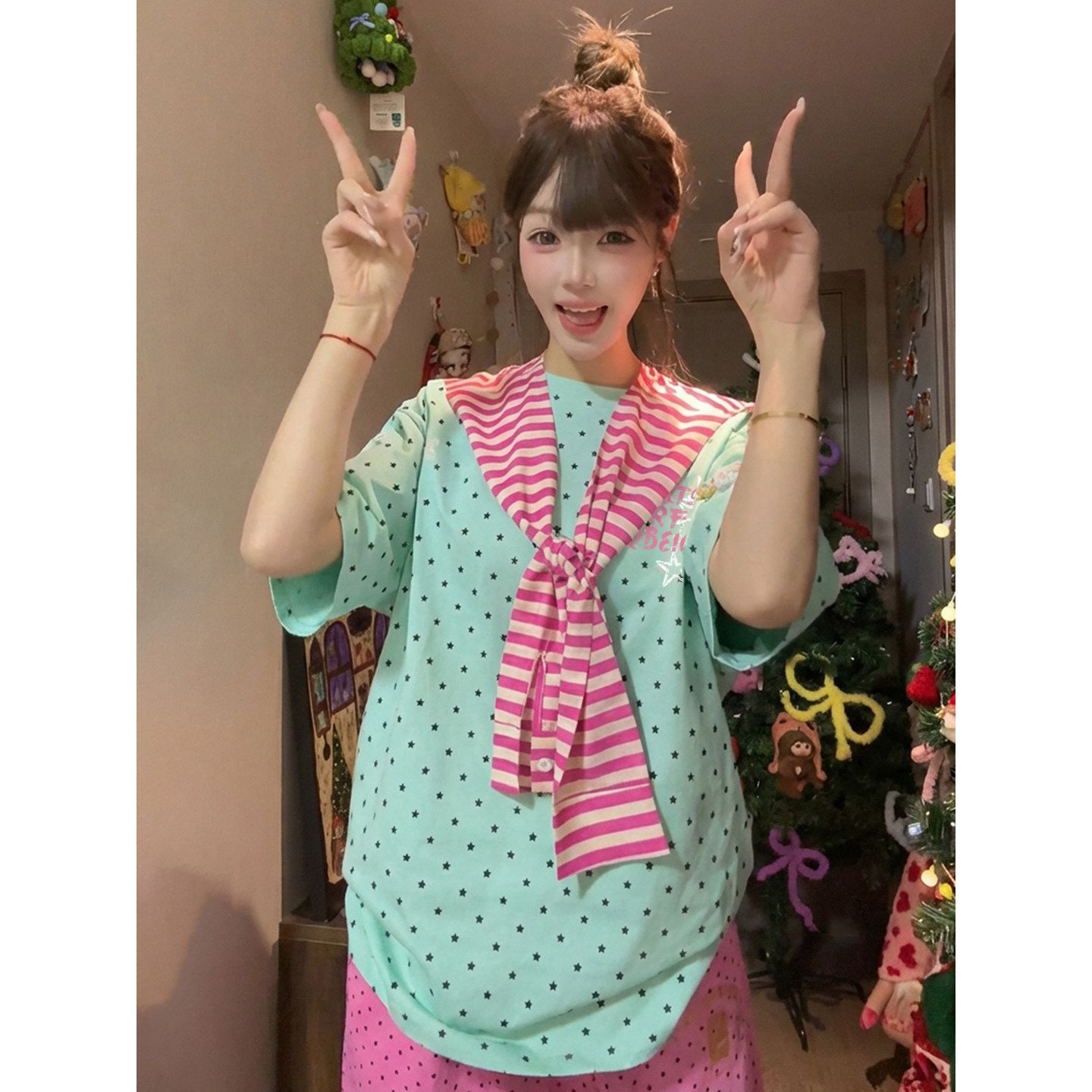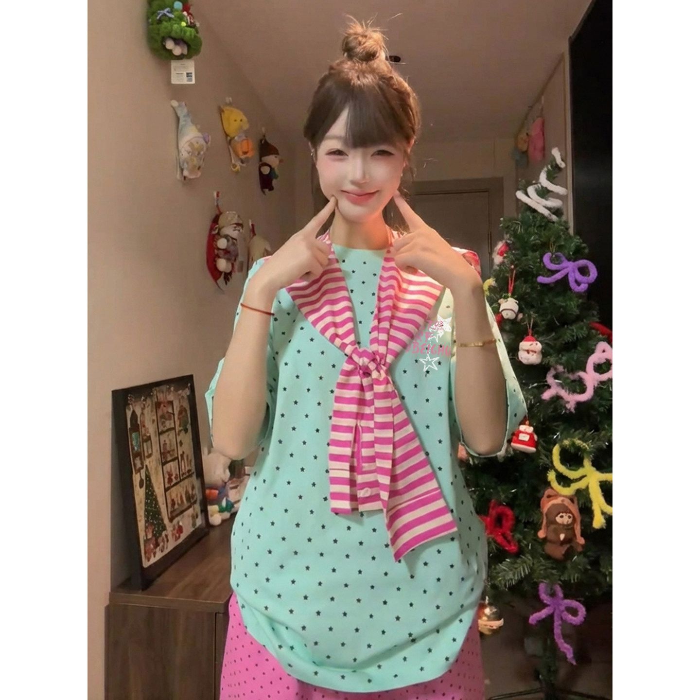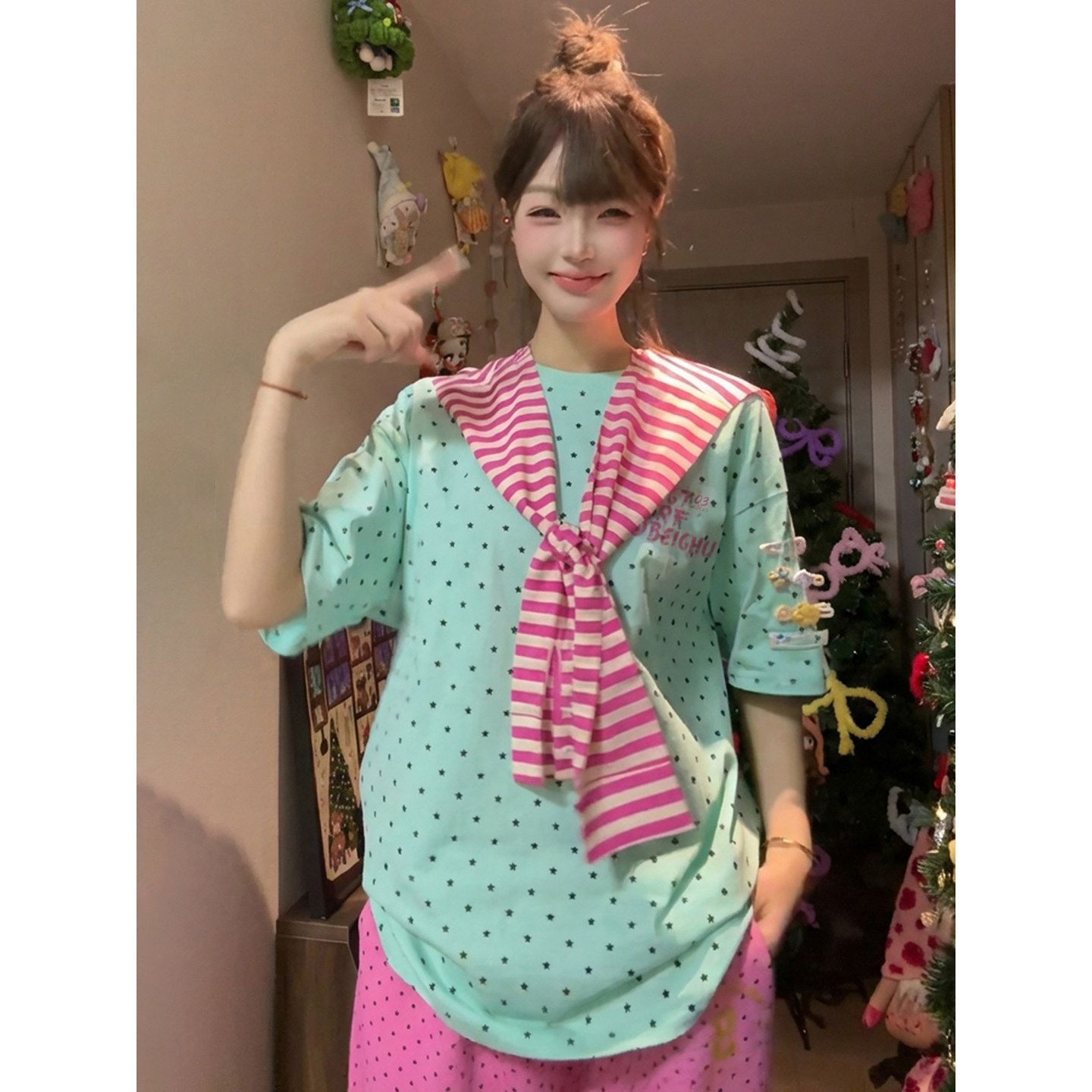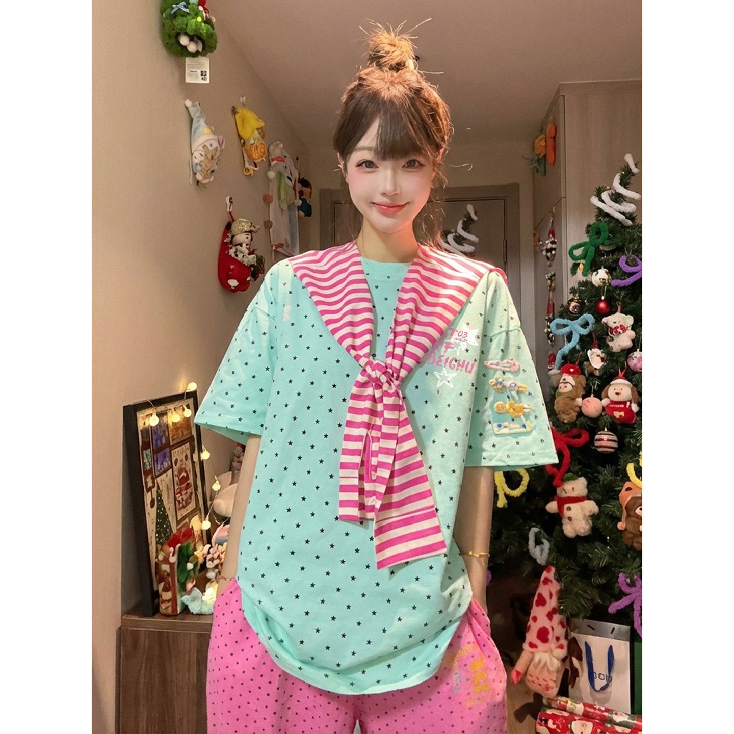경관 그림 32 더블 실 순면 반팔 티셔츠 여성 의류 여름 새로운 도트 무늬 탈착식 숄 라운드 넥 맨위