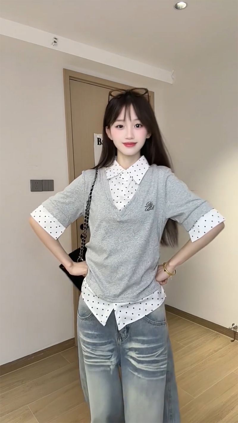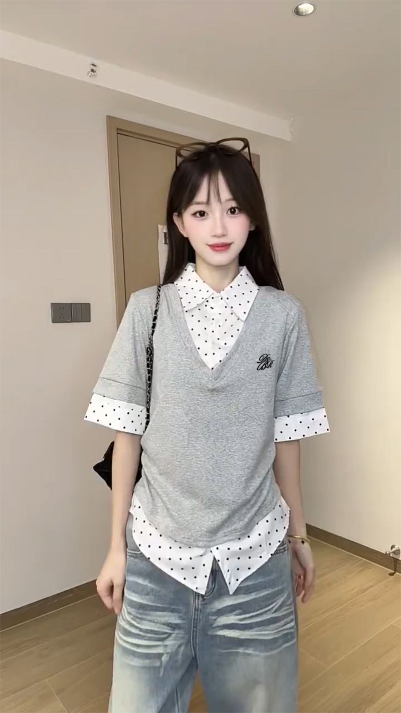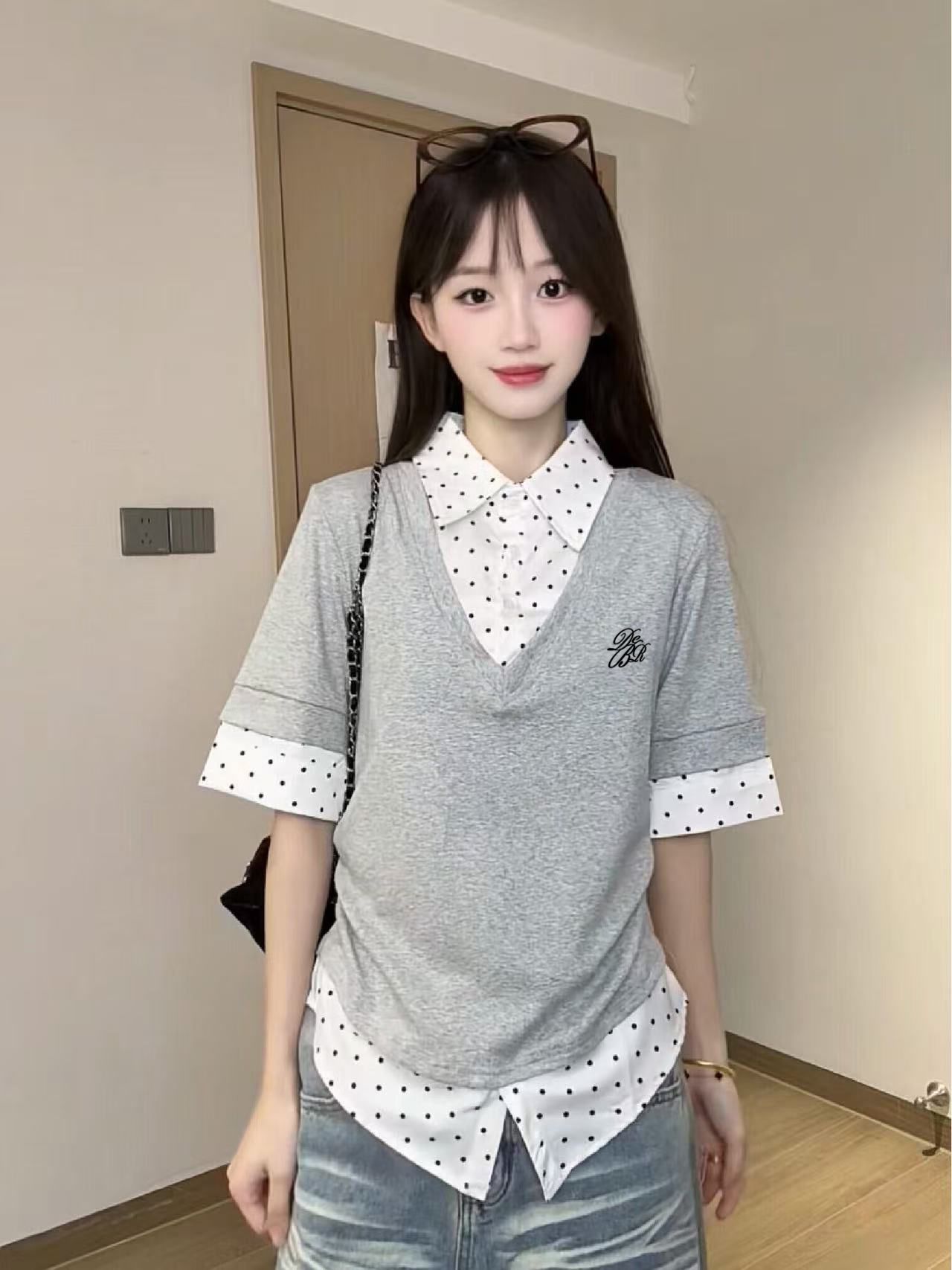 실사 1 순면 리브 210 그램 반팔 티셔츠 여성 의류 여름 새로운 한 부서 도트 무늬 페이크 레이어드 맨위