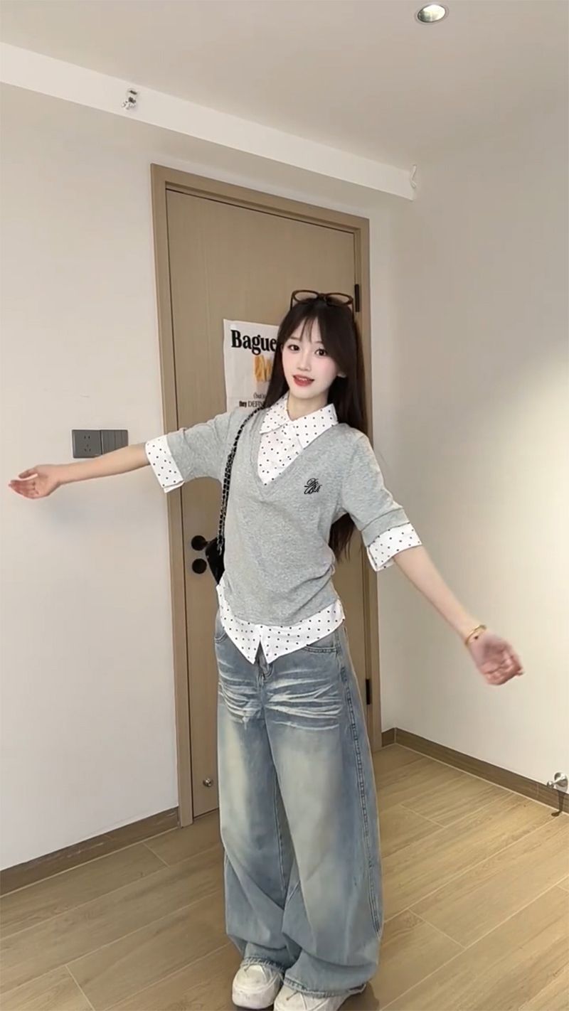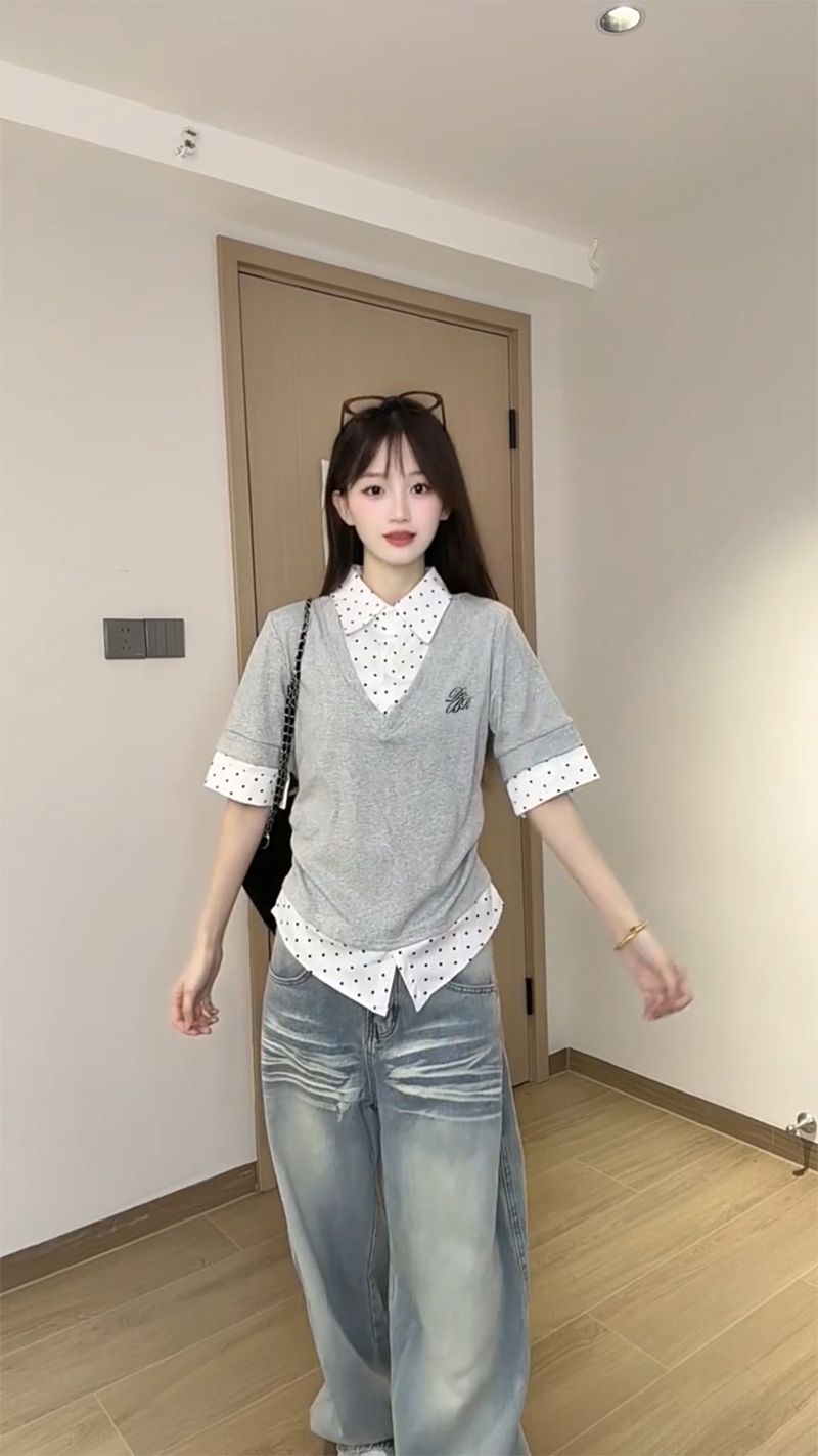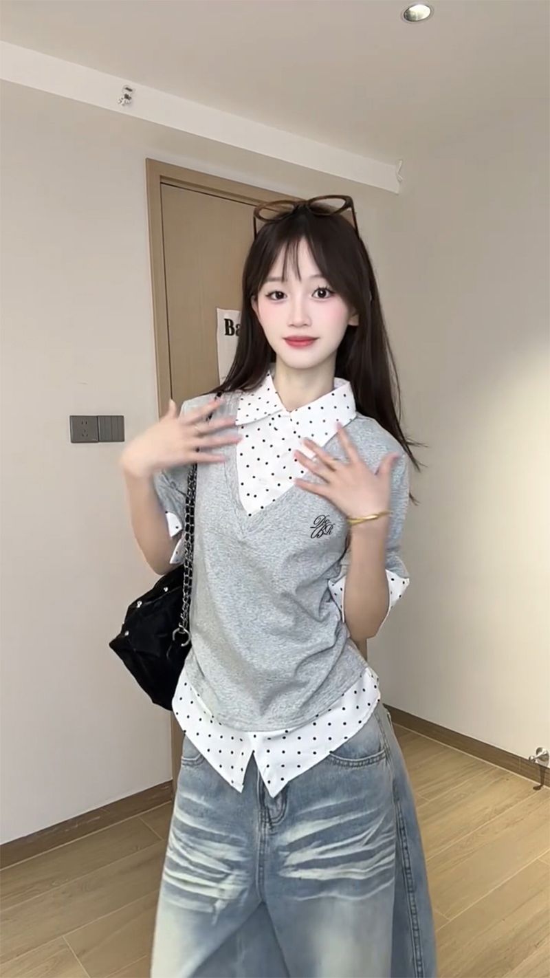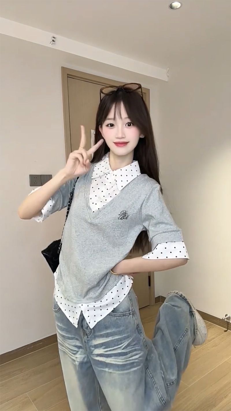 실사 1 순면 리브 210 그램 반팔 티셔츠 여성 의류 여름 새로운 한 부서 도트 무늬 페이크 레이어드 맨위