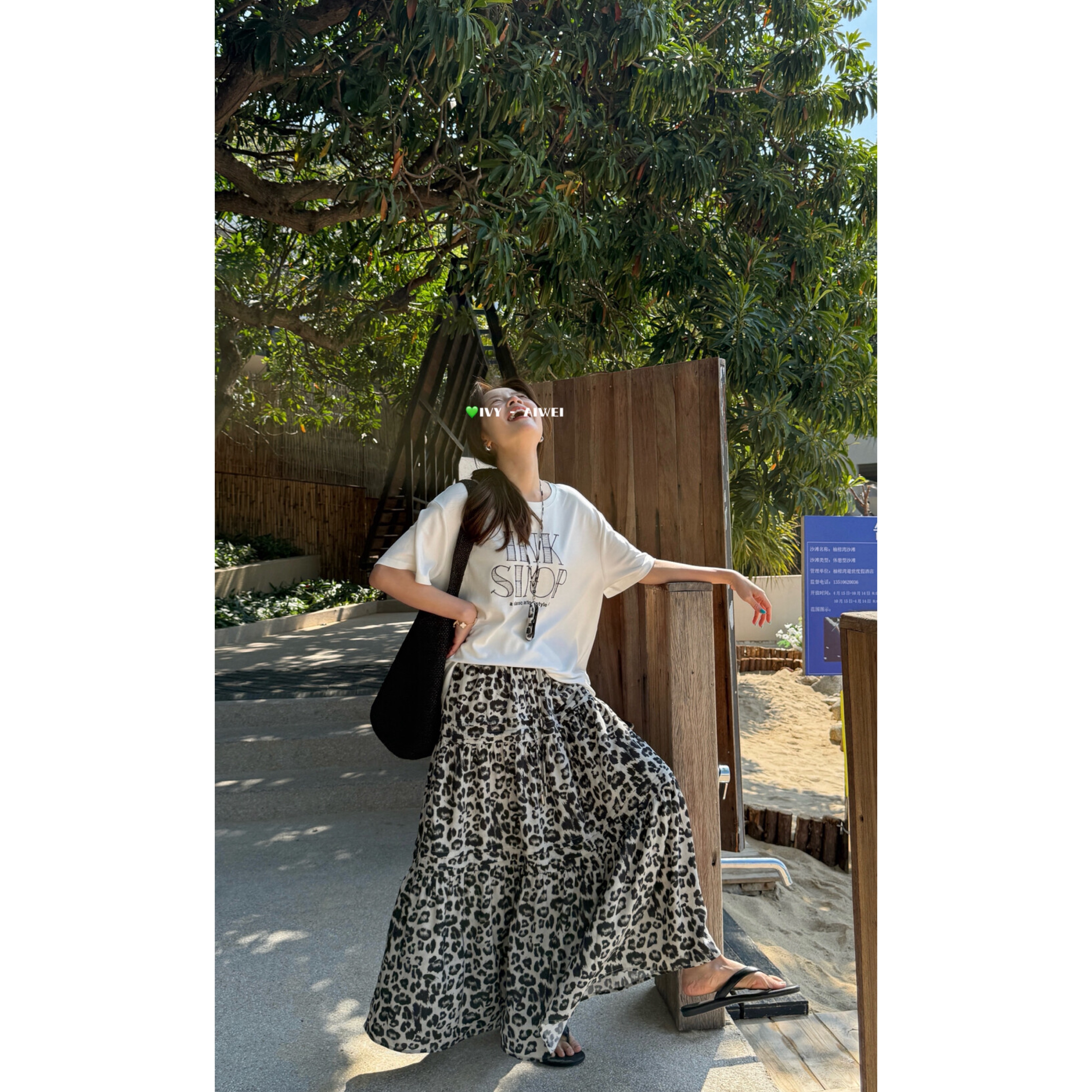 2026 여름 새로운 알파벳 자수 반팔 티셔츠 레트로 레오파드 무늬 반신 스커트 투피스 슈트 여성 경기 펜던트