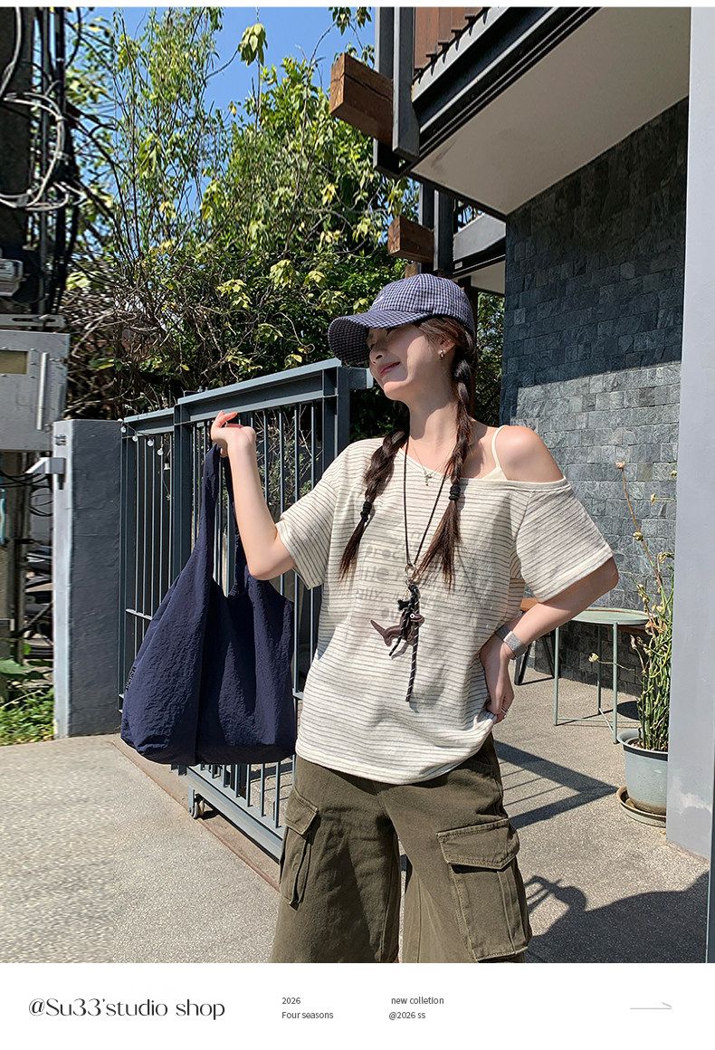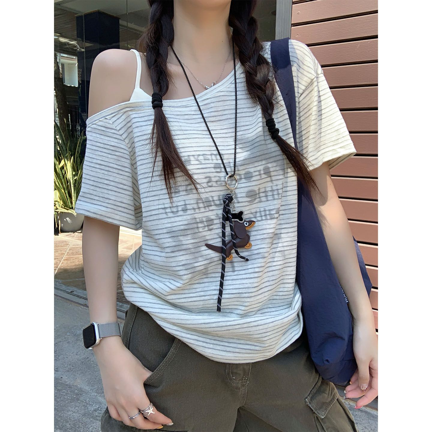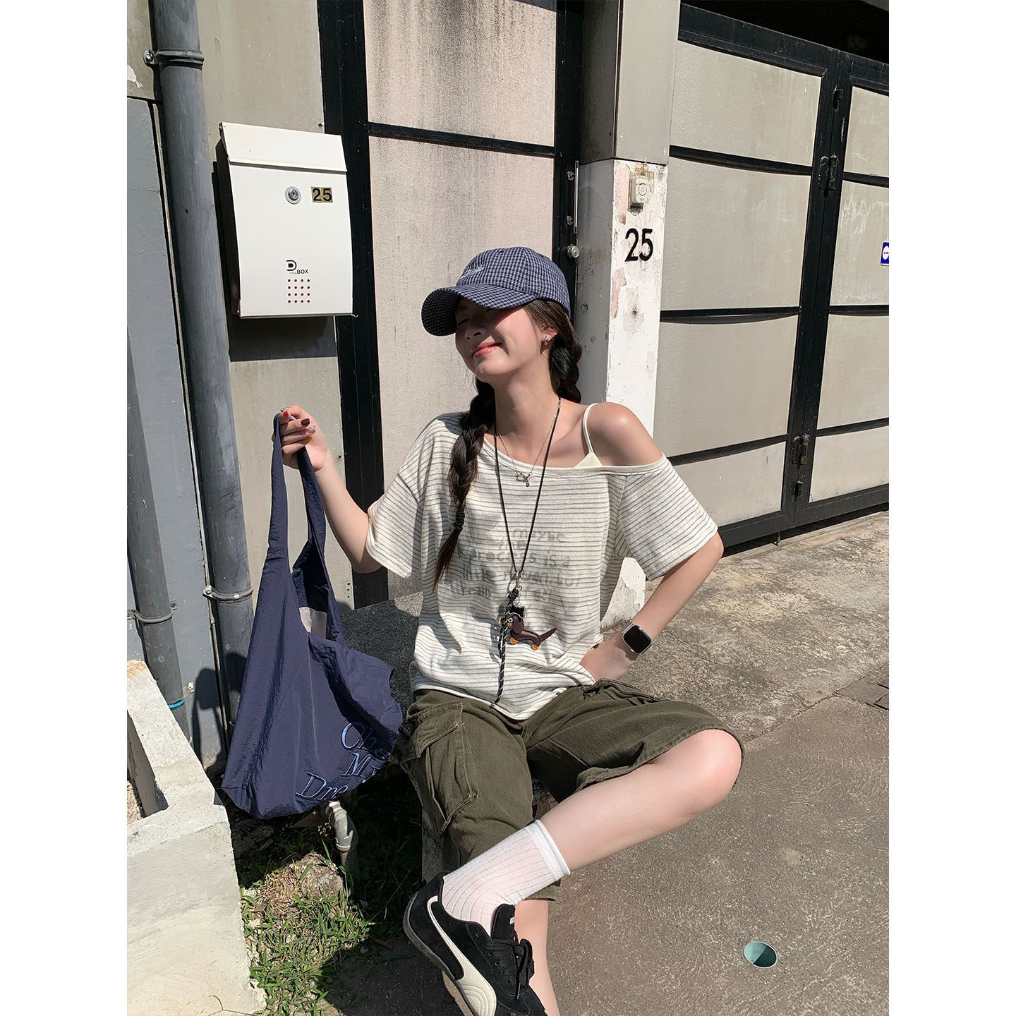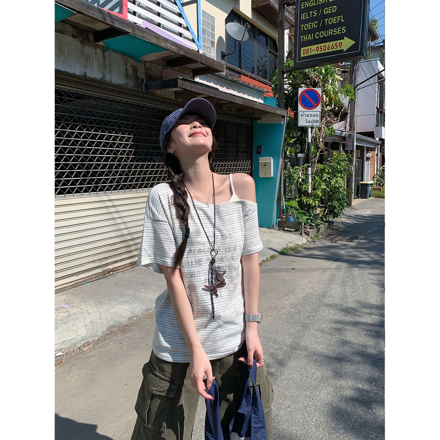 경관 그림 반팔 티셔츠 여성 의류 여름 새로운 한 부서 루즈핏 페이크 레이어드 오프숄더 아메리칸 스트라이프 비스듬한 칼라 맨위