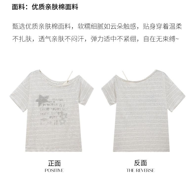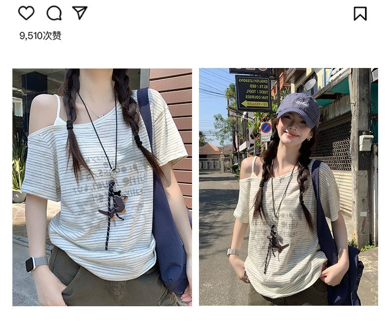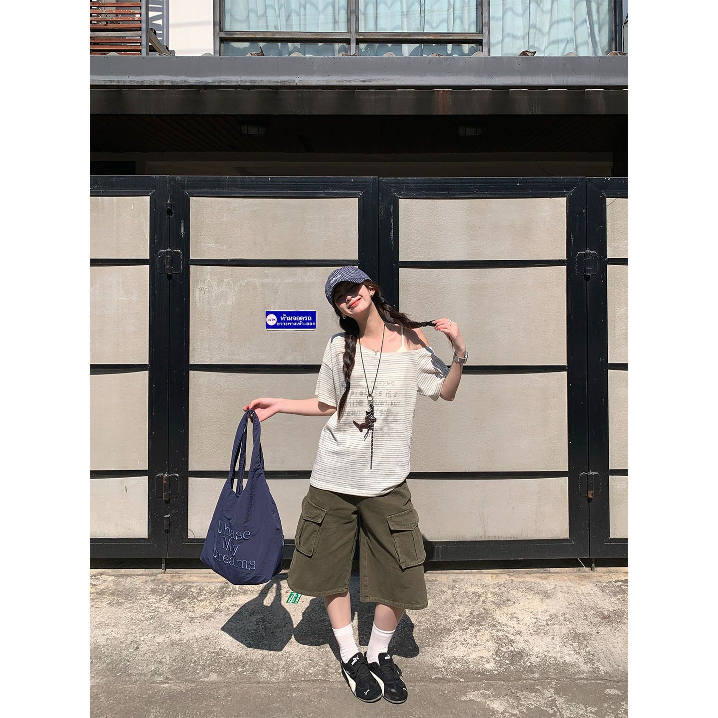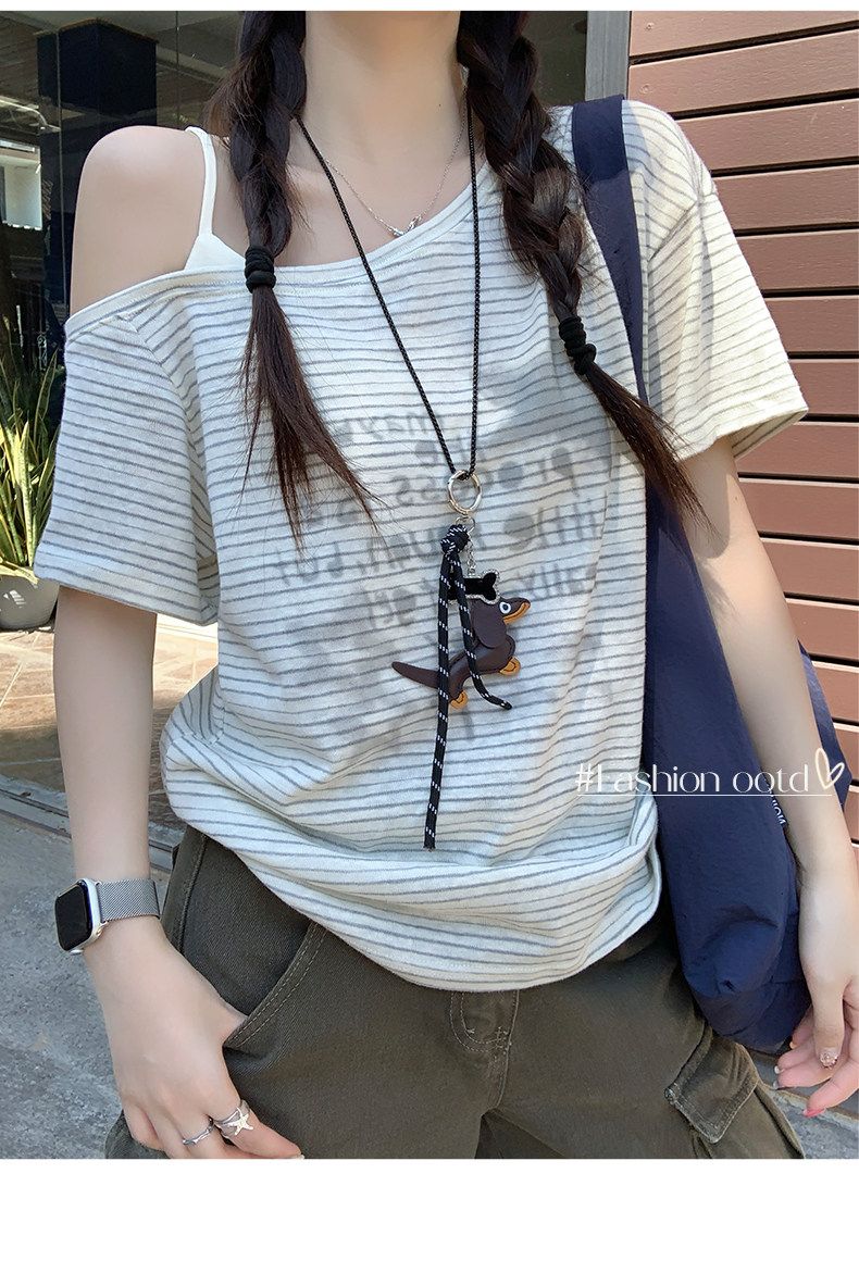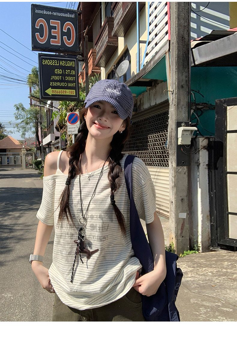 경관 그림 반팔 티셔츠 여성 의류 여름 새로운 한 부서 루즈핏 페이크 레이어드 오프숄더 아메리칸 스트라이프 비스듬한 칼라 맨위
