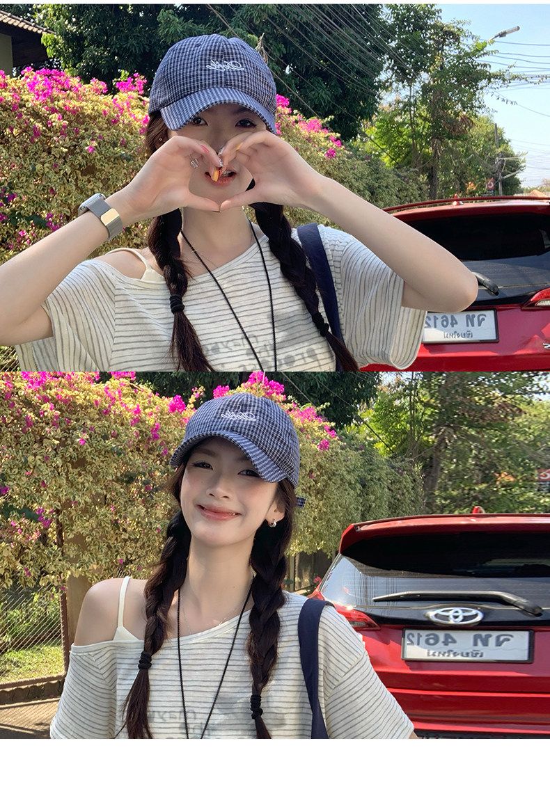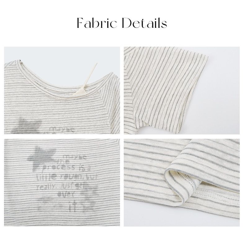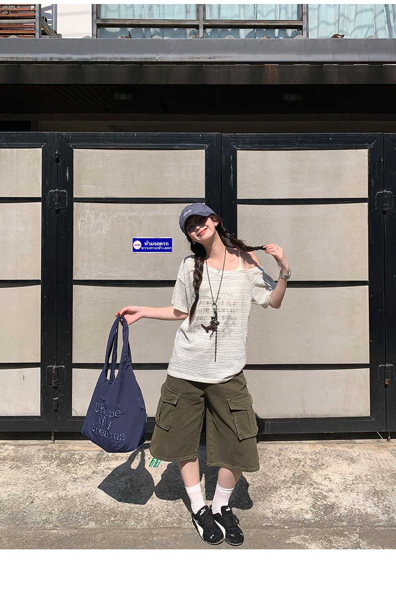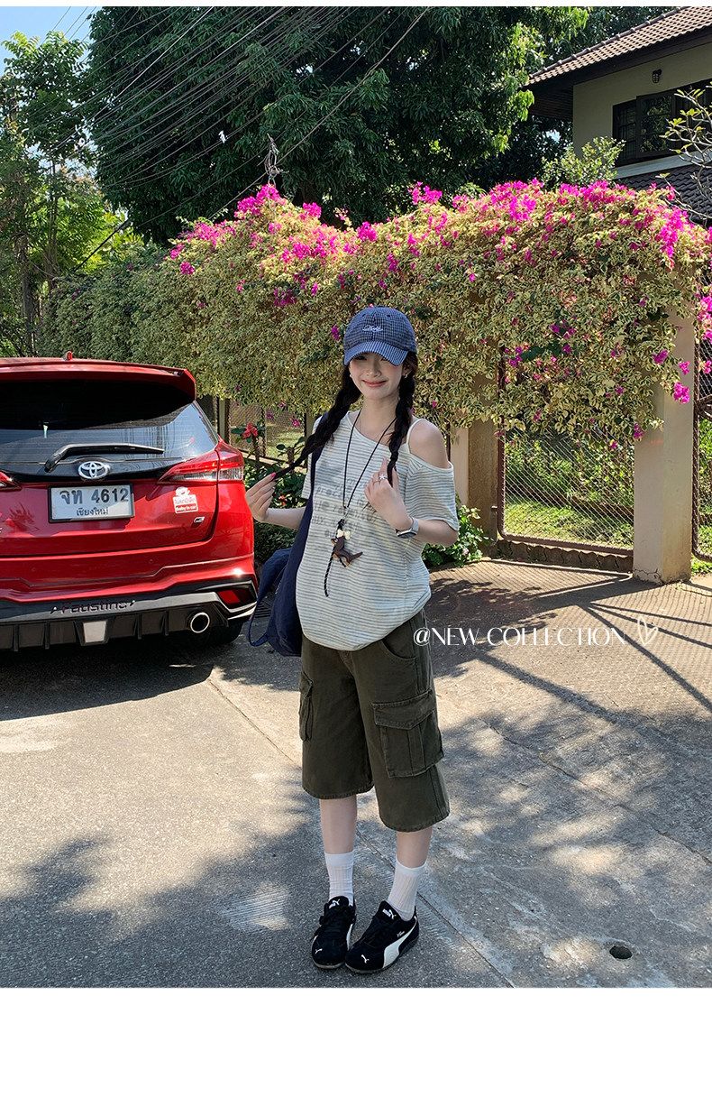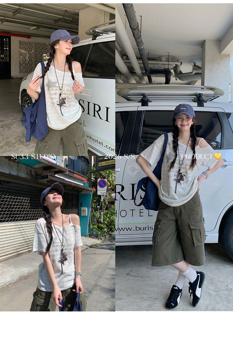 경관 그림 반팔 티셔츠 여성 의류 여름 새로운 한 부서 루즈핏 페이크 레이어드 오프숄더 아메리칸 스트라이프 비스듬한 칼라 맨위