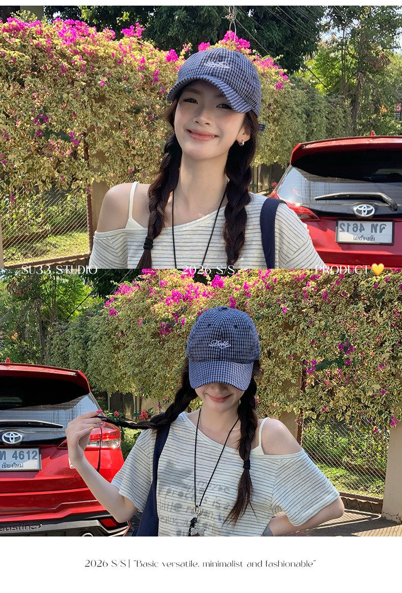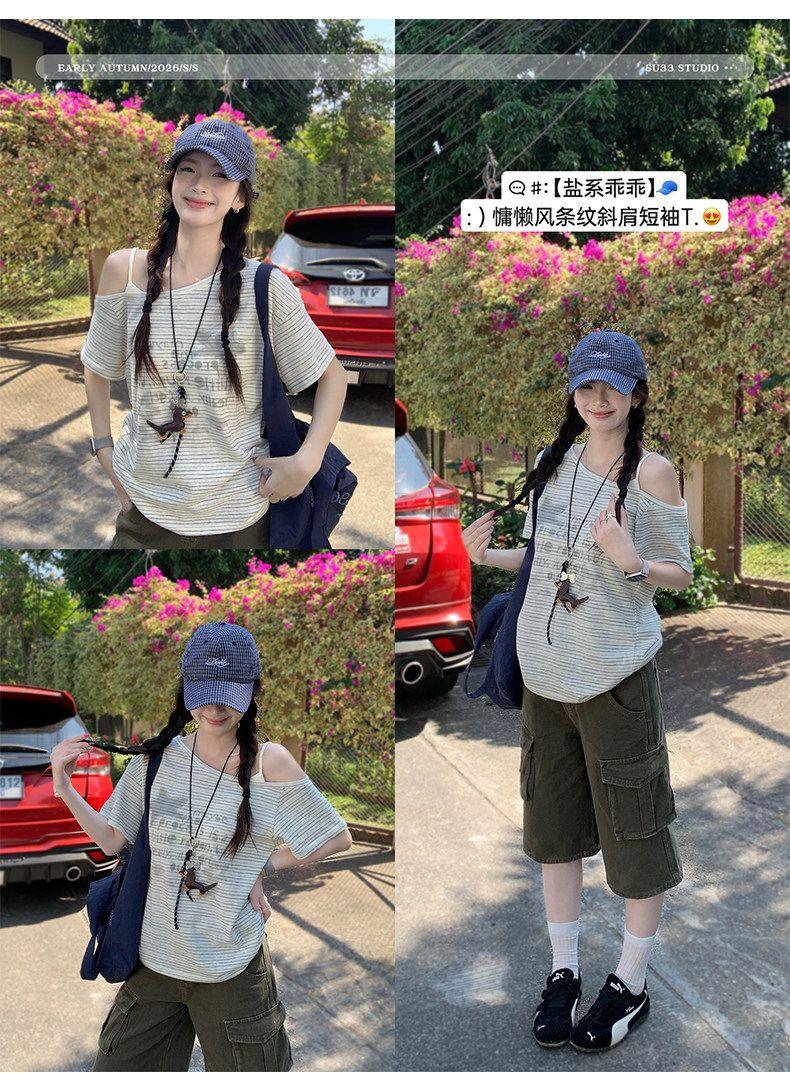 레드 맨 파빌리온 반팔 티셔츠 여성 2026 새로운 여름 착용 가져 가라. 튀김 거리 고유 한 아름다운 스트라이프 오프숄더 비스듬한 어깨 의류