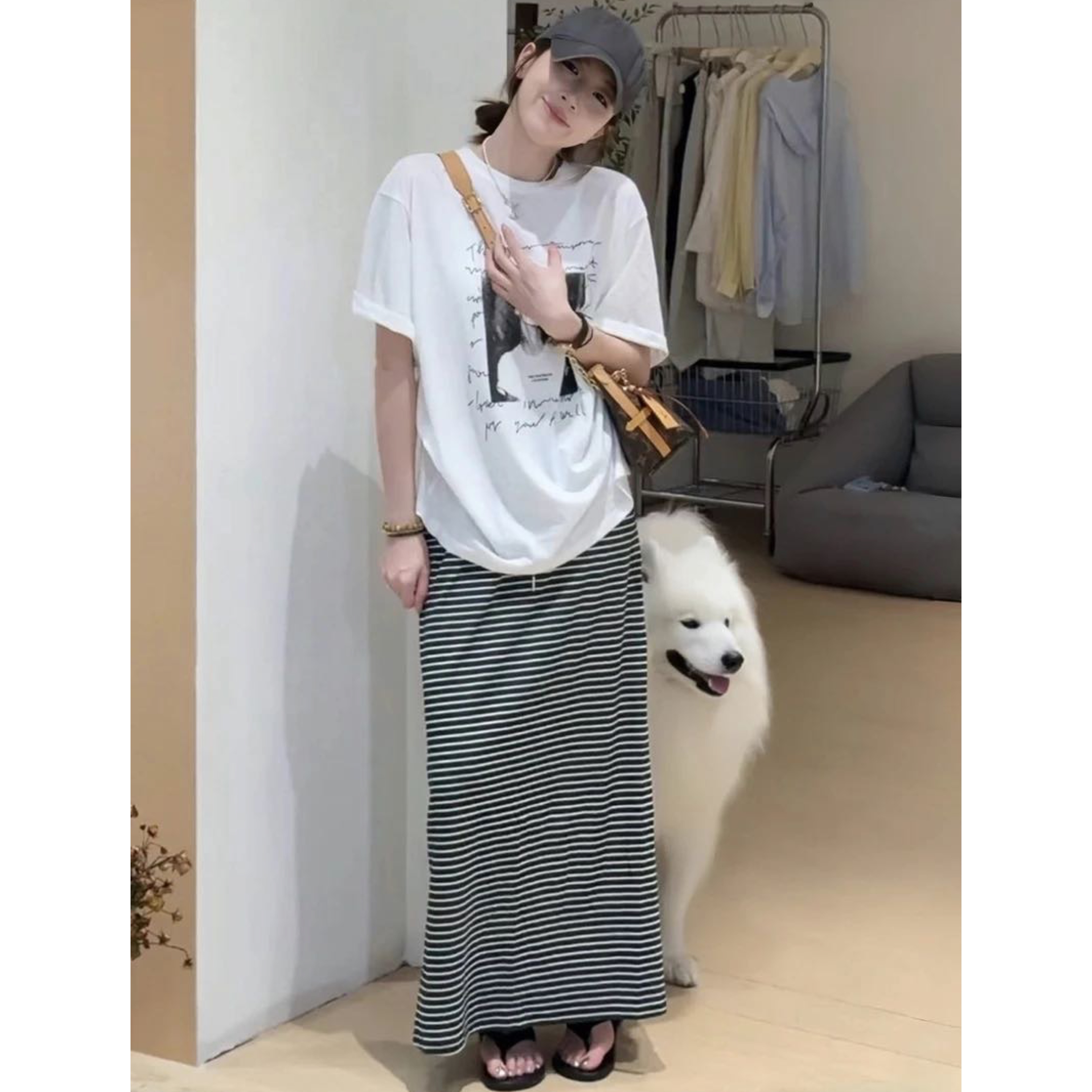 자이언트 잘 생긴 여름 전체 집합 한 부서 연령 감소 알파벳 프린트 반팔 티셔츠 캐주얼 스트라이프 반신 스커트 두 조각 여성 세트