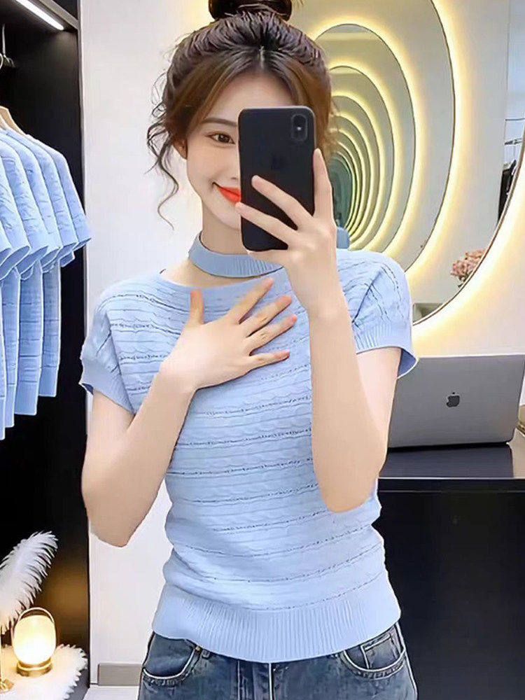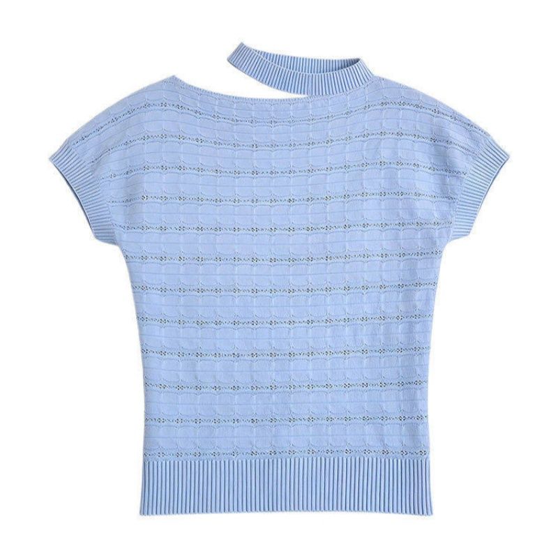 파란색 라운드 넥 홀로우 아웃 반팔 니트 스웨터 여성 2026 여름 새로운 디자인 센스 고유 한 Chic 슈퍼 잘 생긴 맨위