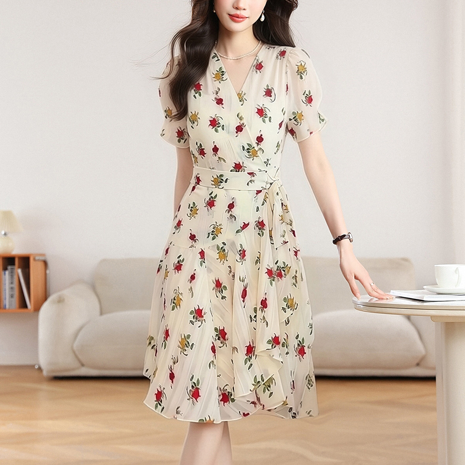 실사 2026 년 여름 새로운 프랑스식 작은 키 허리 수축 슬림해 보이는 품격 V넥 살구 색상 여성 드레스