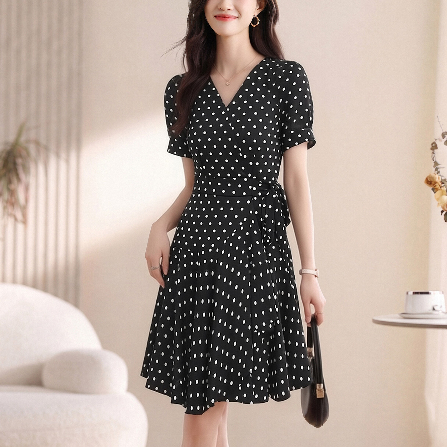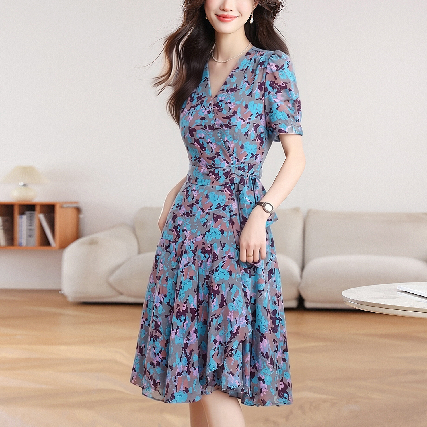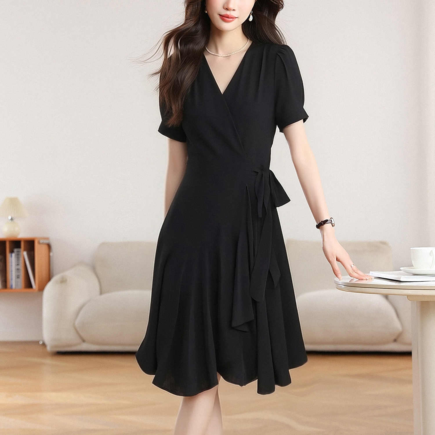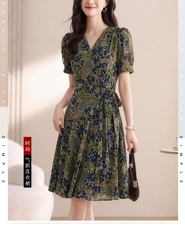 실사 2026 여름 새로운 여성 드레스 디자인 센스 허리 수축 슬림해 보이는 V넥 반팔 차 휴식 중 롱 스커트 여성