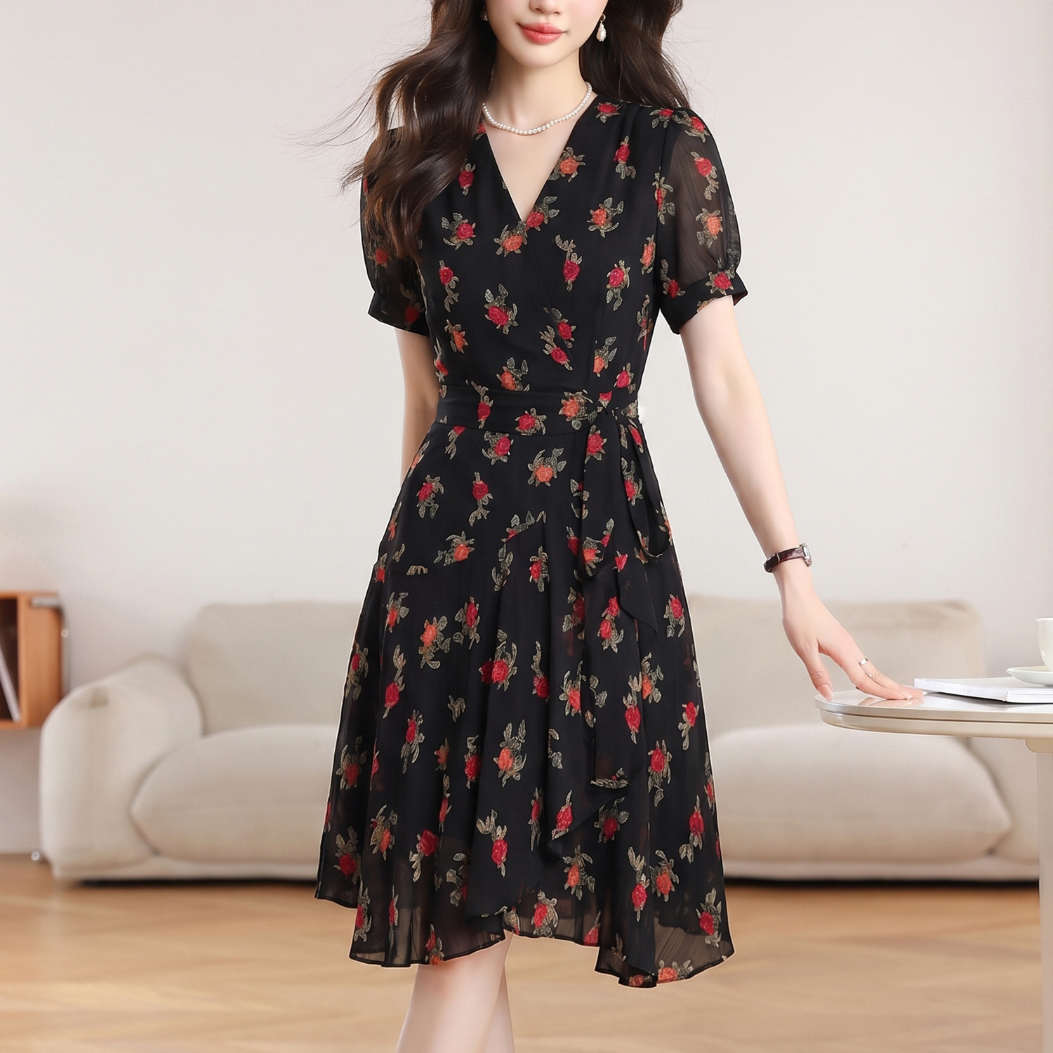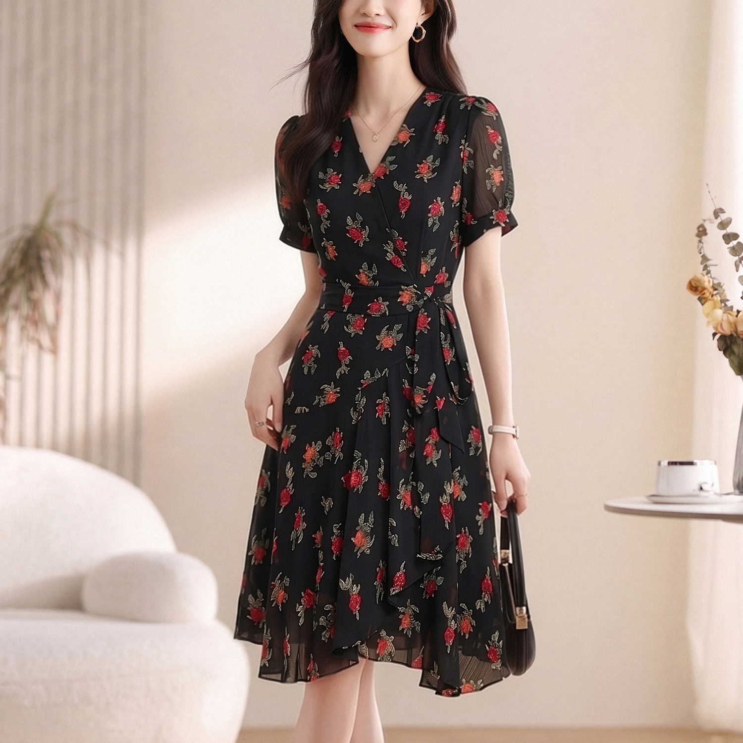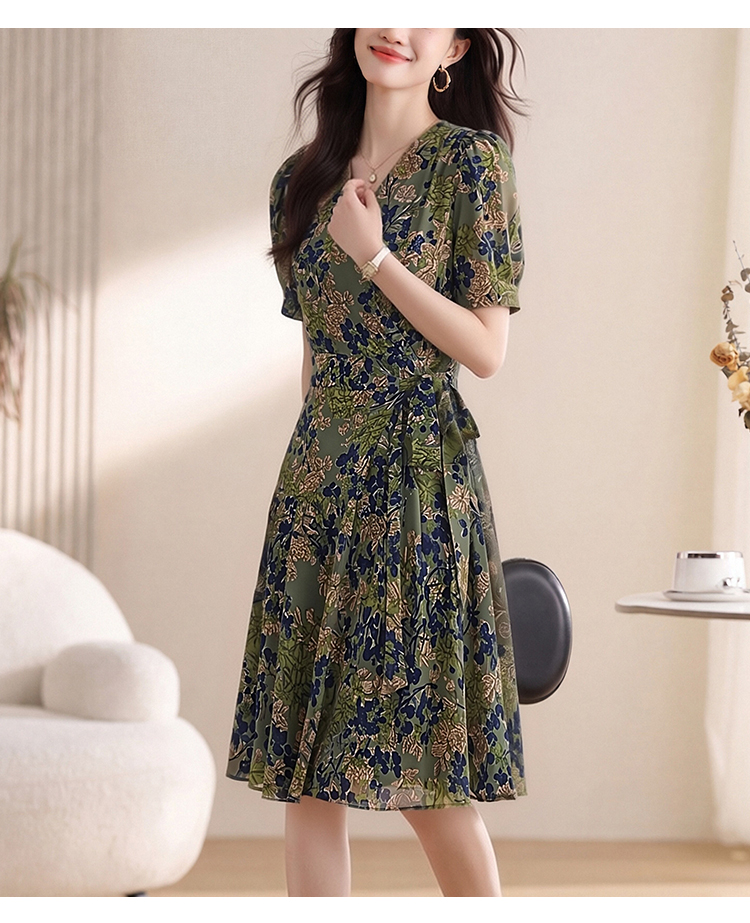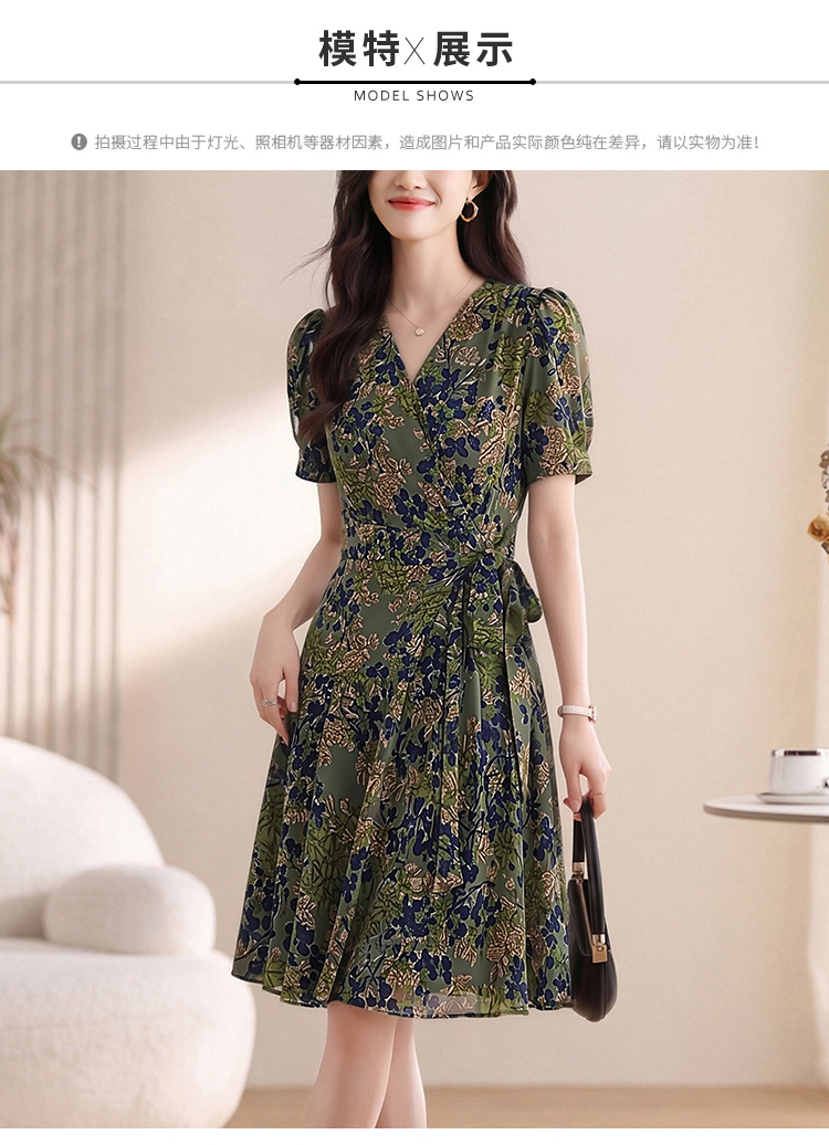 실사 2026 새로운 높음 제직 고밀도 조 그것의 실크 얼음 실크 도루 센스 프로 피부 벨트 연령 감소 슬림해 보이는 반팔 드레스