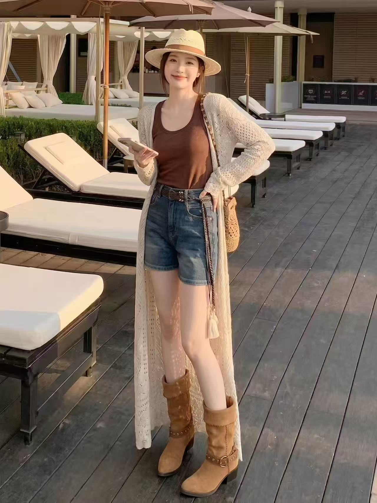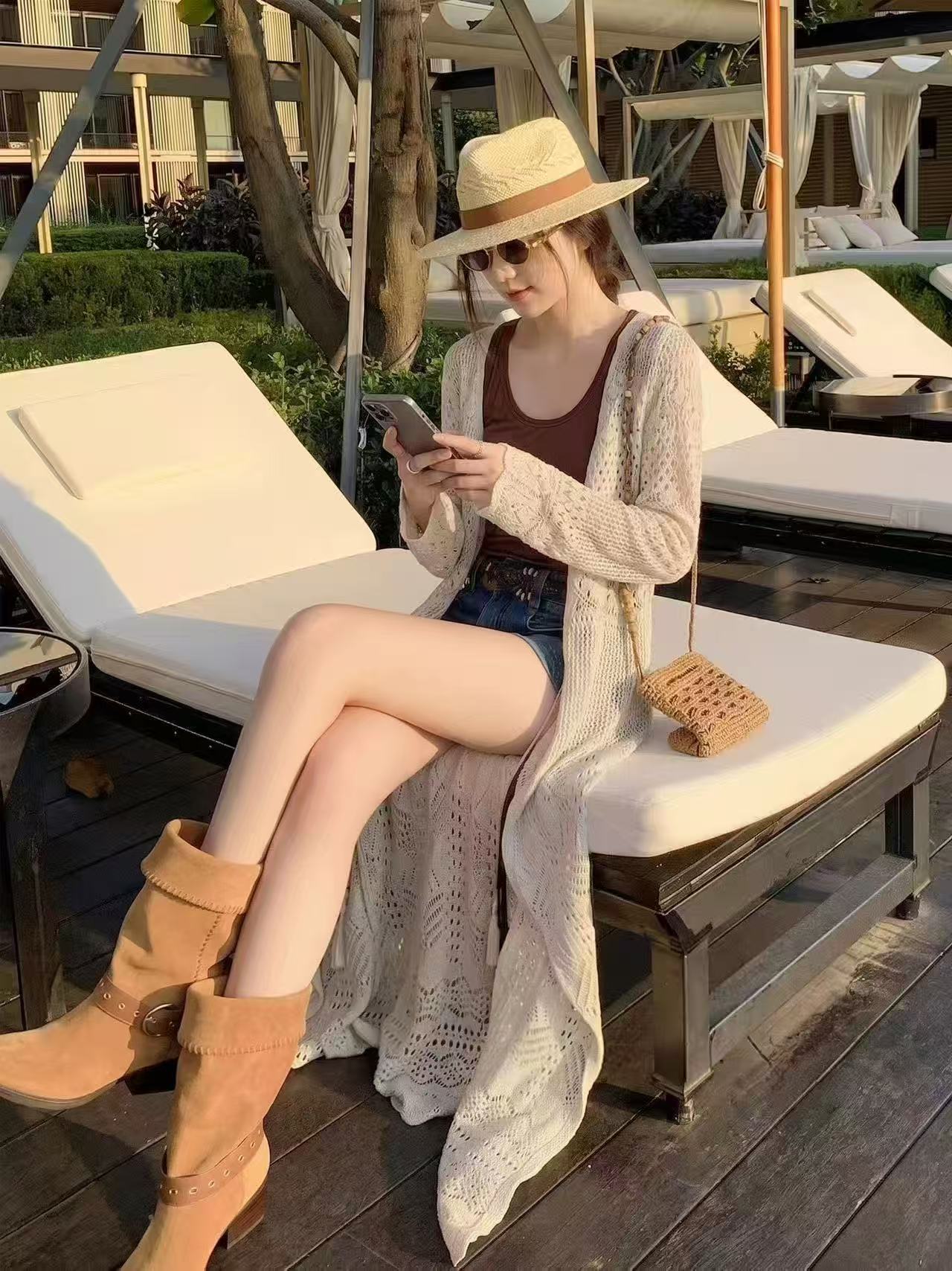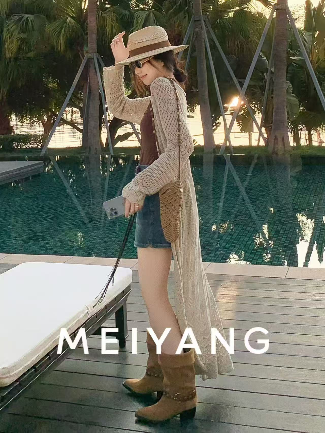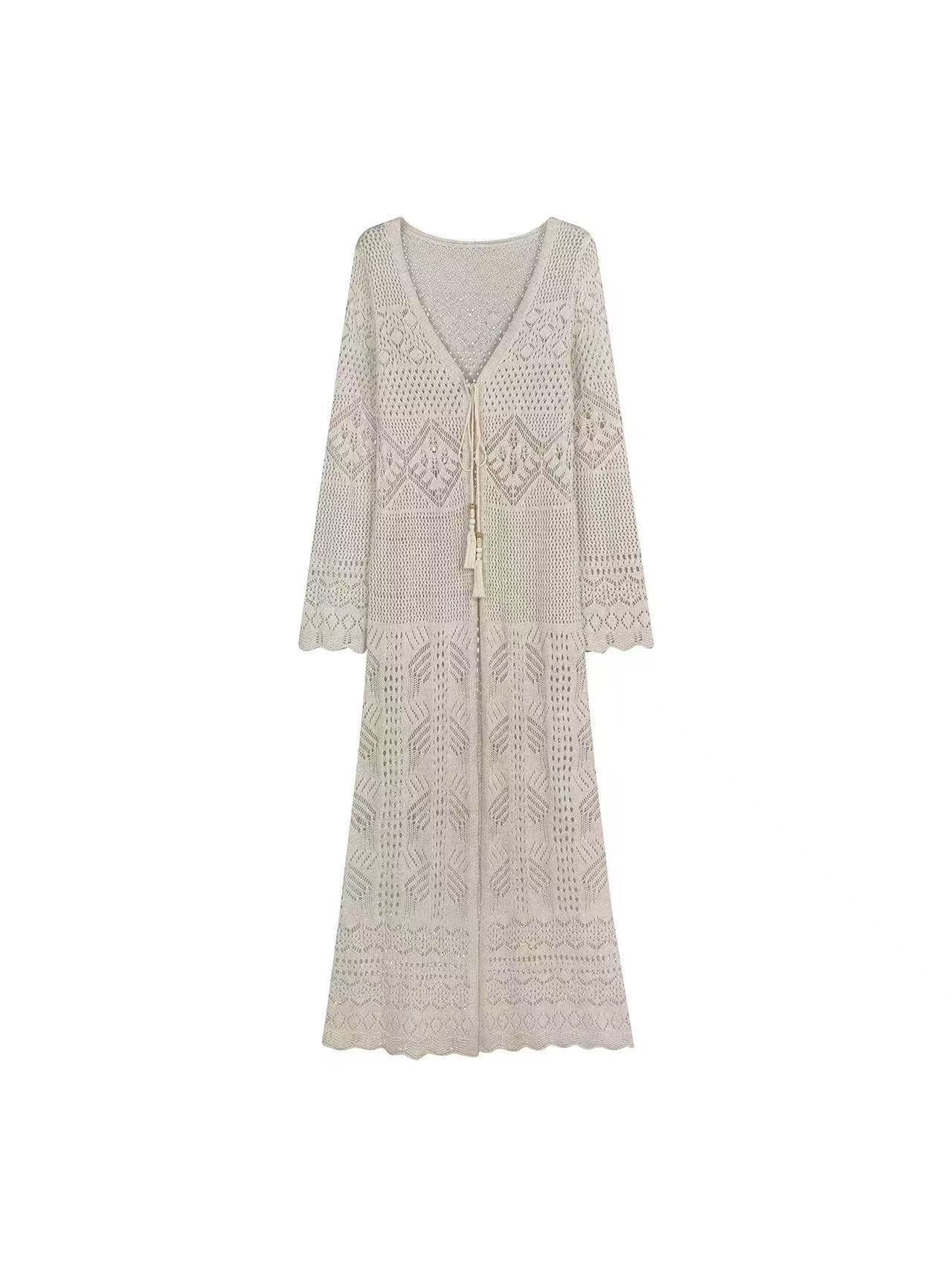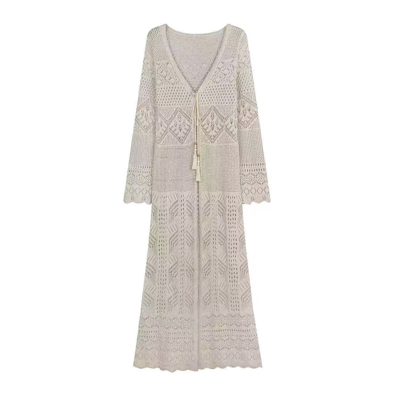보헤미안 바람 홀로우 아웃 니트 오픈 가디건 여성 롱 코트 레이스업 외부 가져 가라. 몸매 가꾸기 슬림해 보이는 긴팔 재킷 휴가 바람