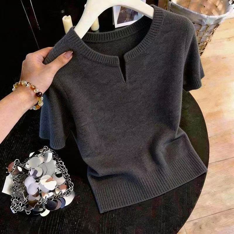 V넥 반팔 니트 스웨터 여성 배색 얇은 스타일 루즈핏 슬림해 보이는 다용도 니트 맨위 다용도 연령 감소 얼음 실크 셔츠 티셔츠