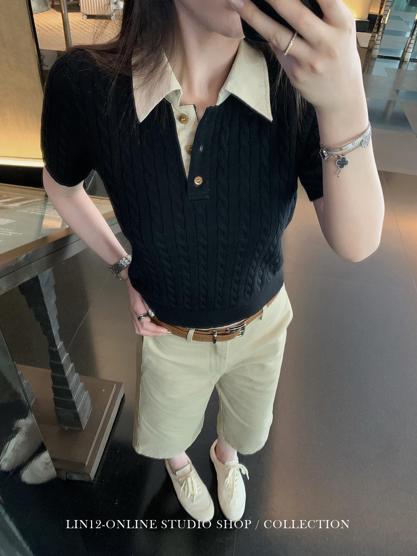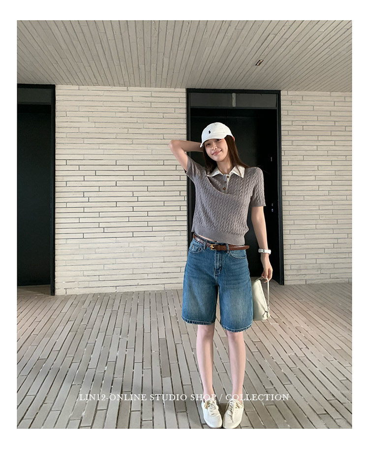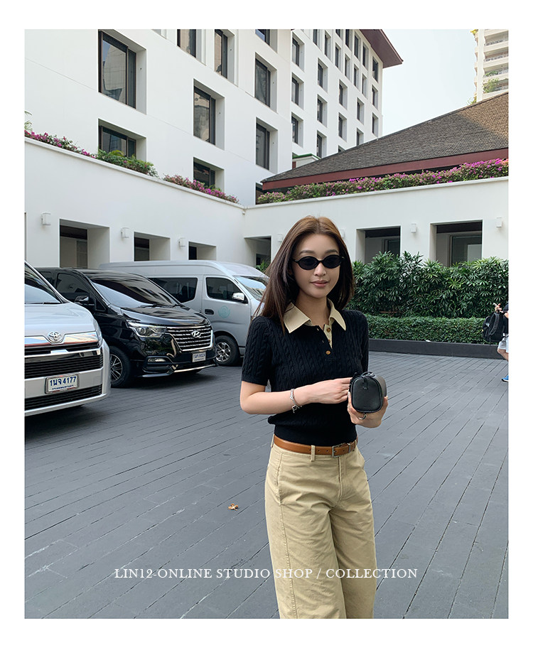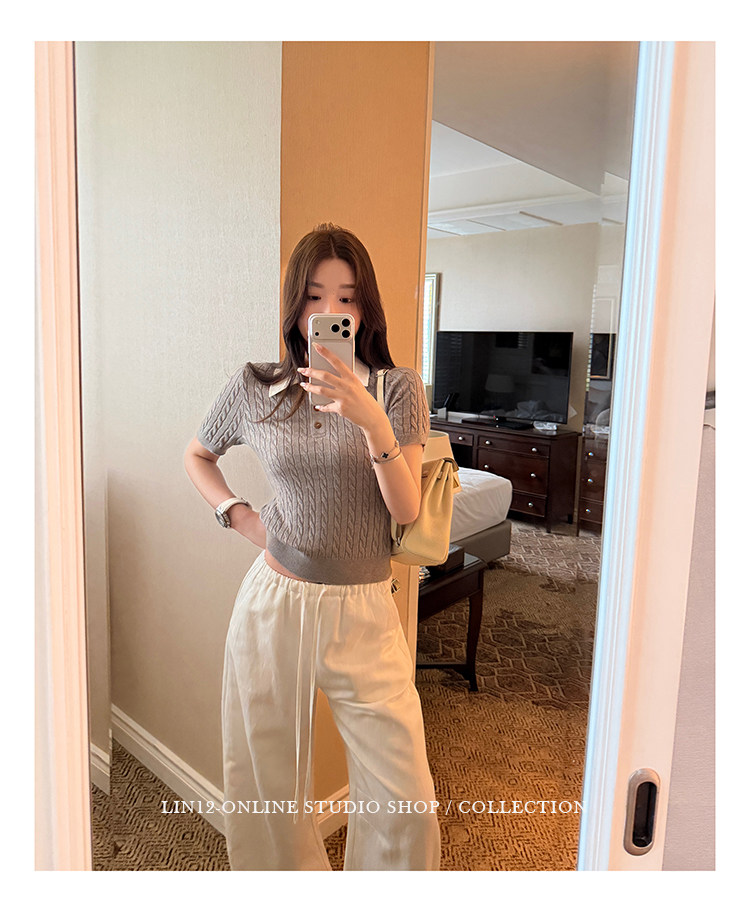 lin12-ivy style 레트로 POLO 칼라 꽈배기 반팔 양모 니트 스웨터 오래된 돈 긍정적 인 어깨 몸매 가꾸기 맨위
