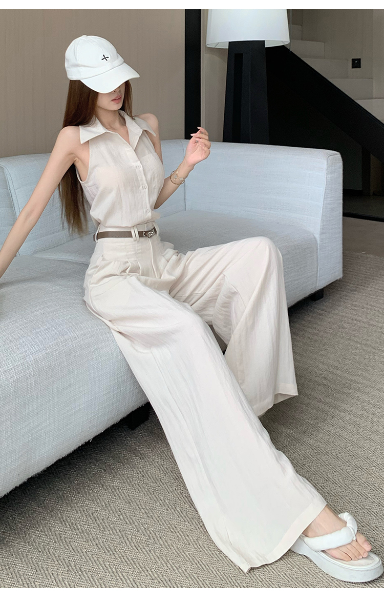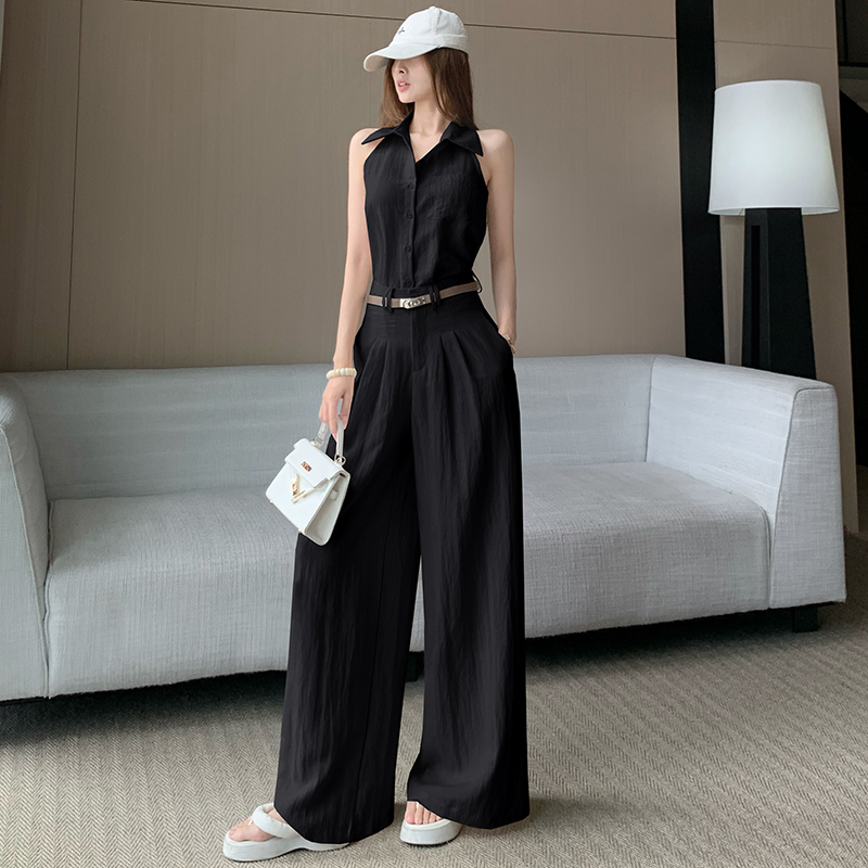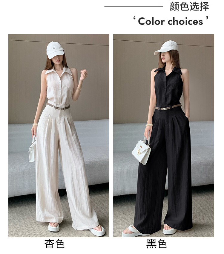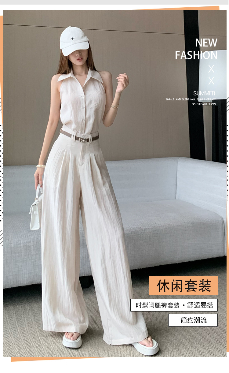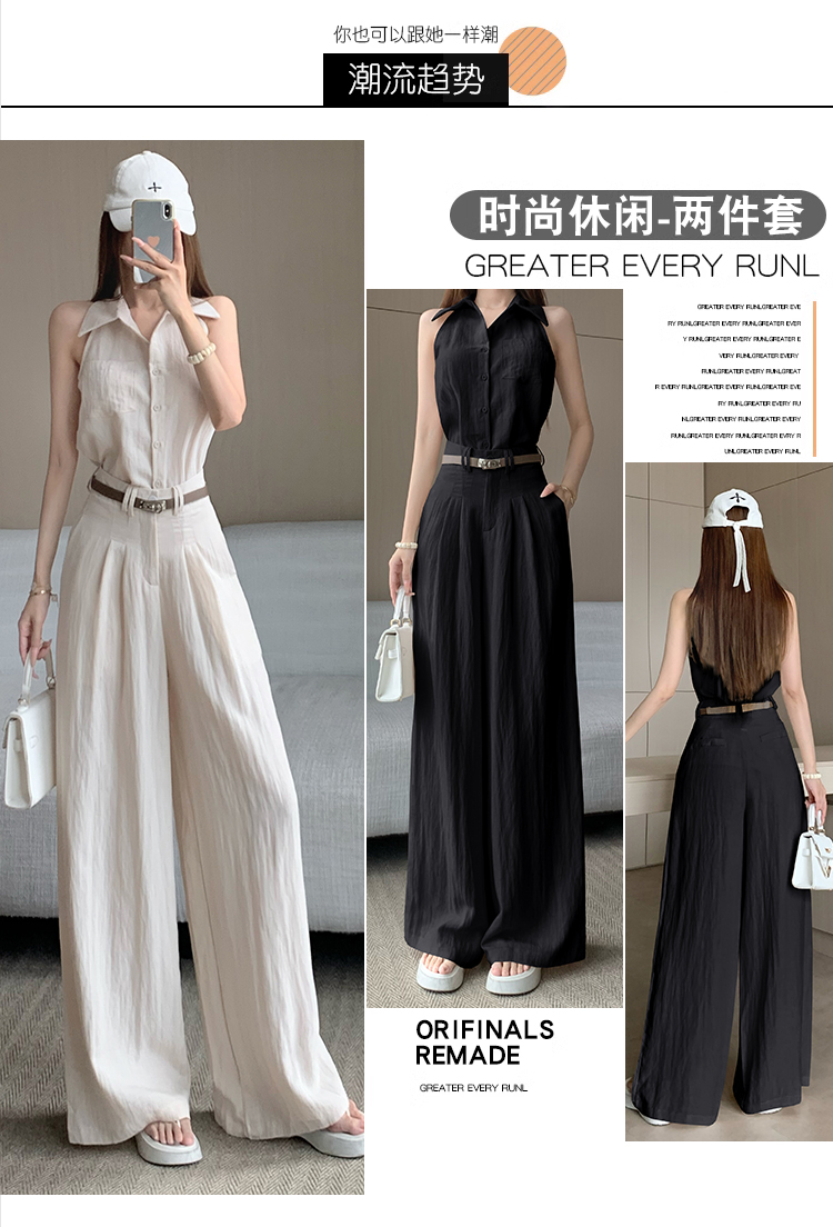 미니멀리즘 패션 슬림해 보이는 민소매 작은 셔츠 다용도 품격 루즈핏 하이웨이스트 캐주얼 바지 세트 벨트 포함 여성 여름