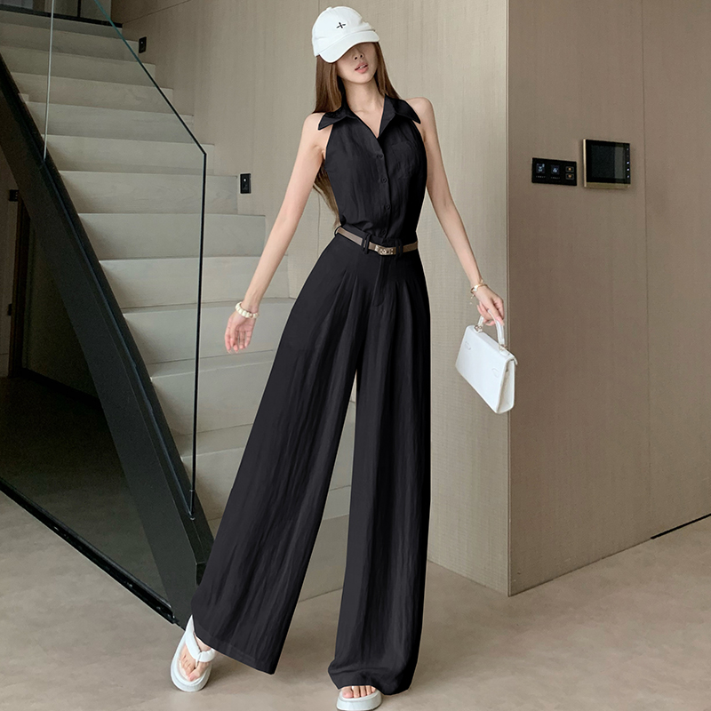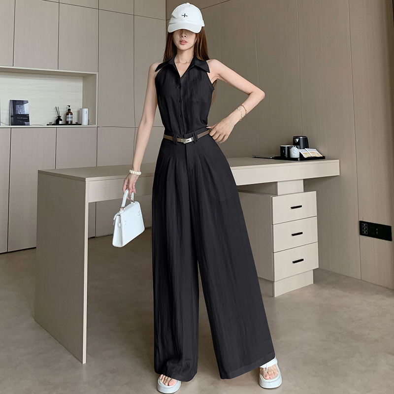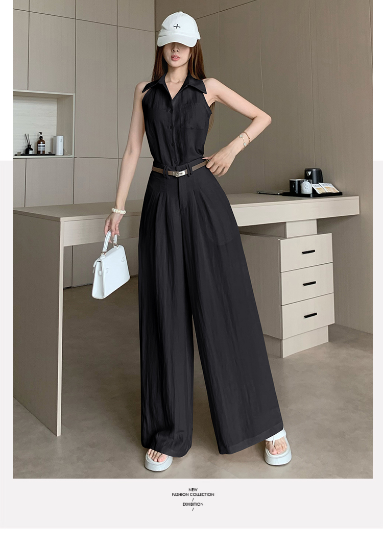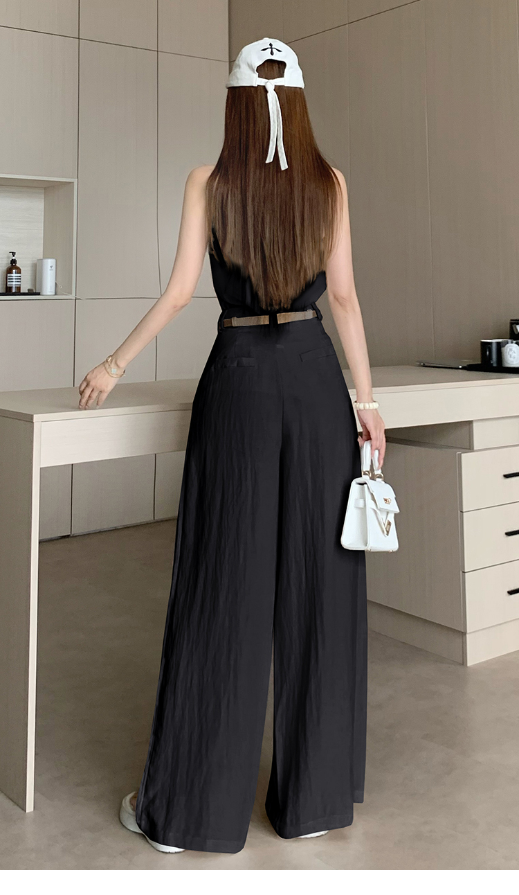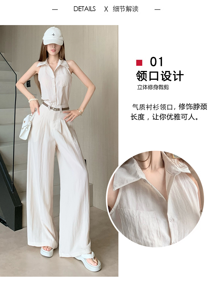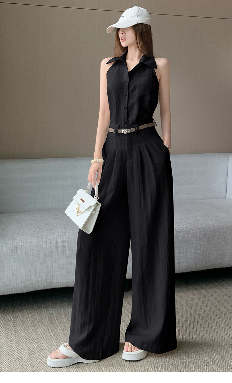 미니멀리즘 패션 슬림해 보이는 민소매 작은 셔츠 다용도 품격 루즈핏 하이웨이스트 캐주얼 바지 세트 벨트 포함 여성 여름