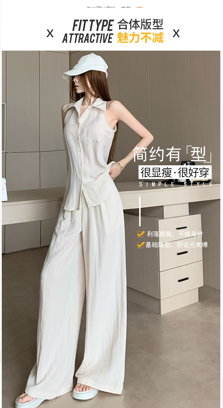 휴가 바람 고급 센스 세트 여성 여름 부드러운 바람 리본 단색 민소매 맨위 슬림해 보이는 와이드 레그 팬츠 투피스 세트