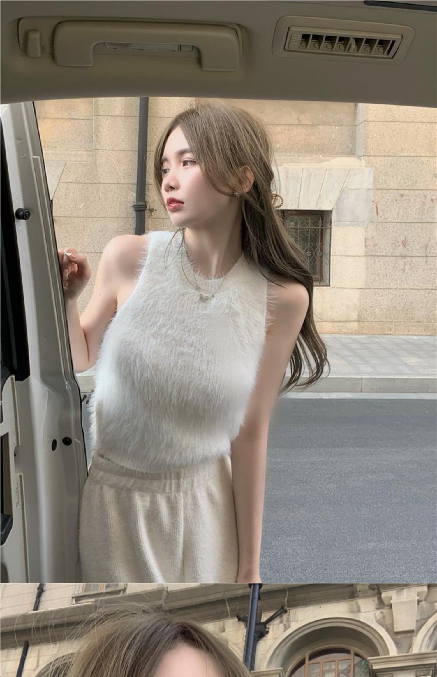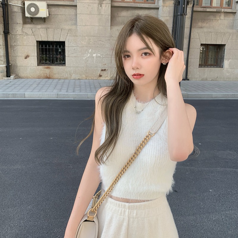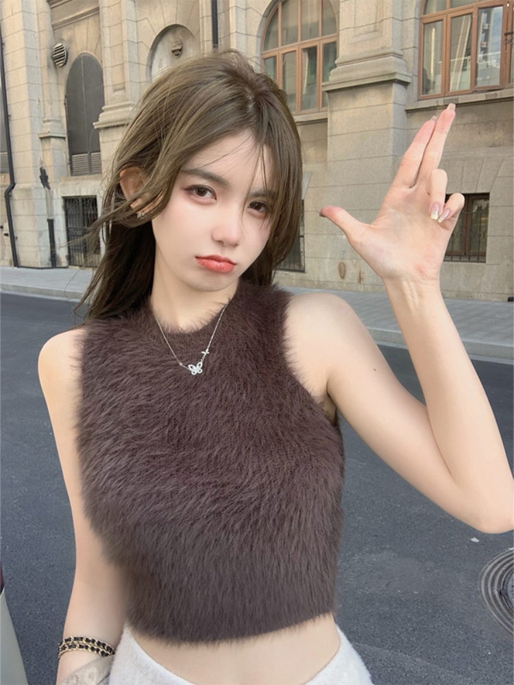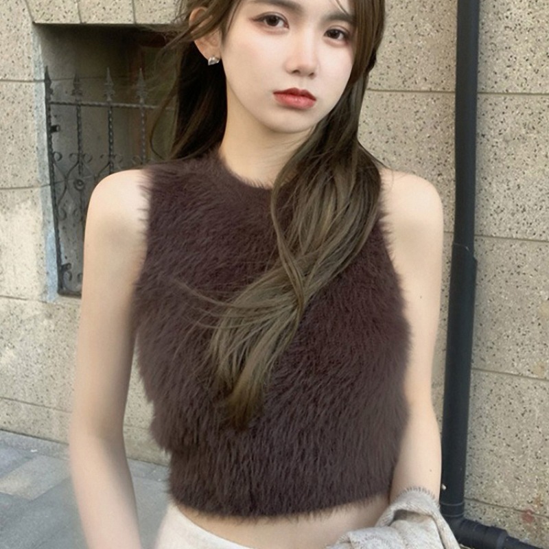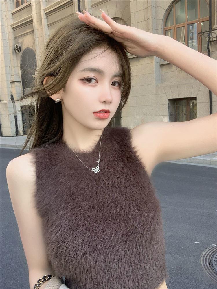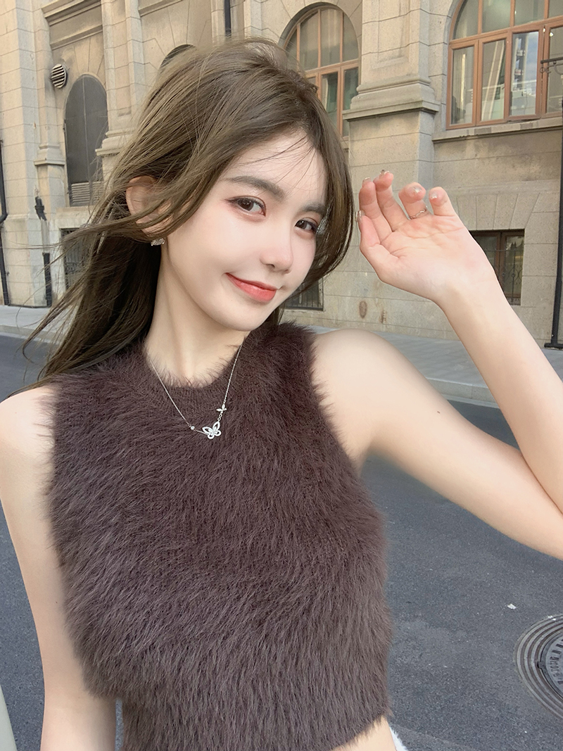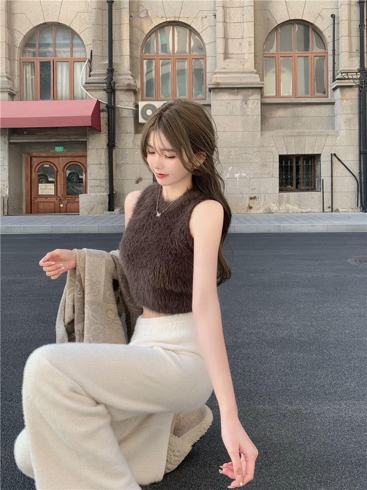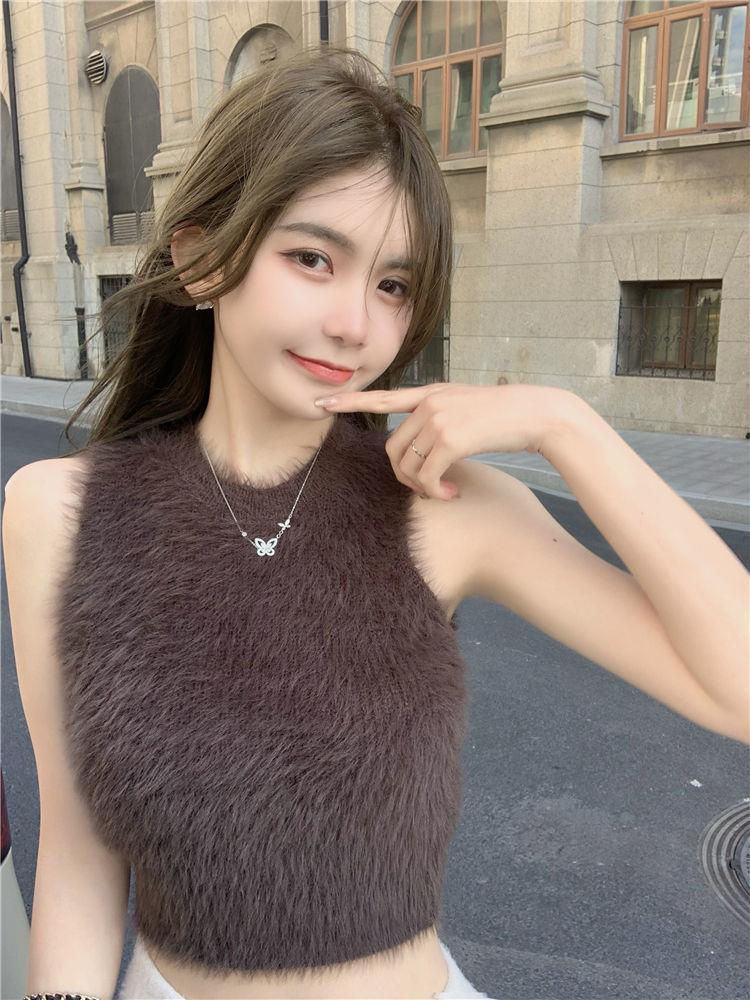 민소매 스웨터 여자 밍크 울 풀오버 조끼 가을 겨울철 쇼트 스타일 플리스 플러시 기본 셔츠 외출용 모방 fall 털
