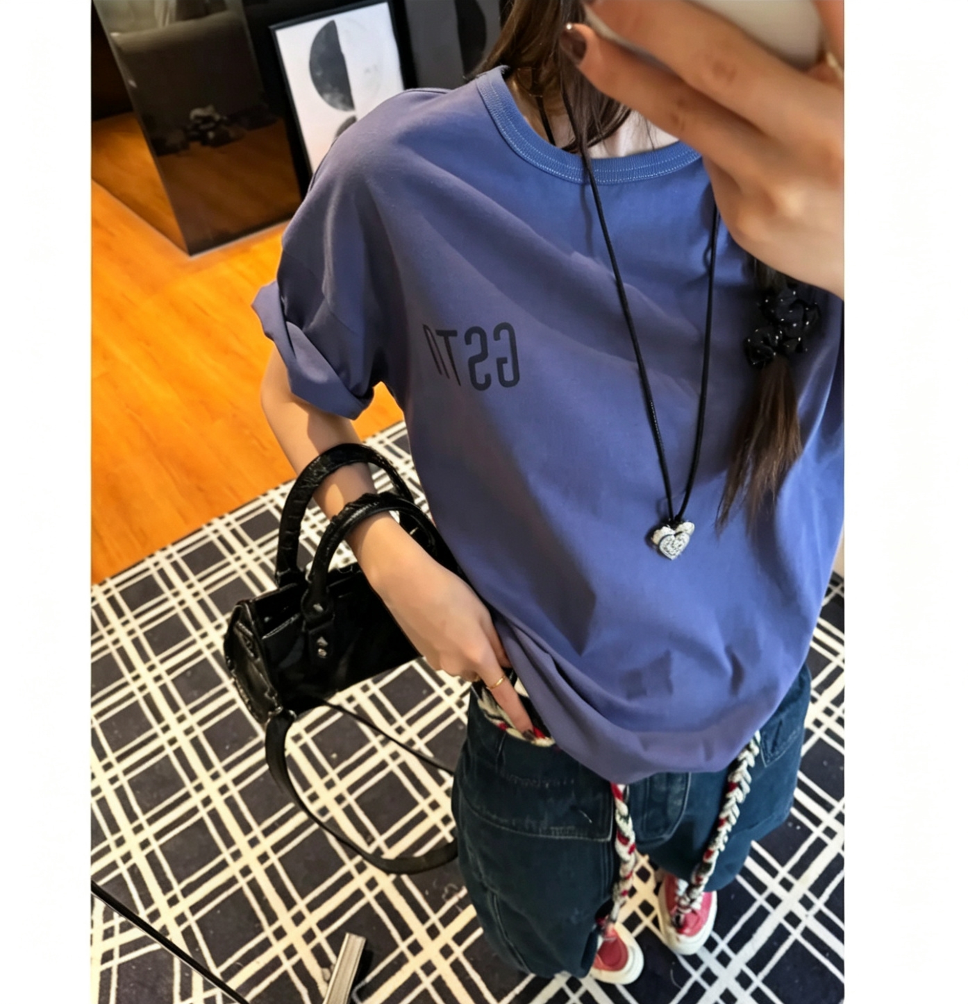 정의 스타일 여름 새로운 아메리칸 레트로 루즈핏 슬림해 보이는 라운드 넥 반팔 티셔츠 여성 zyt9548