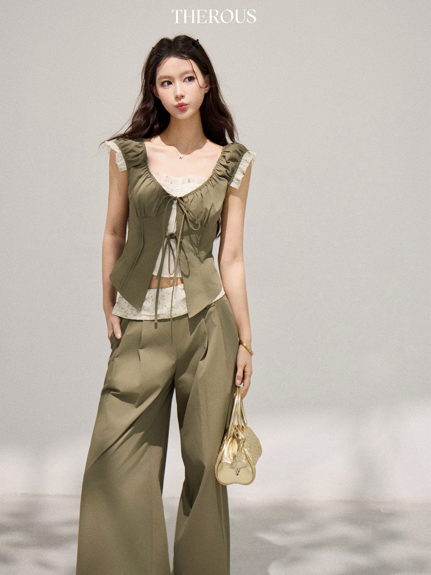 정가 재고 있음 한 부서 달콤한 스타일 보라색 자수 슬립 맨위 여성 품격 하이웨이스트 슬림해 보이는 와이드 레그 팬츠 세트