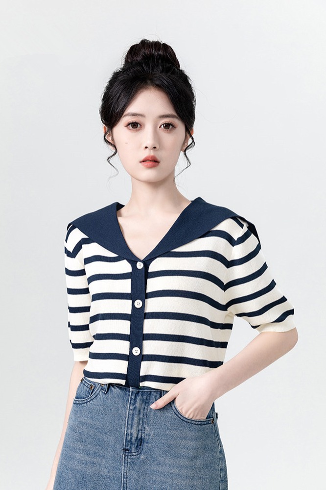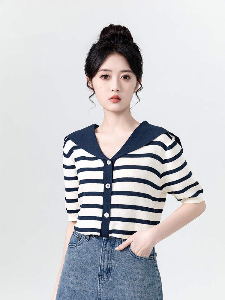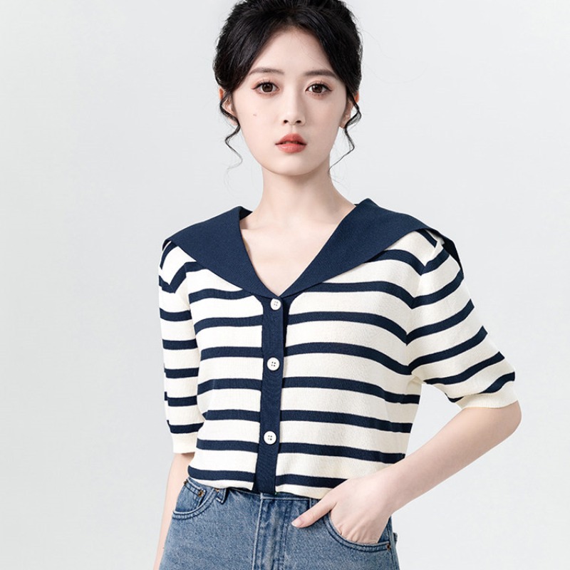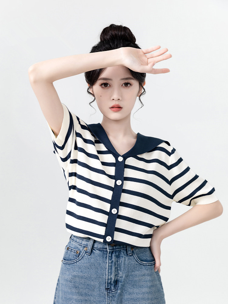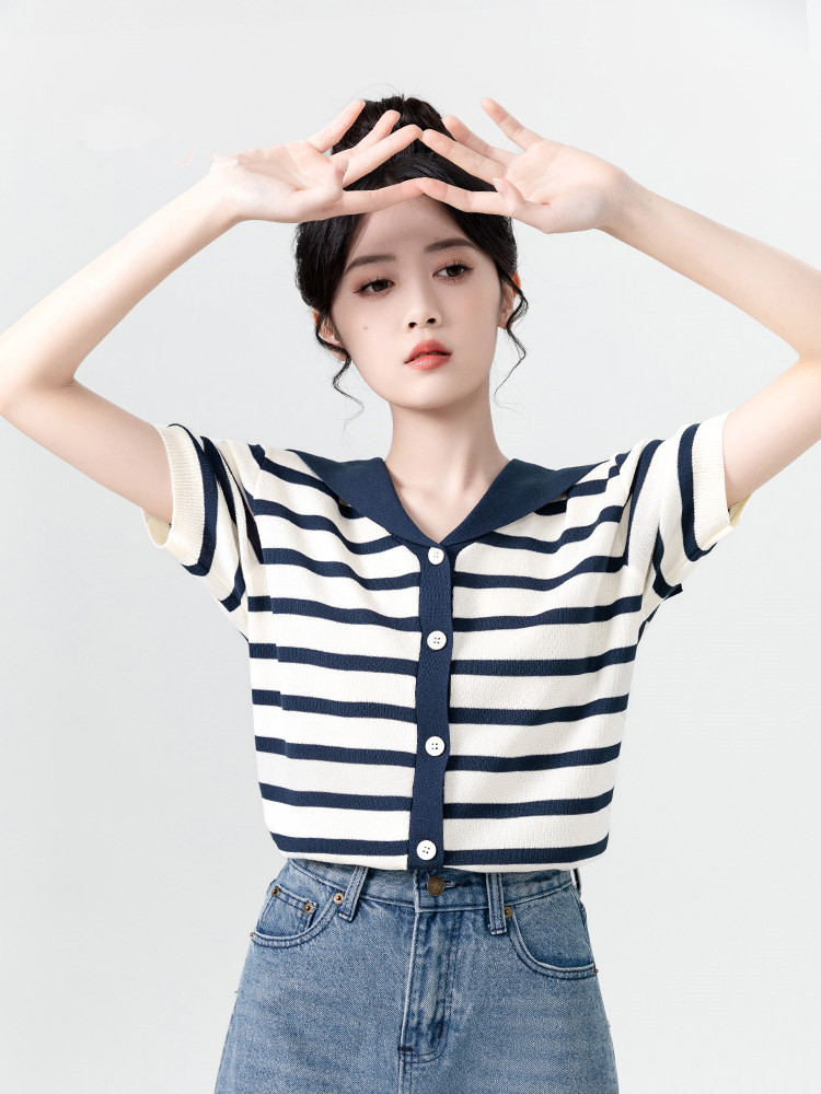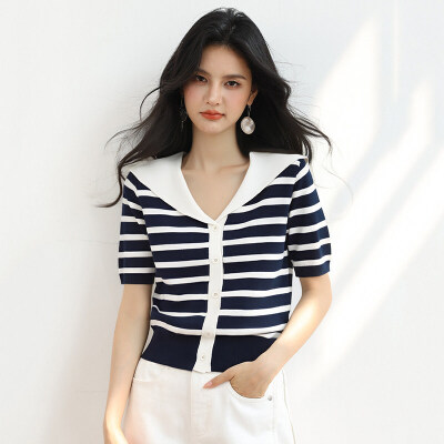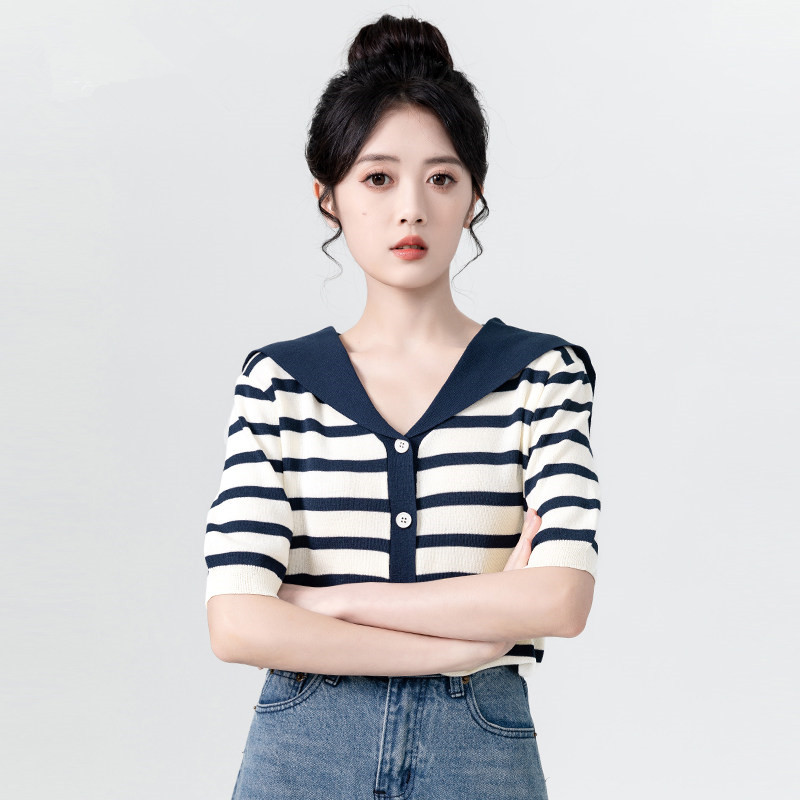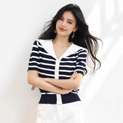 파란색 스트라이프 얼음 실크 니트 오픈 가디건 반팔 티셔츠 여성 여름 2026 새로운 해군 칼라 Chic 얇은 스타일 맨위