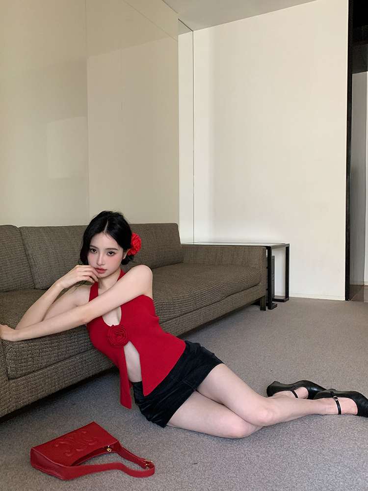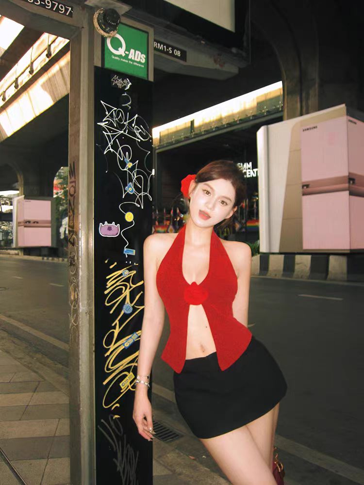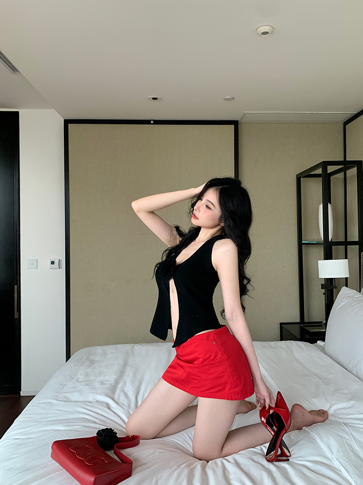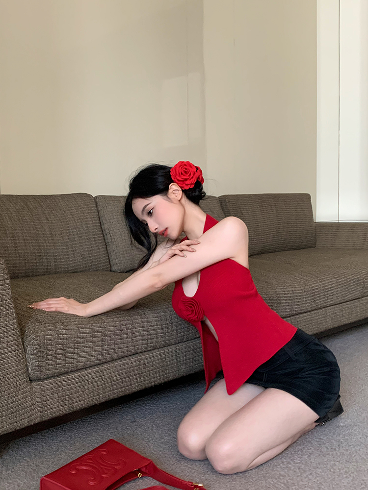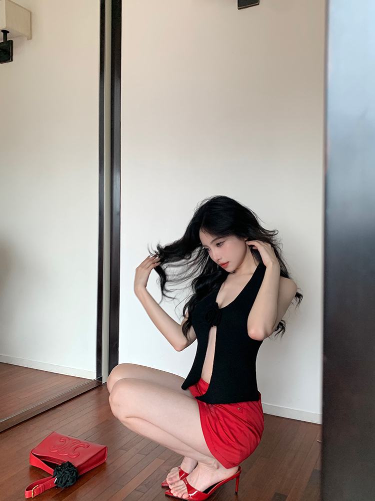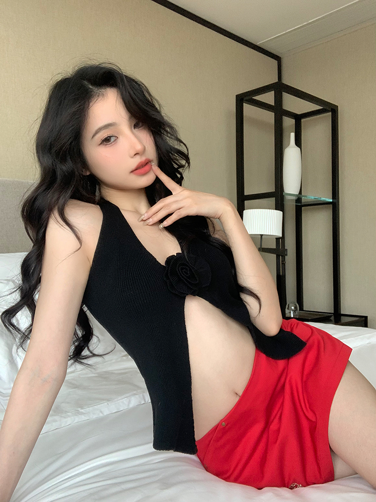 원 3206 백리스 티셔츠 여성 여름 섹시함 달콤함 몸매 가꾸기 심장 기계 작은 대중 민소매 외출용 조끼 V넥 얼음 차가운 실크