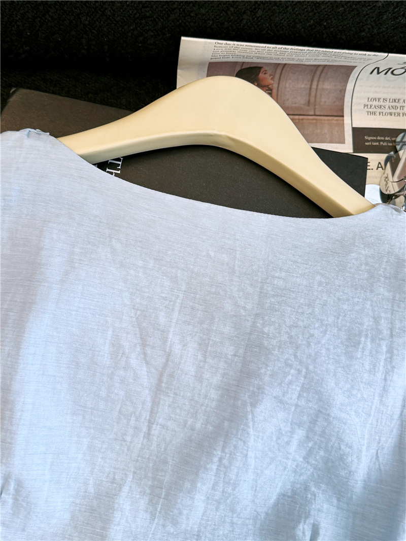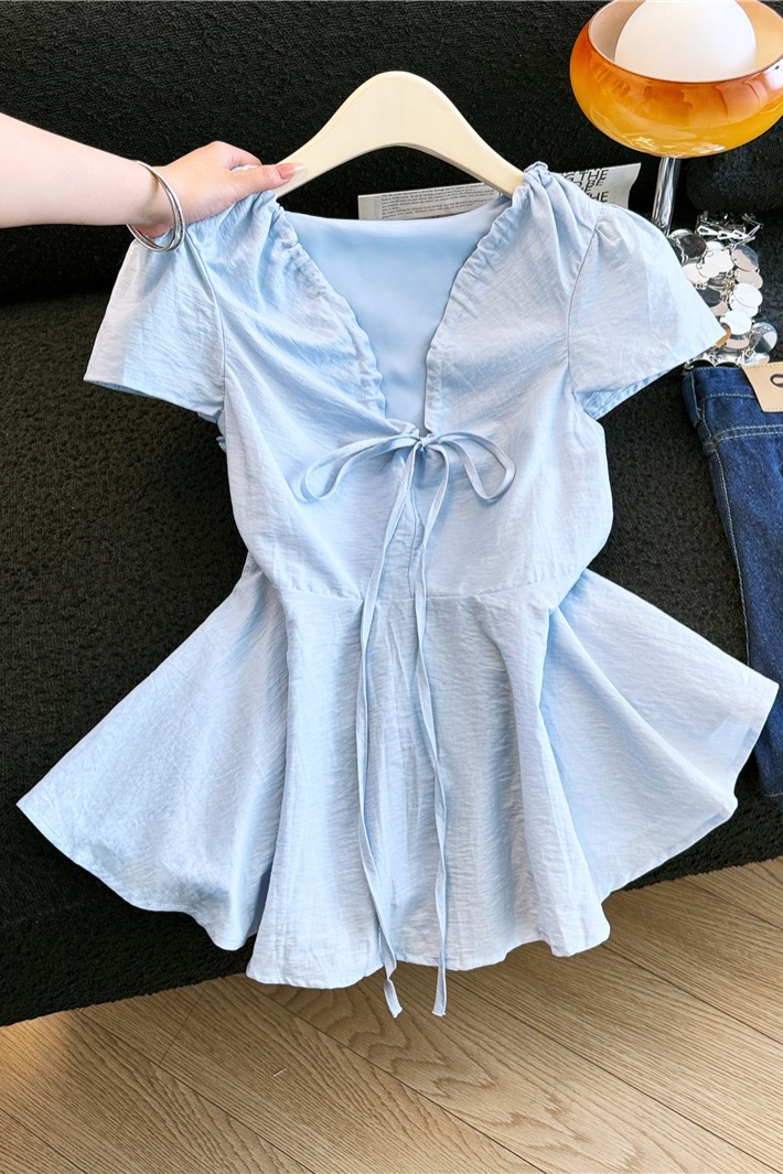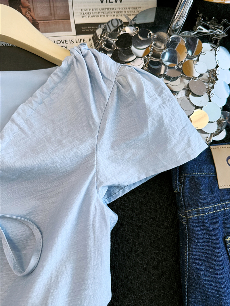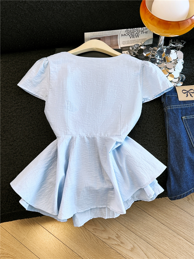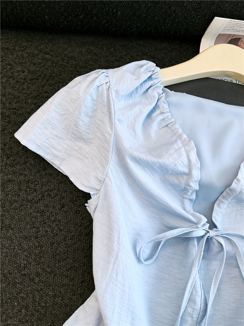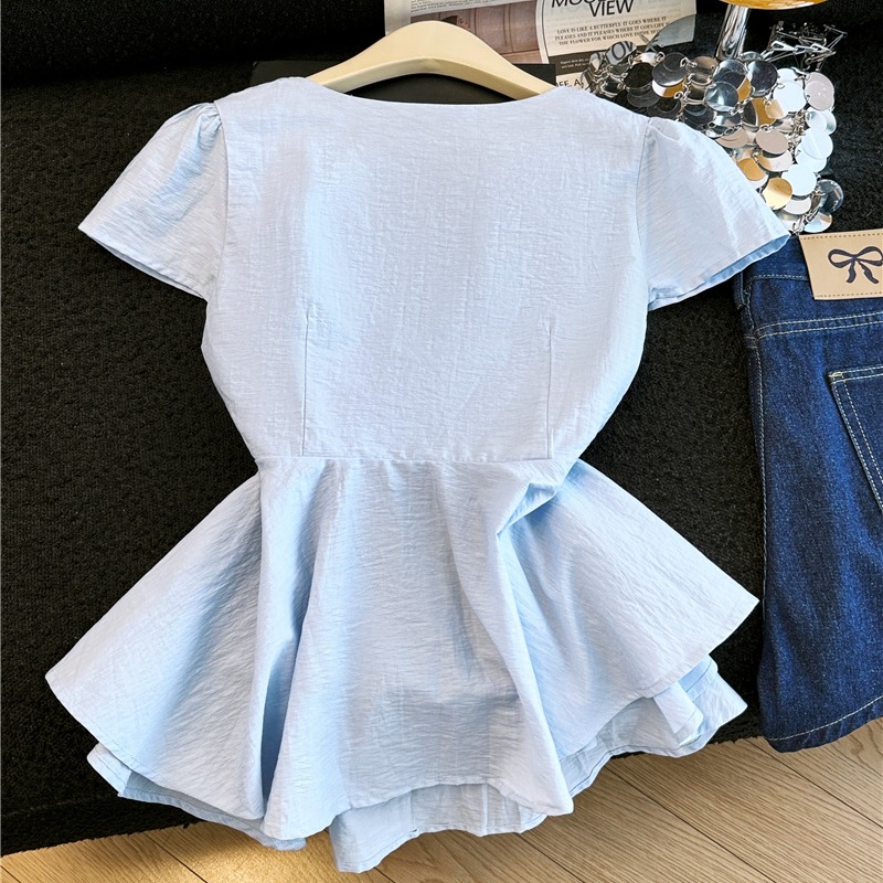 한국 스타일 패션 파란색 V넥 거품 소매 반팔 여성 셔츠 여름 고유 한 아름다운 허리 수축 슬림해 보이는 출퇴근 작은 셔츠