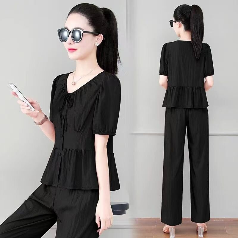 빅 사이즈 한국 스타일 패션 V넥 셔츠 허리밴드 캐주얼 긴 바지 세트 여성 여름 새로운 와이드 레그 팬츠 투피스 세트