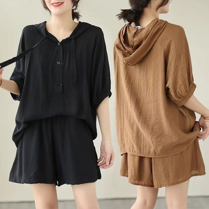 빅 사이즈 패션 세트 여성 여름 루즈핏 후드 반팔 맨위 표지 고기 슬림해 보이는 반바지 지방 mm 두 조각 여성 세트 트렌디