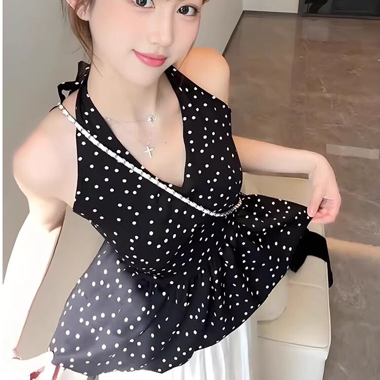 도트 무늬 쉬폰 불규칙 캐미솔 외출용 여름 아름다움 뒤로 인사이드 가져 가라. 섹시함 행침 목 백리스 민소매 맨위