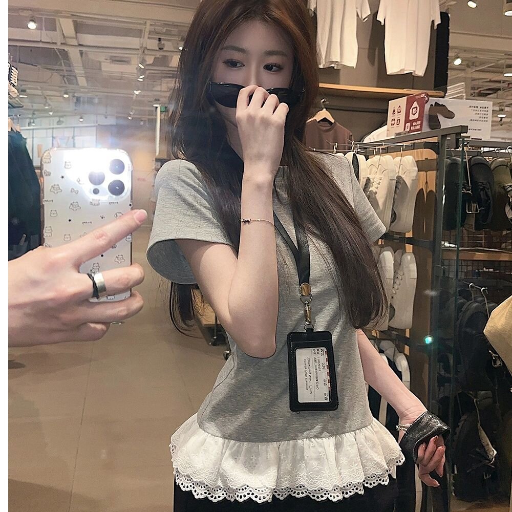 디자인 센스 화이트 레이스 조각 긍정적 인 어깨 반팔 티셔츠 여성 봄 여름 새로운 몸매 가꾸기 슬림해 보이는 Chic 레이스 맨위