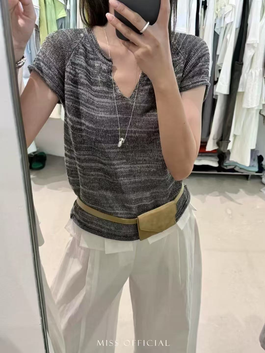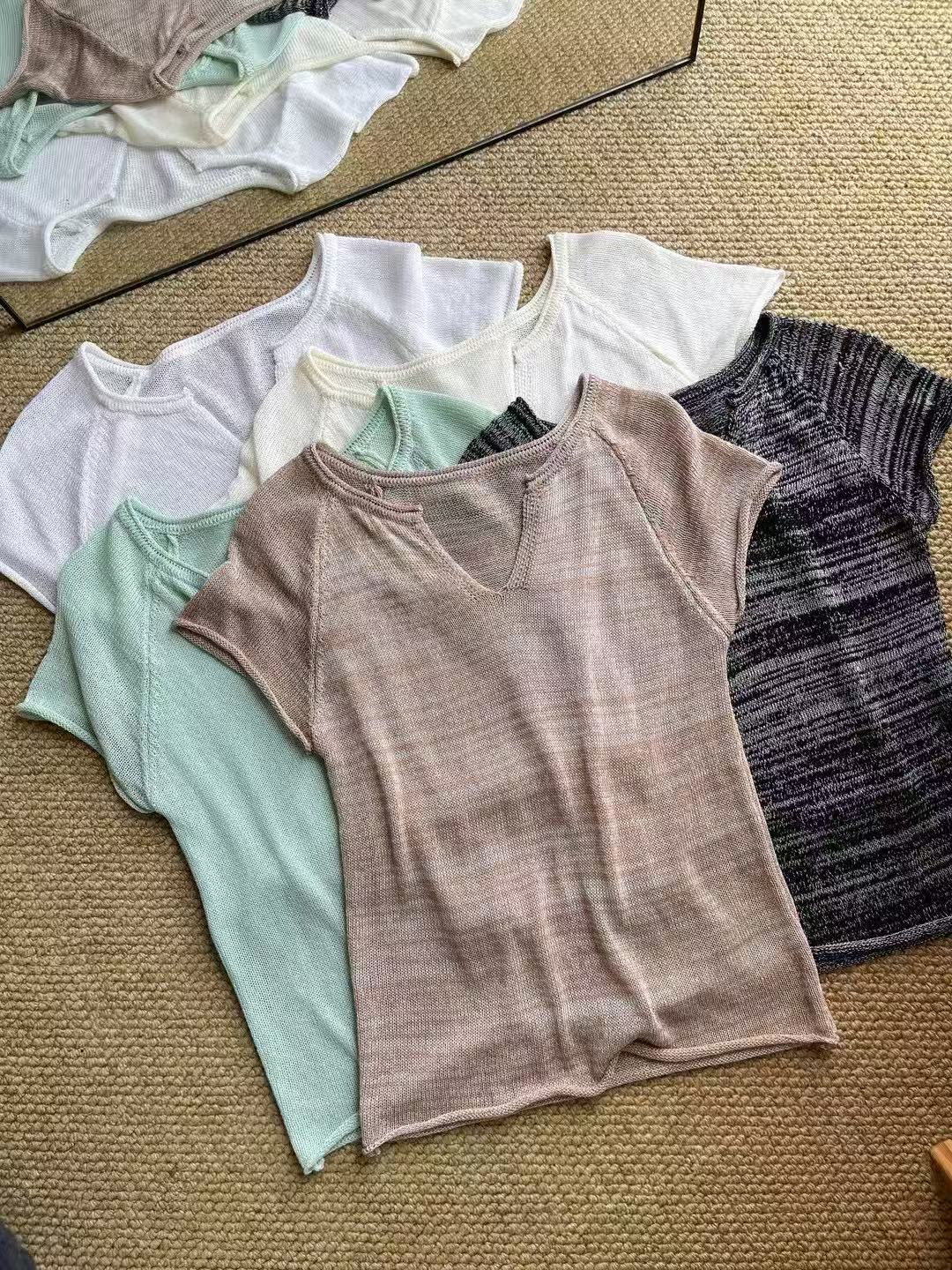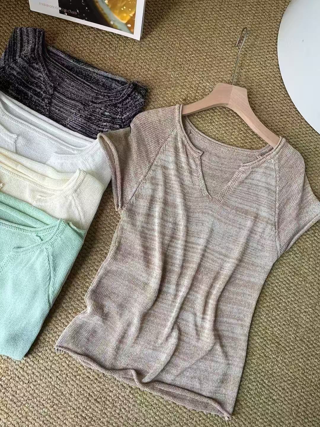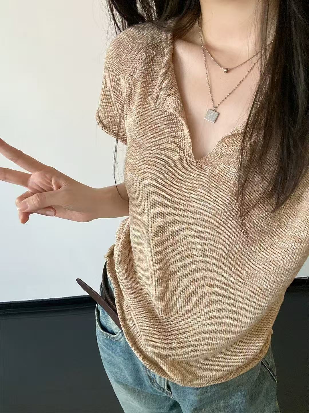 V넥 반팔 니트 스웨터 여성 배색 얇은 스타일 루즈핏 슬림해 보이는 다용도 니트 맨위 다용도 연령 감소 얼음 실크 셔츠 티셔츠