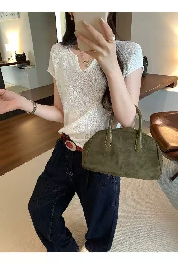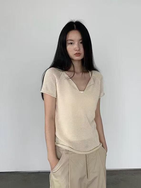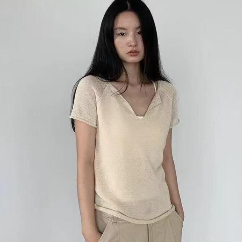 한 부서 얇은 스타일 V넥 반팔 티셔츠 여성 이른 봄 느긋한 품격 슬림해 보이는 다용도 캐주얼 맨위 트렌디