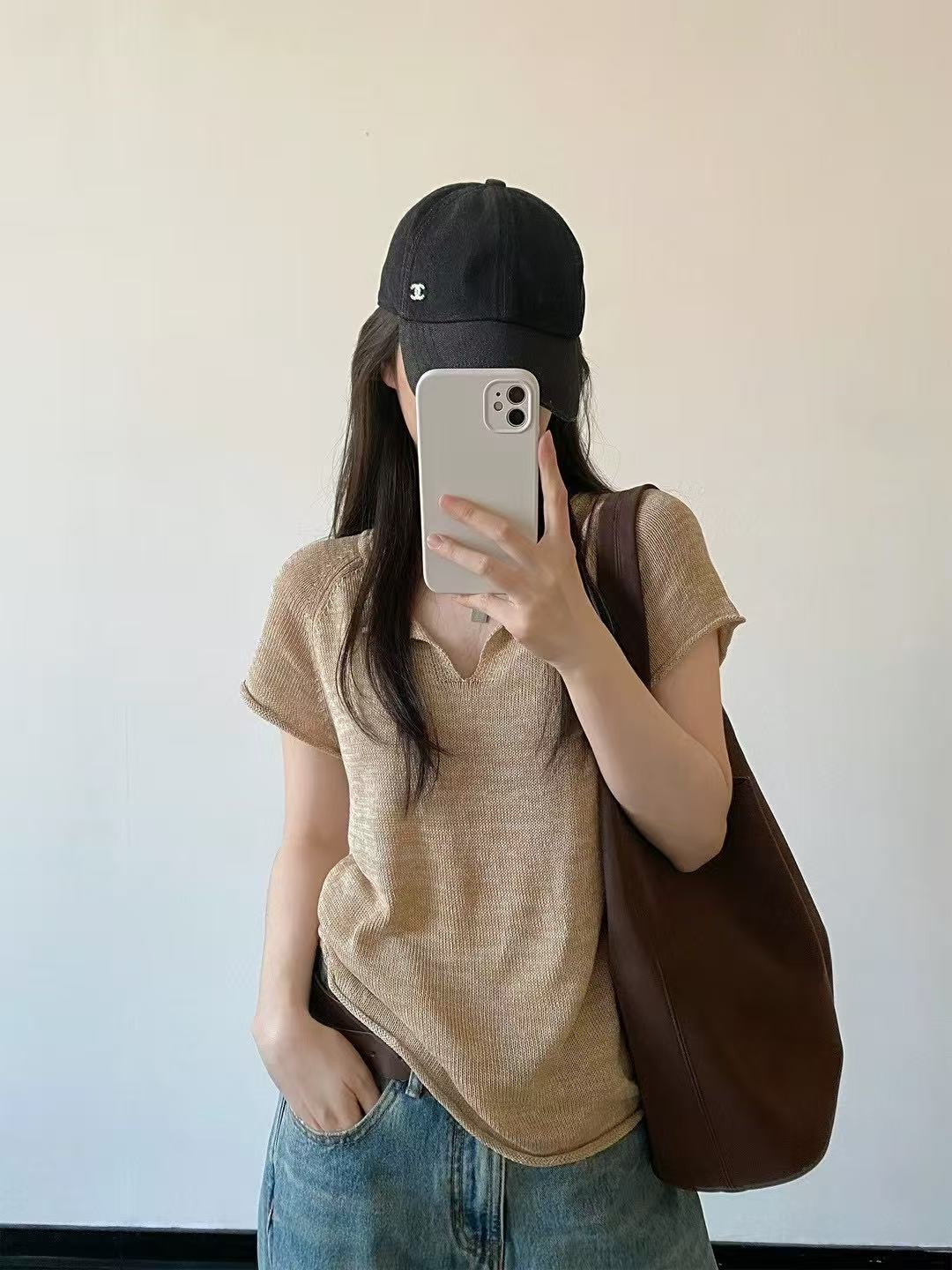 실사 프랑스식 해군 칼라 V넥 얼음 실크 니트 반팔 티셔츠 여성 여름 배색 민소매 조끼 몸매 가꾸기 숄 맨위