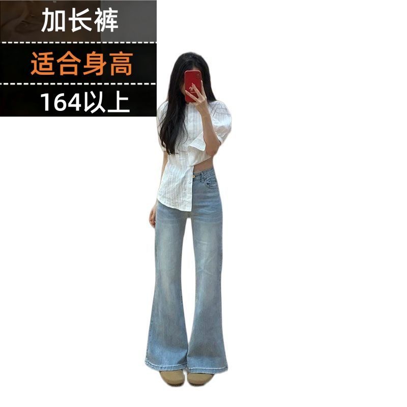 외국 가스 높음 거리 카키 색 마이크로 플레어 바지 아메리칸 레트로 자르기 봄 여름 새로운 몸매 가꾸기 품격 데님 긴 바지