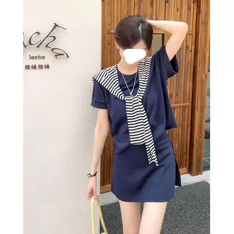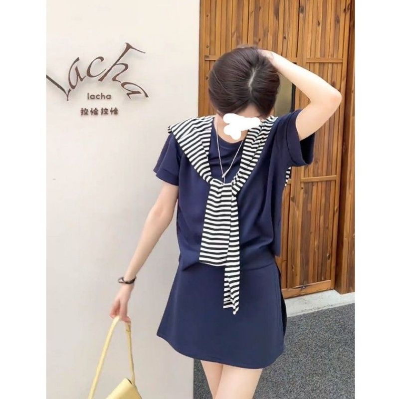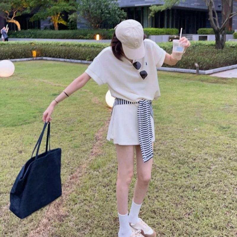 여름 운동 패션 세트 여성 느긋한 바람 스트라이프 숄 루즈핏 반팔 티셔츠 하이웨이스트 짧은 치마바지 3종 세트