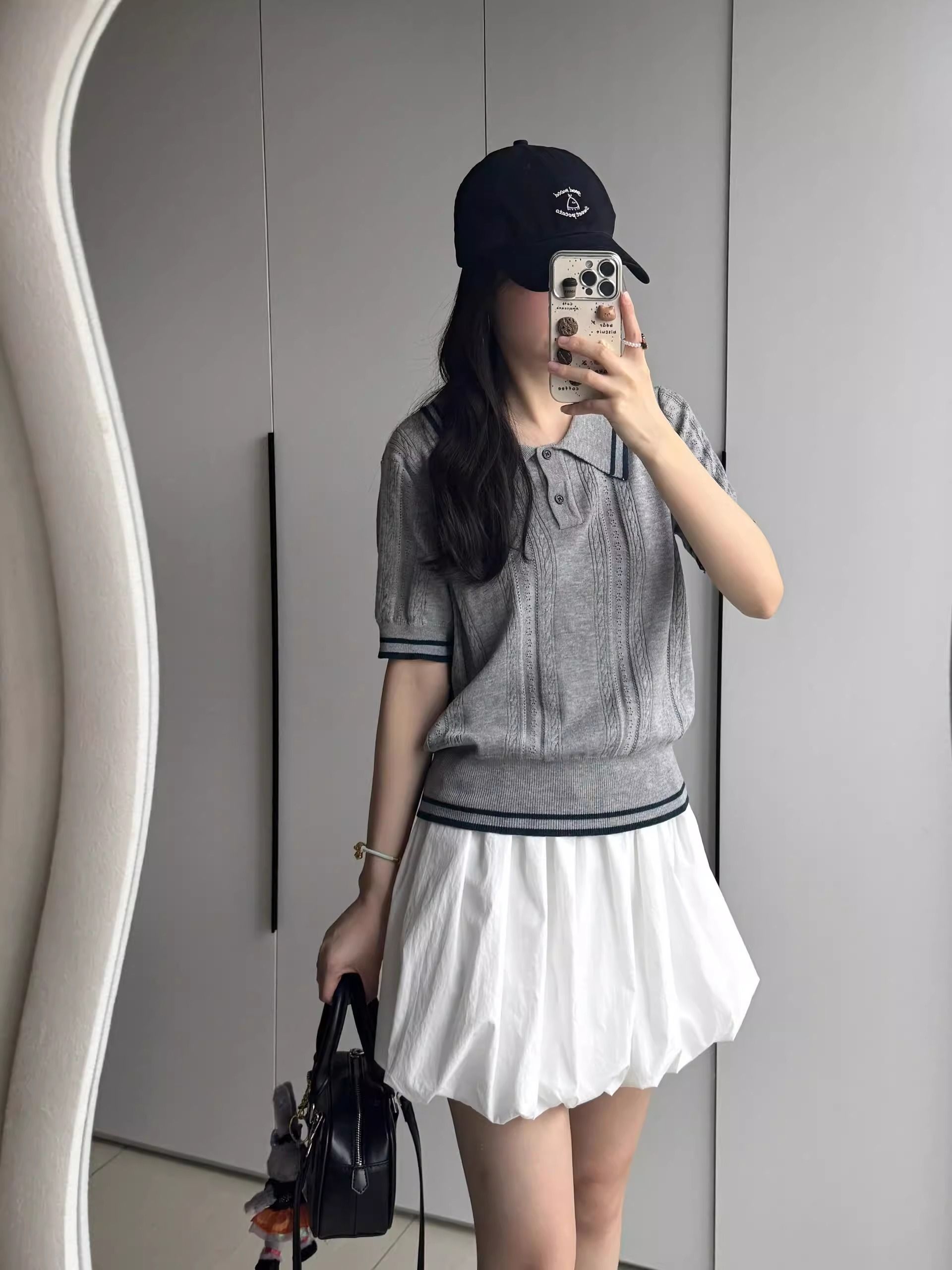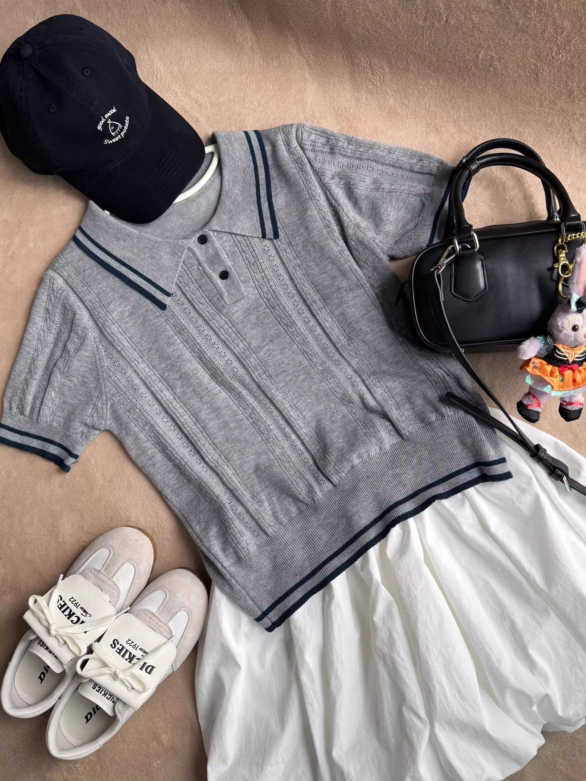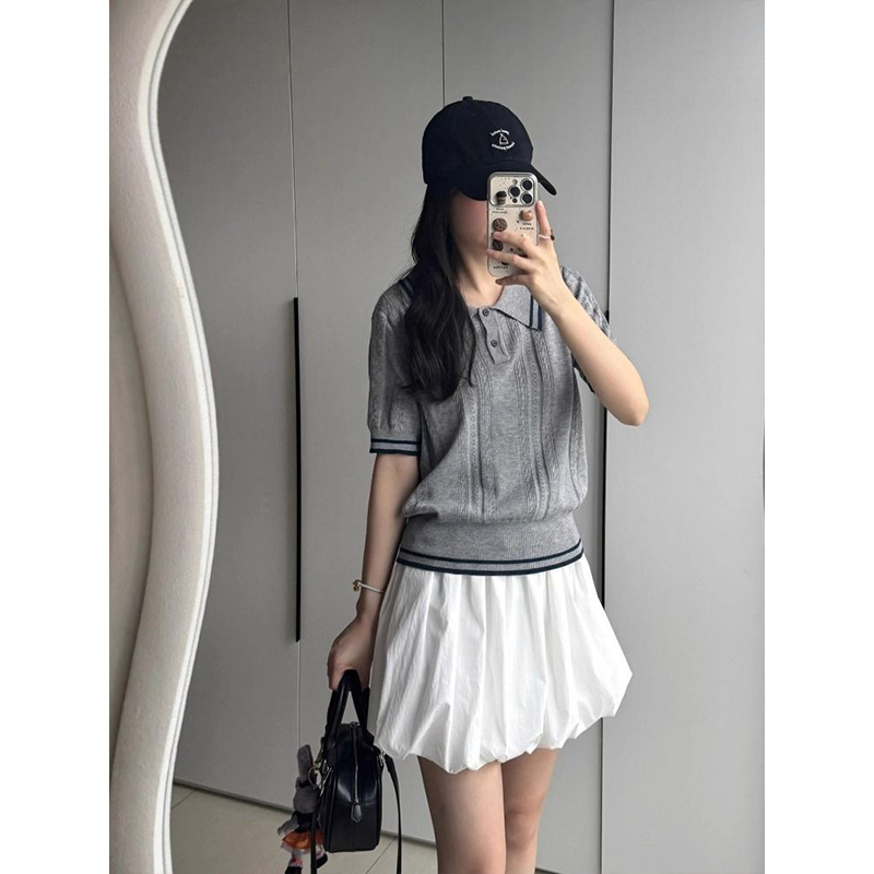 한 부서 학원 스타일 배색 POLO 칼라 스트라이프 니트 반팔 여성 화이트 미니 스커트 투피스 세트