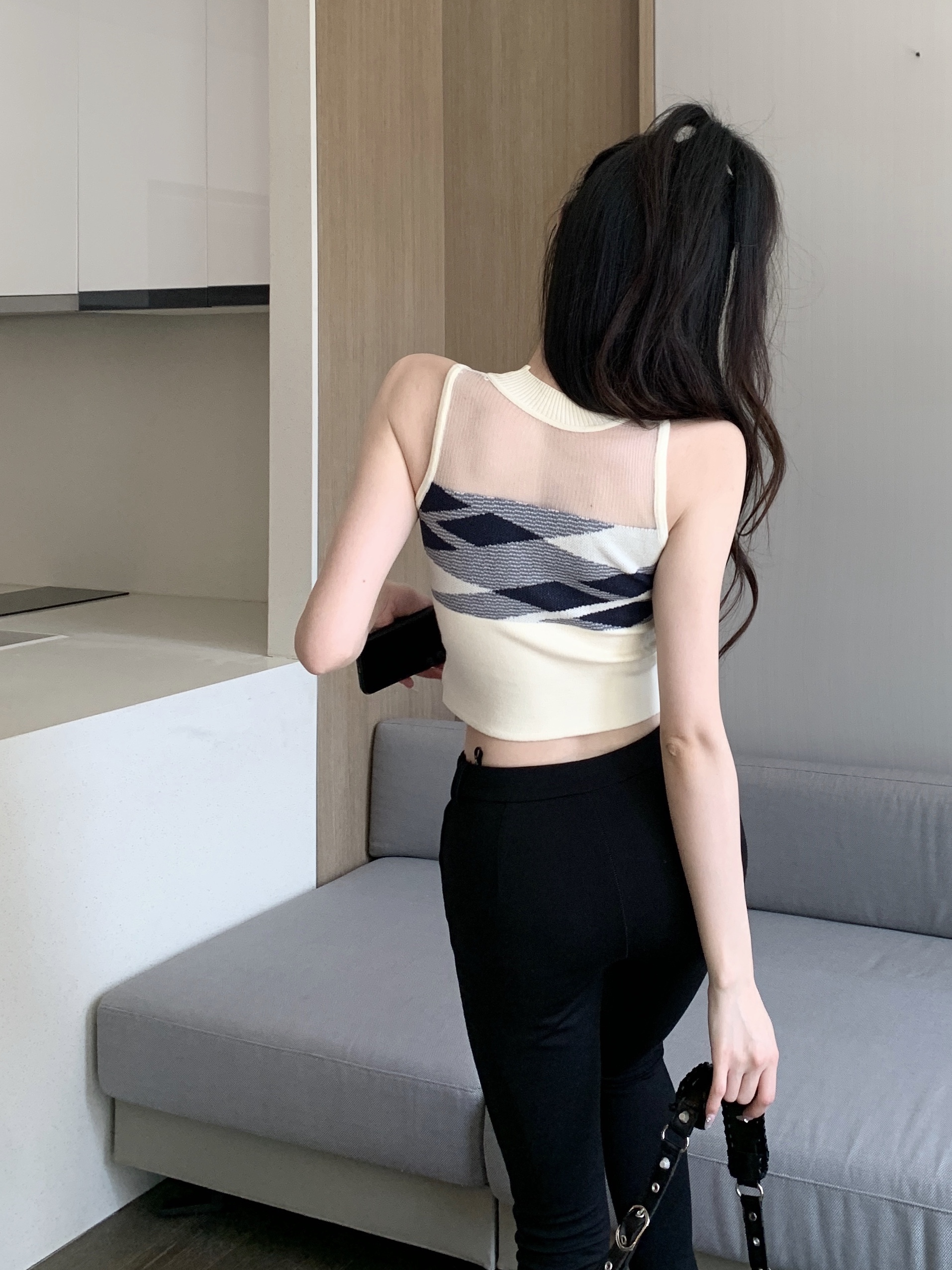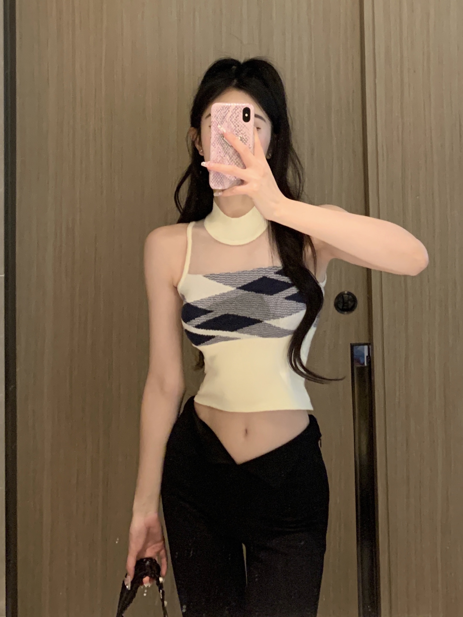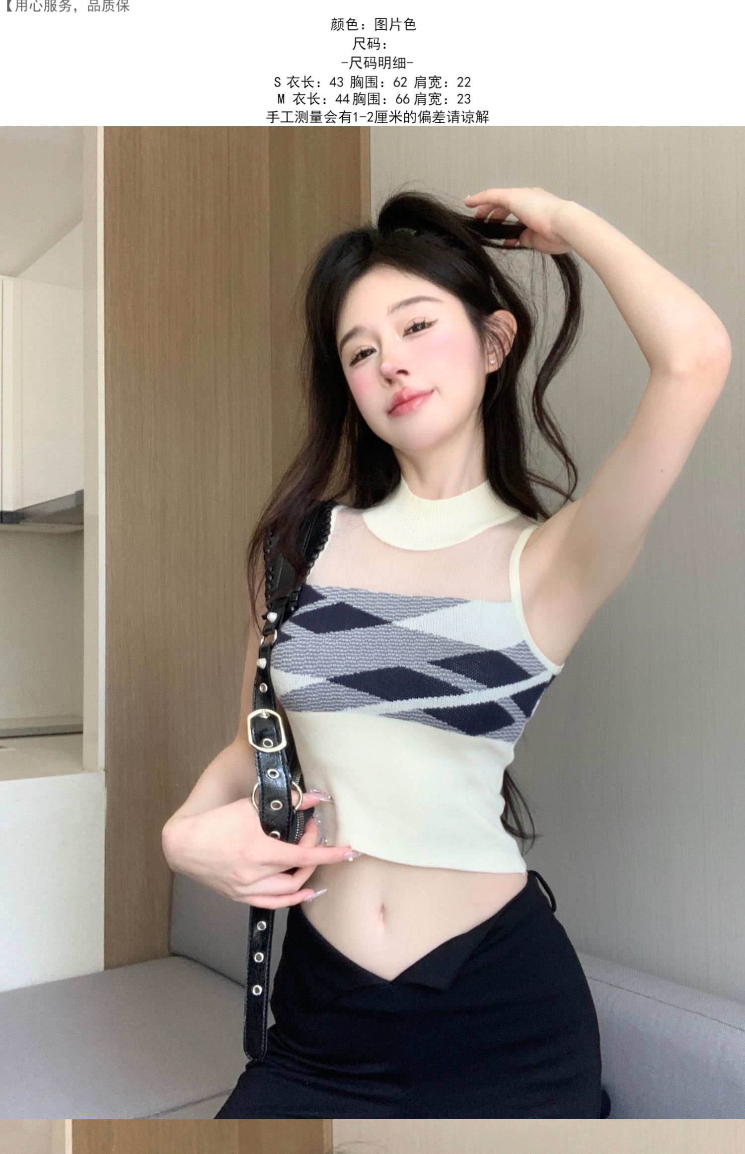 달콤한 핫걸 섹시함 아메리칸 홀로우 아웃 니트 조끼 여성 인사이드 가져 가라. 외출용 민소매 쇼트 스타일 얼음 차가운 실크 유럽 오간자