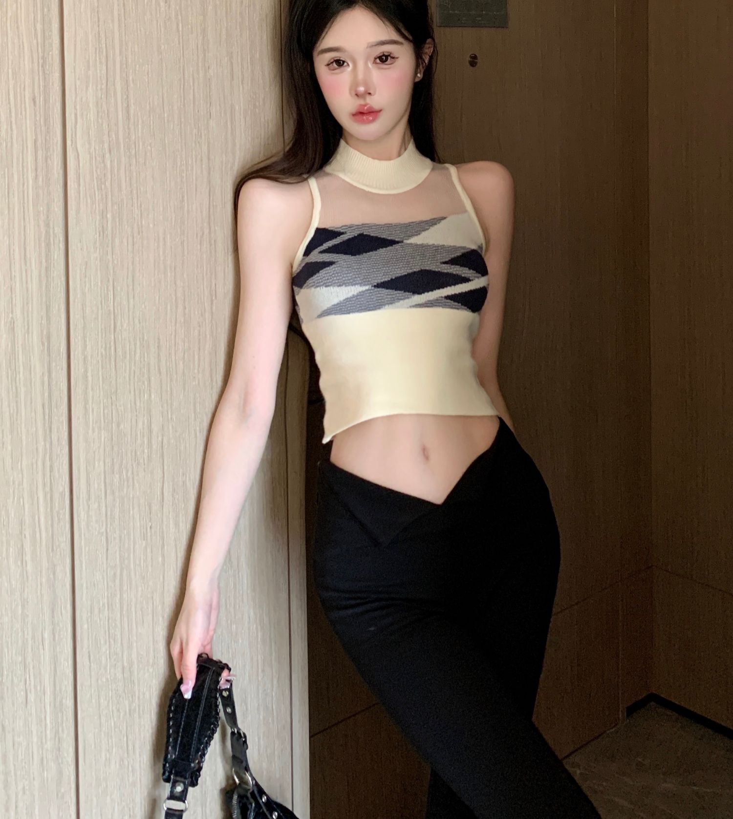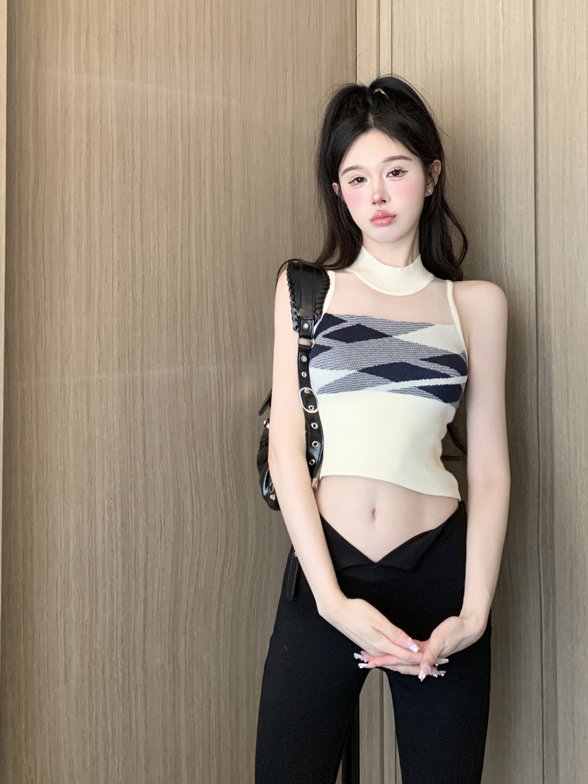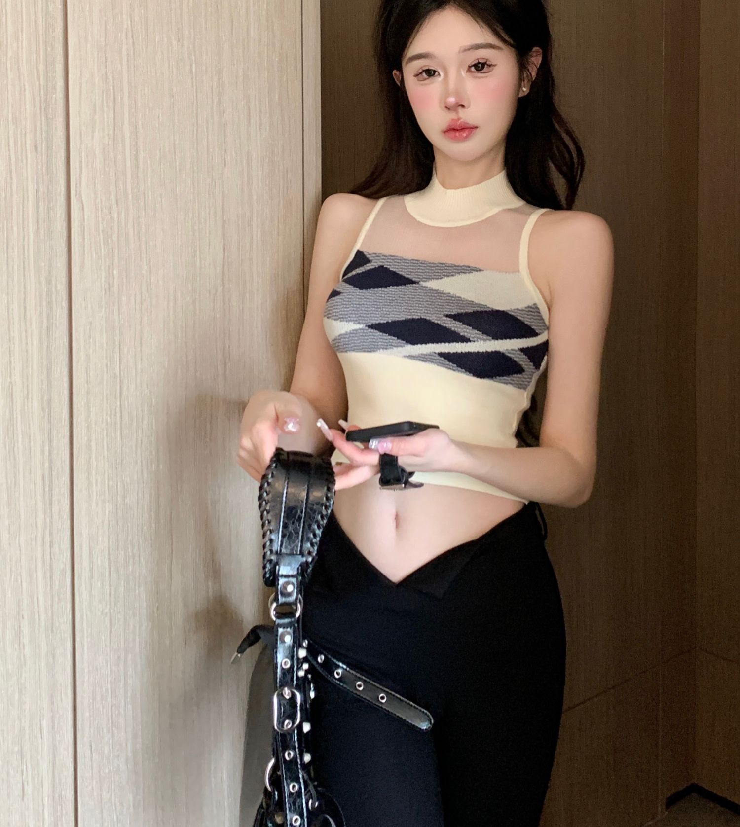 달콤한 핫걸 섹시함 아메리칸 홀로우 아웃 니트 조끼 여성 인사이드 가져 가라. 외출용 민소매 쇼트 스타일 얼음 차가운 실크 유럽 오간자