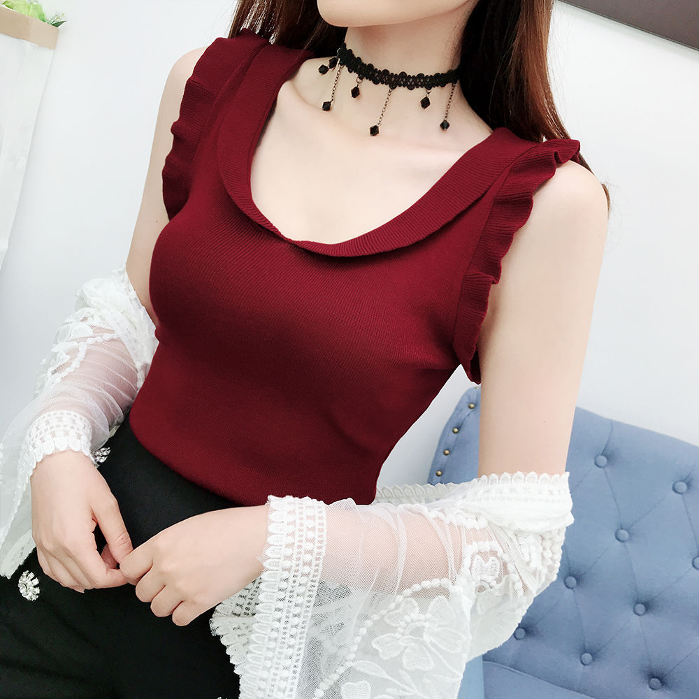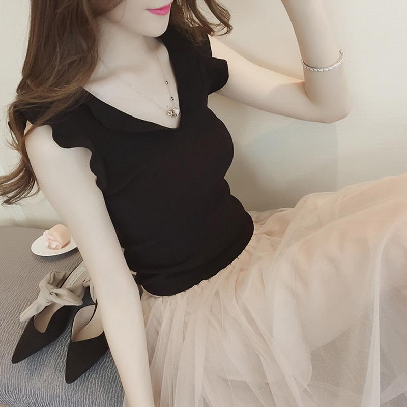 달콤한 핫걸 섹시함 아메리칸 홀로우 아웃 니트 조끼 여성 인사이드 가져 가라. 외출용 민소매 쇼트 스타일 얼음 차가운 실크 유럽 오간자