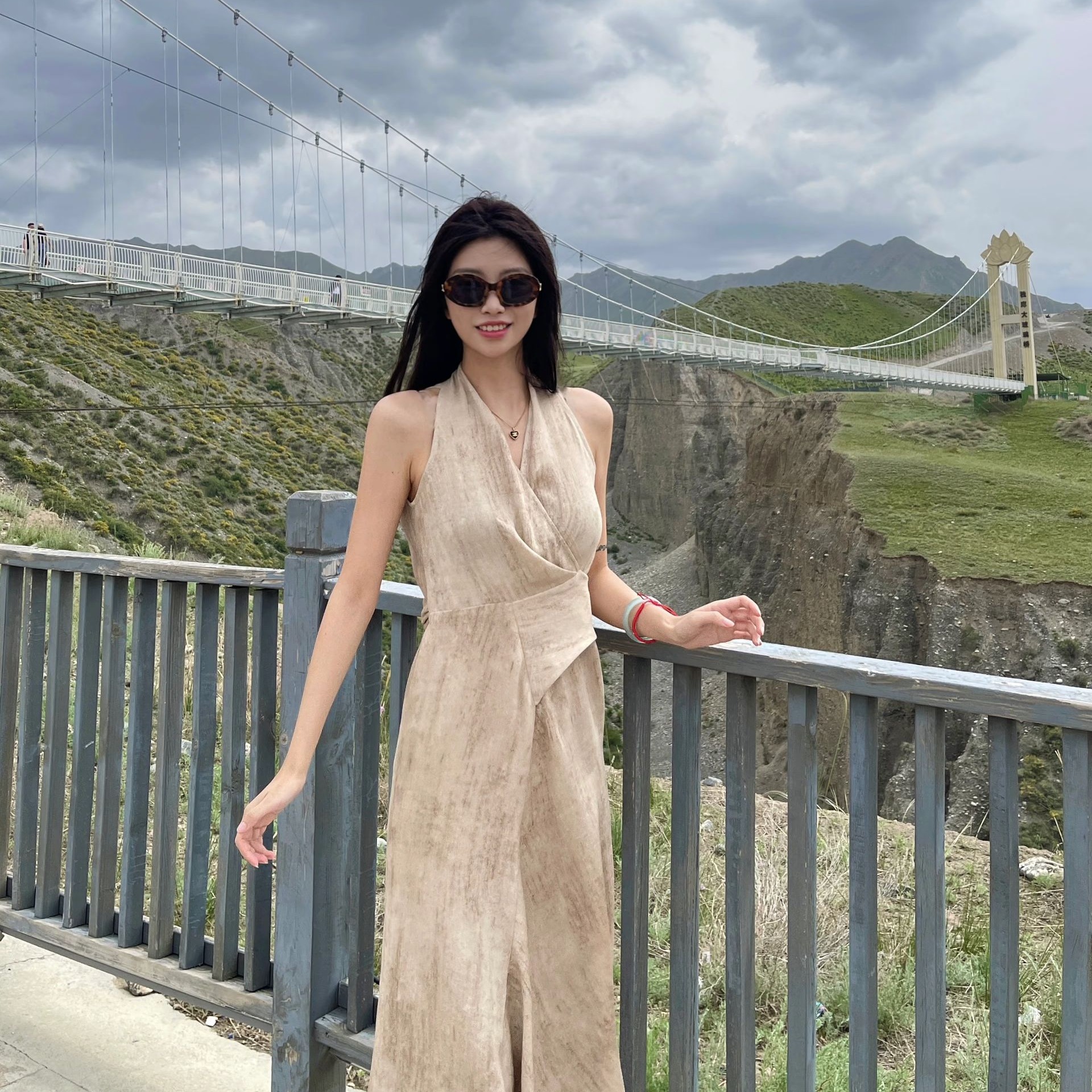 검은 콩 흠 프라임 시간 헤일로 면 린넨 튀김 색상 V넥 행침 목 여성 드레스 여름 허리 수축 레이스업 민소매 롱 스커트