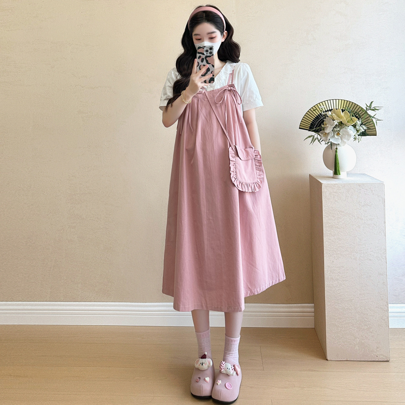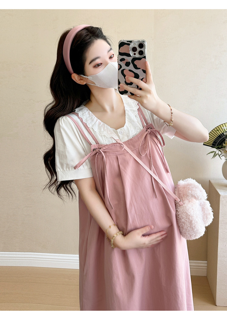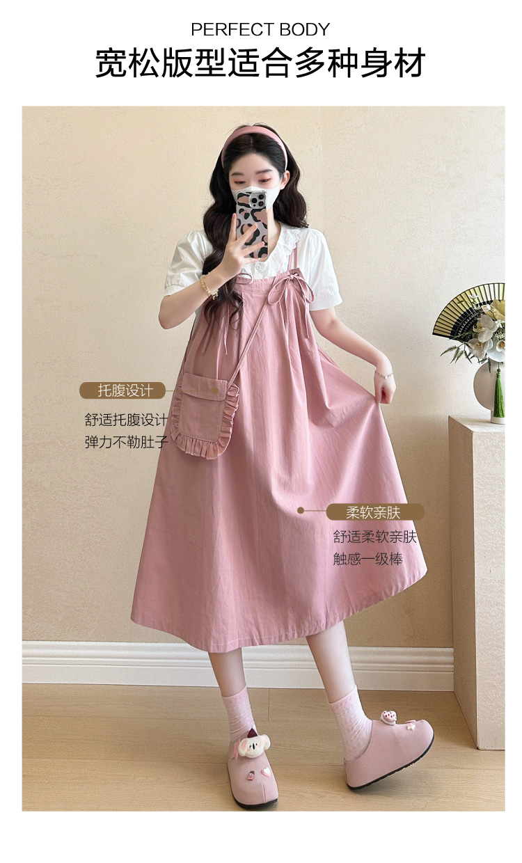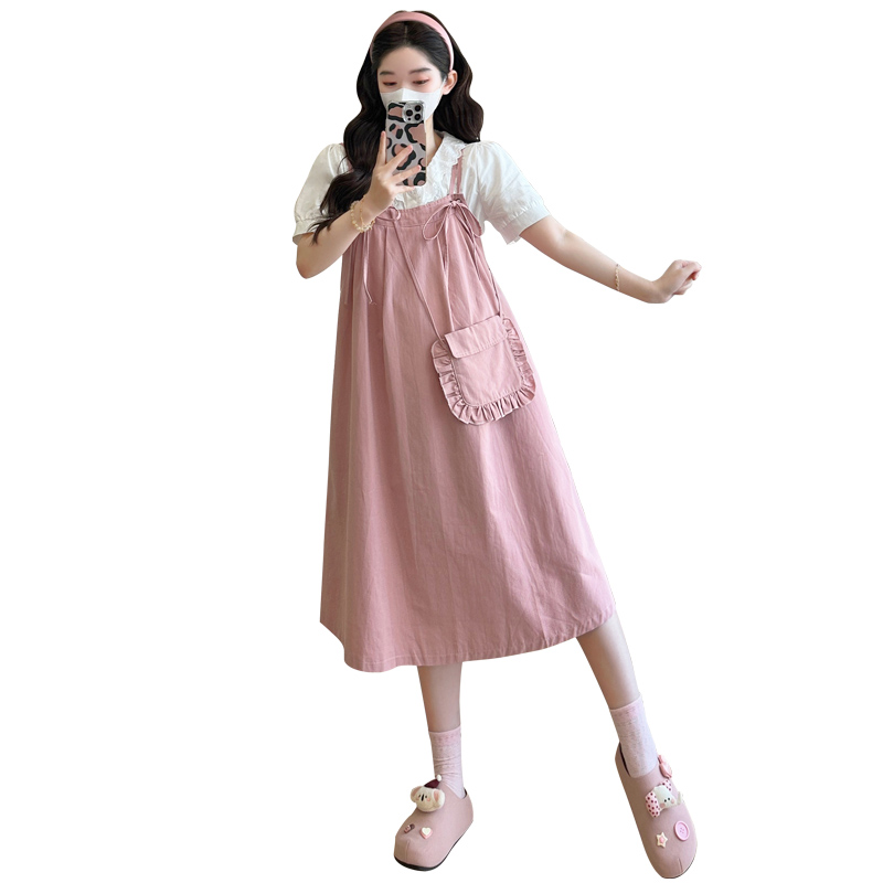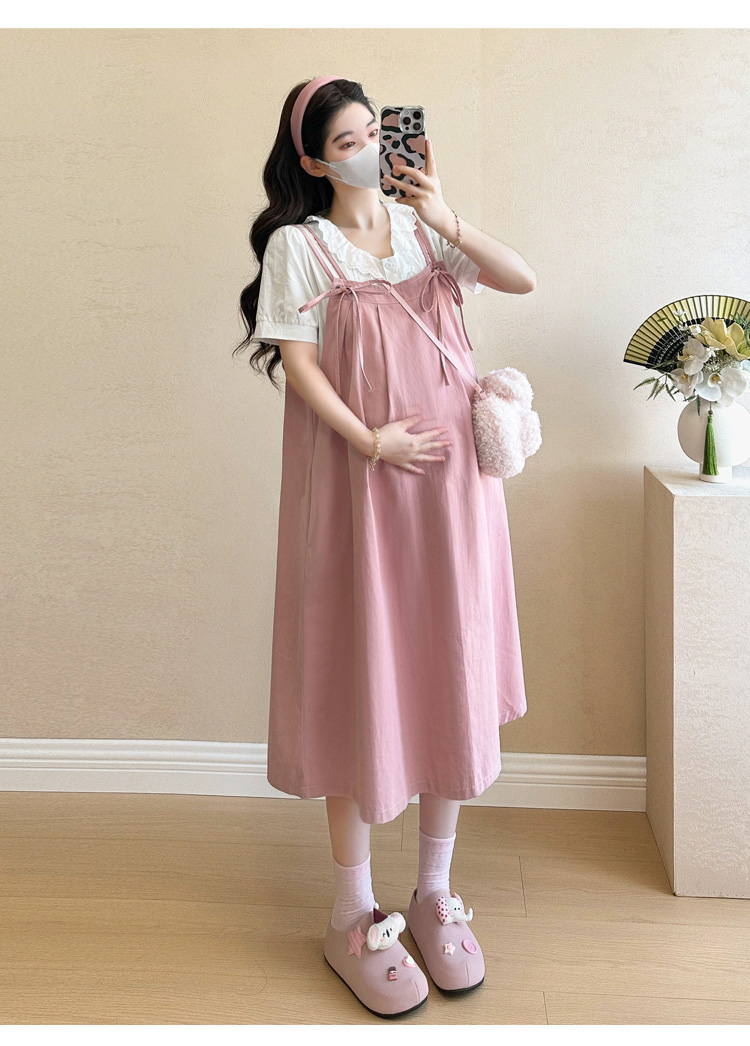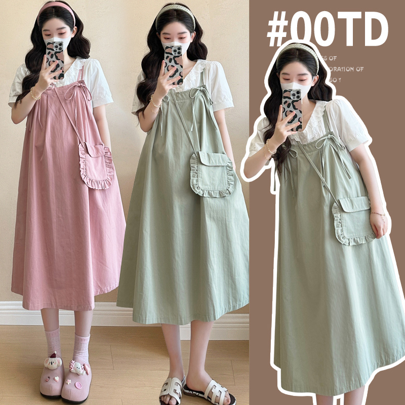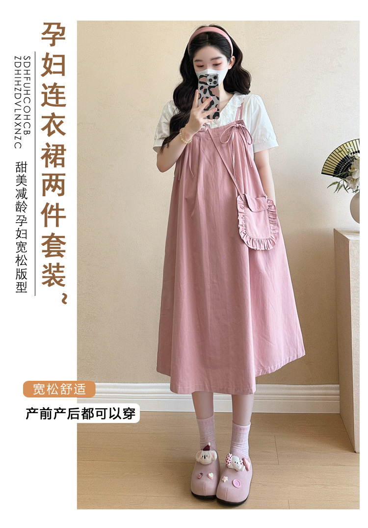 실사 빅 사이즈 출산 착용 순면 임산부 멜빵 스커트 순면 셔츠 투피스 세트 한국 스타일 임산부 세트
